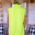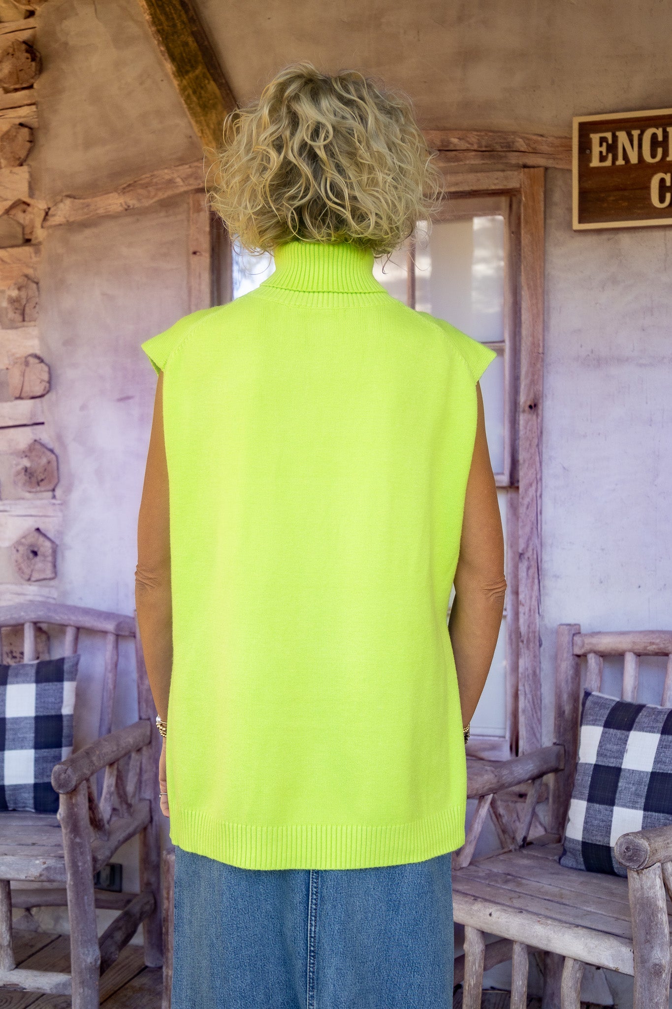 This citrine sleeveless turtleneck sweater brings a fun twist with its shorter front and longer back hem. Its sunny hue brightens your look while the sleek turtleneck adds a cozy touch without the bulk. Perfect for layering or wearing solo, it keeps you cool and stylish all day long.