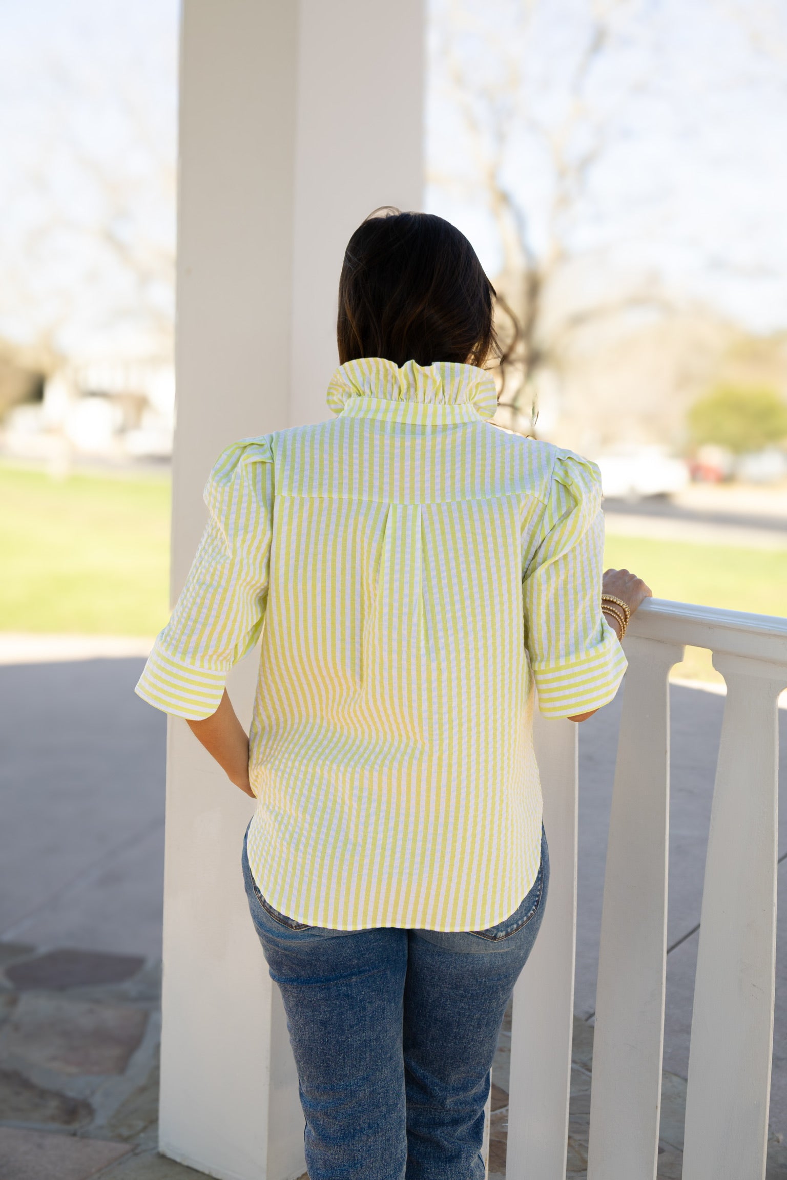 Add some whimsy to your wardrobe with our Lime Seersucker Top. With its playful light green seersucker fabric and fun ruffled collar, this top is perfect for any occasion. Stay stylish and comfortable with this unique piece.