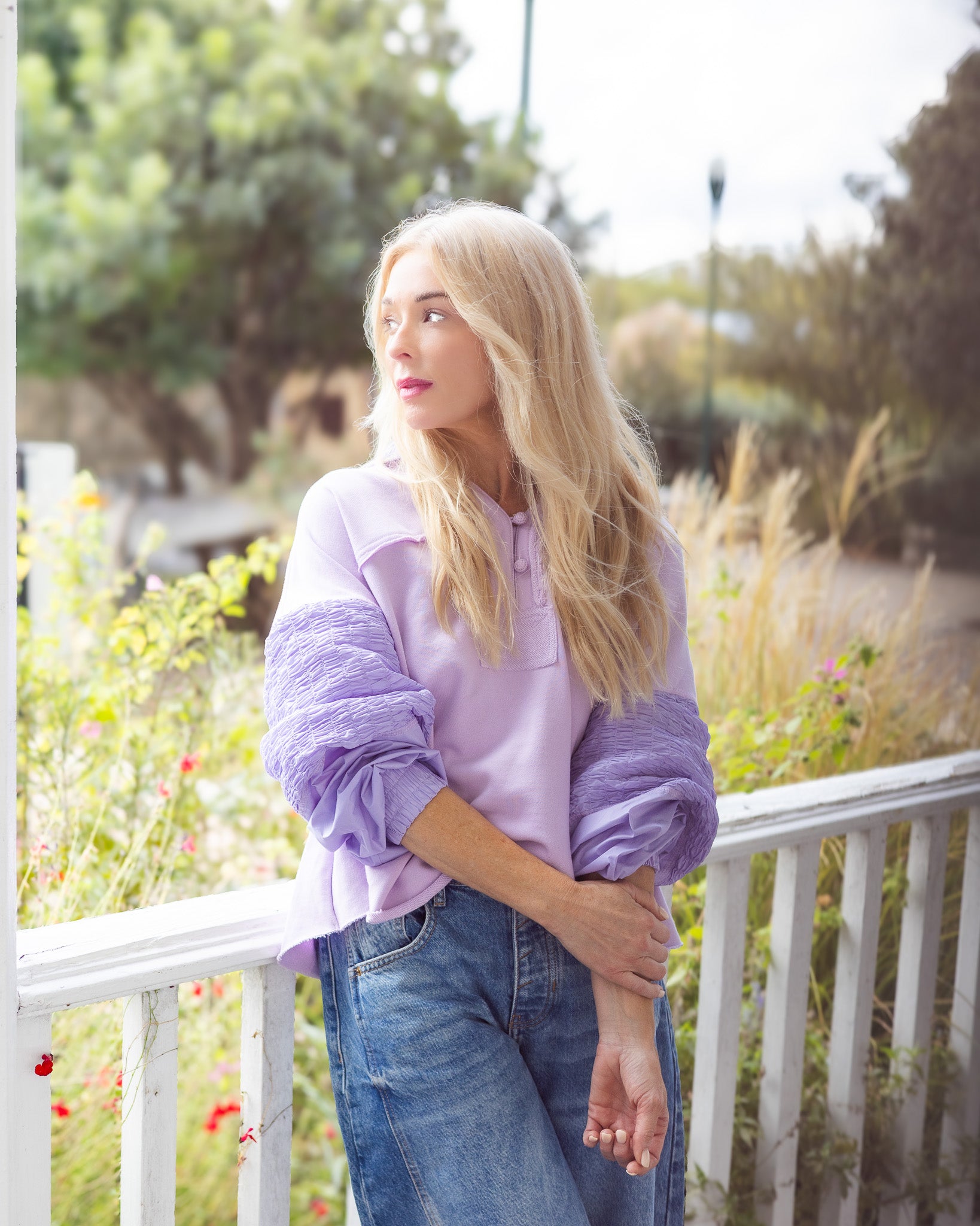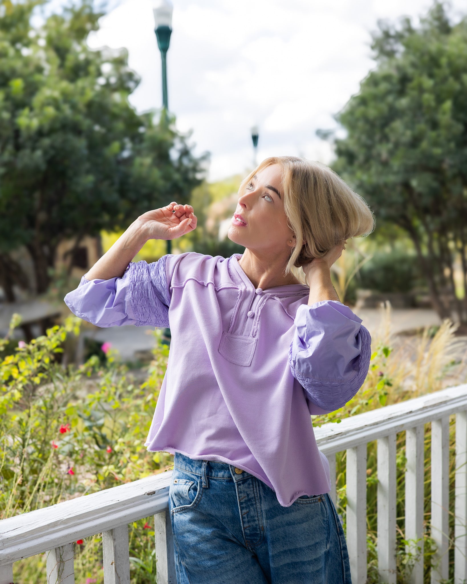 Cozy up in this playful lavender sweatshirt that’s anything but ordinary. Its soft lavender hue brings a fresh pop of color, while the detailed sleeves add a fun, unique twist to your everyday look. Perfect for lounging or layering, this sweatshirt combines comfort with a touch of whimsy to brighten your casual wardrobe.