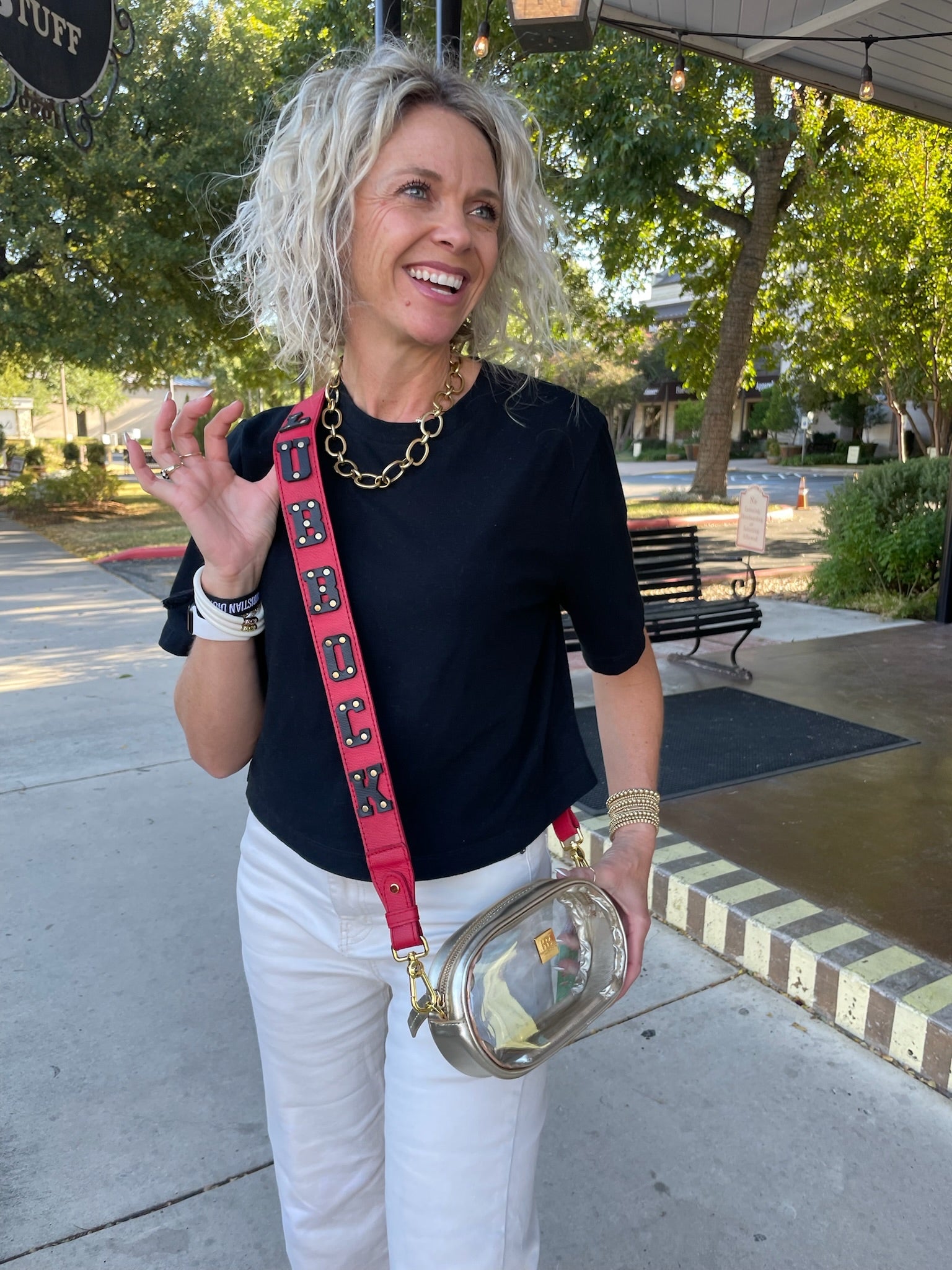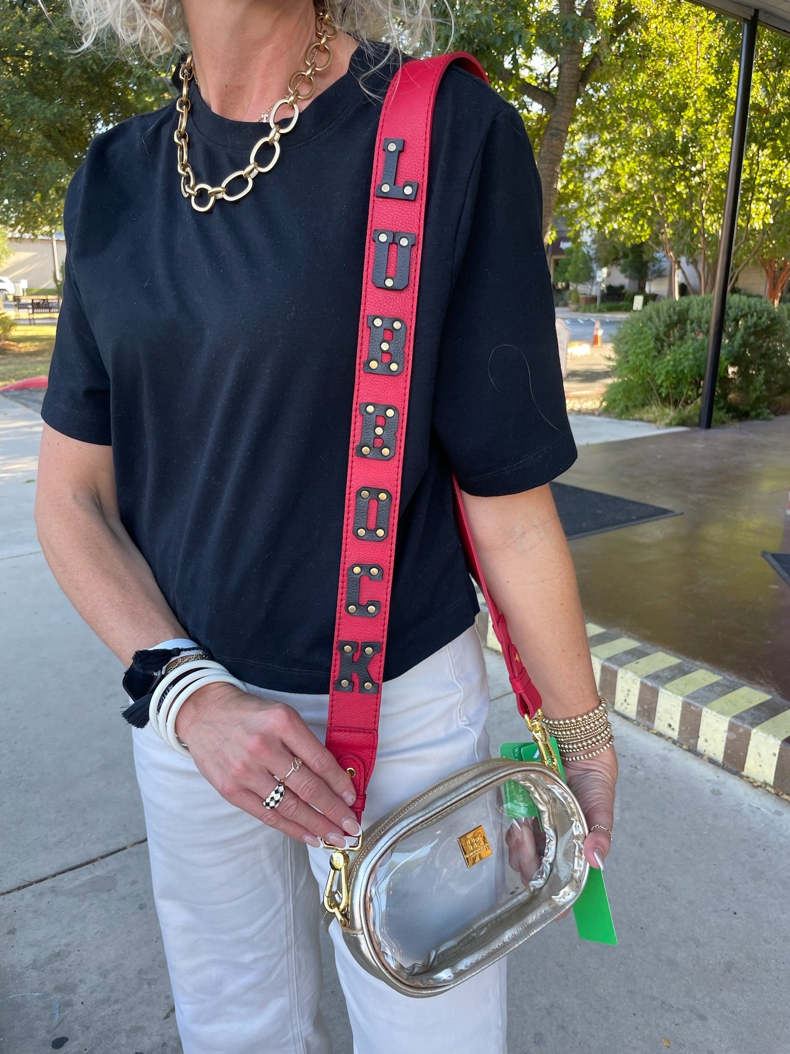 Make a stylish statement on game day with this Leather Lubbock Strap! This genuine leather strap is the perfect addition to your clear purse, featuring a vibrant "Lubbock" design that'll be sure to turn heads. Show your Texas Tech pride!! Go Red Raiders!
