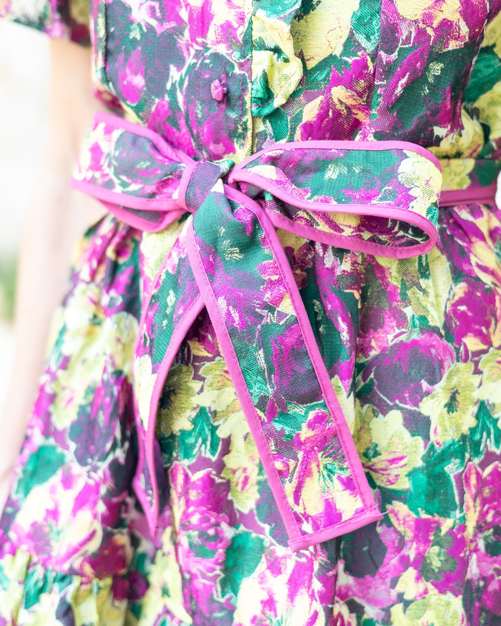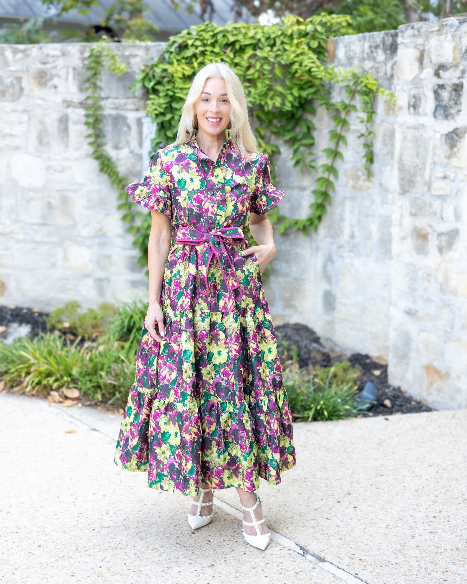 The Lena Dress is a playful floral jacquard maxi that effortlessly combines elegance with fun details. Featuring short sleeves with ruffled edges and a charming high ruffle collar, it adds a flirty touch to your look. The belted tie cinches the waist for a flattering fit, while the full skirt flows beautifully, perfect for twirling through any occasion.