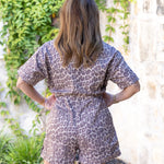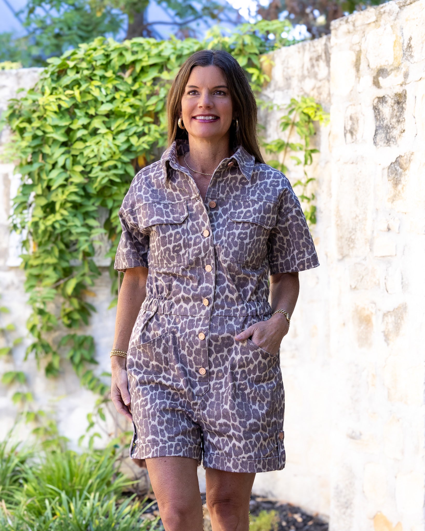 This playful leopard utility romper combines wild style with practical design. Featuring easy button-up front closure and handy pockets, it keeps you ready for adventure and comfort all day long. Perfect for adding a fun, fierce touch to your casual wardrobe.