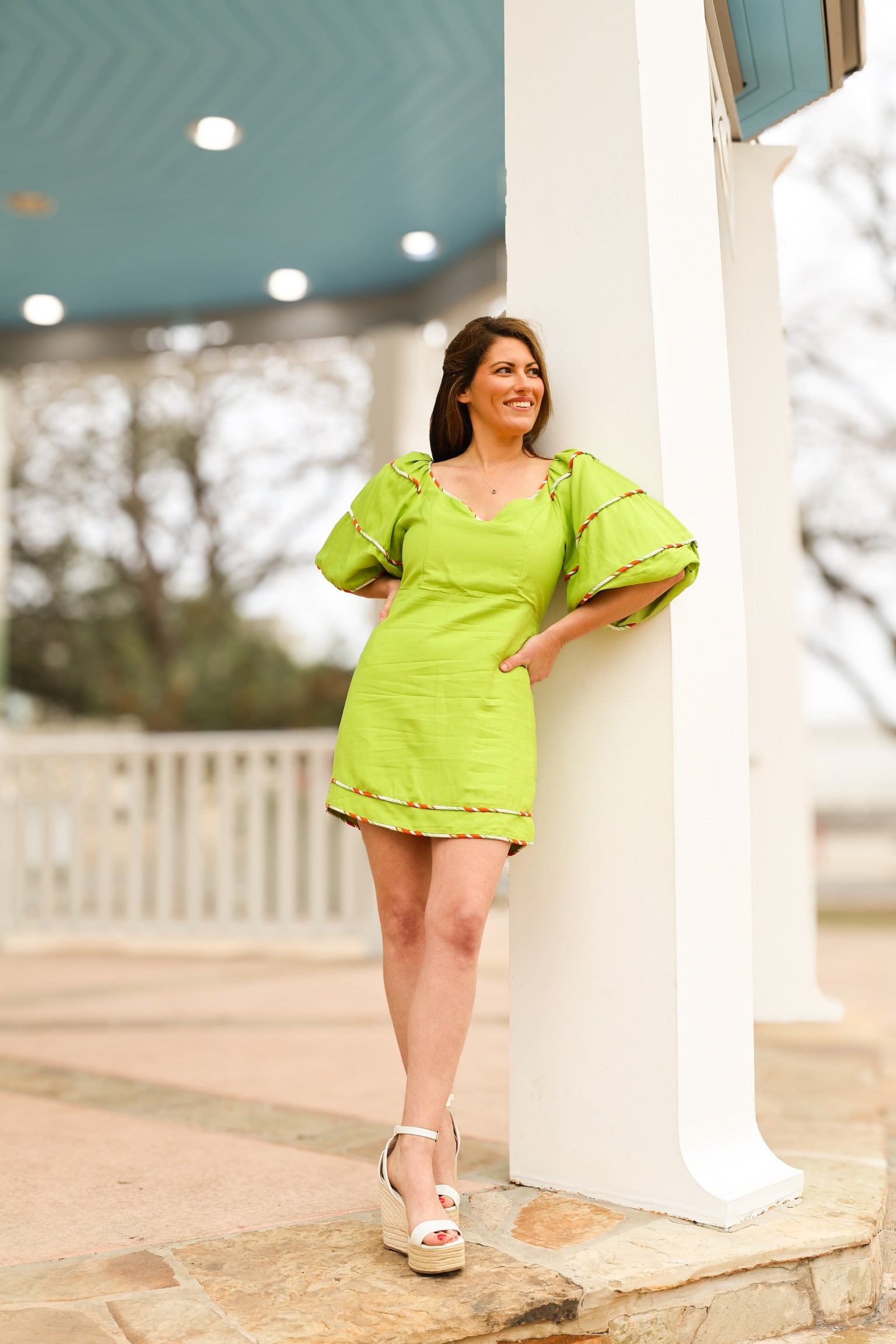Turn heads in the Karlie lime green mini! Featuring intricate trim details and playful puff sleeves, this dress is a fun and flirty addition to your wardrobe. Perfect for a night out or a daytime event, this dress will make you stand out in the best way possible.