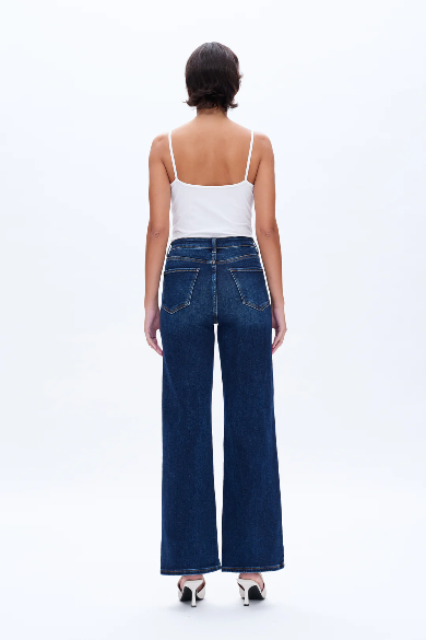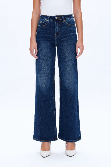 Crafted from stretch denim fabric, our classic high-waisted wide-leg denim jeans in a dark base color, designed with five pockets and a clean hem, featuring whiskering and fading effects.