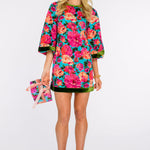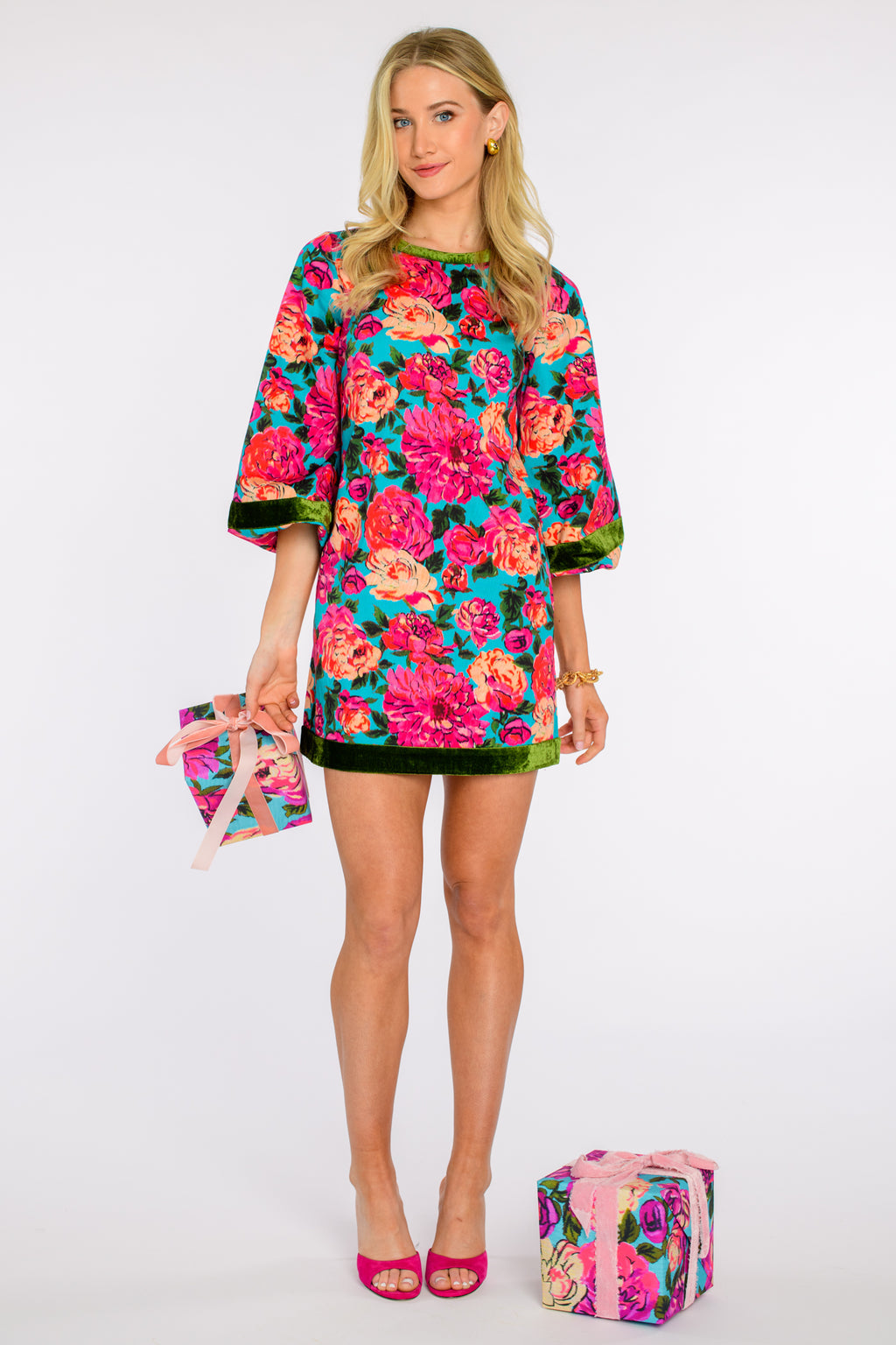 Step into timeless elegance with the London Dress, a vintage-inspired mini featuring a romantic rose floral print on sumptuous velvet. Long bell sleeves add dramatic flair, while contrasting velvet stitch details create visual interest and texture.