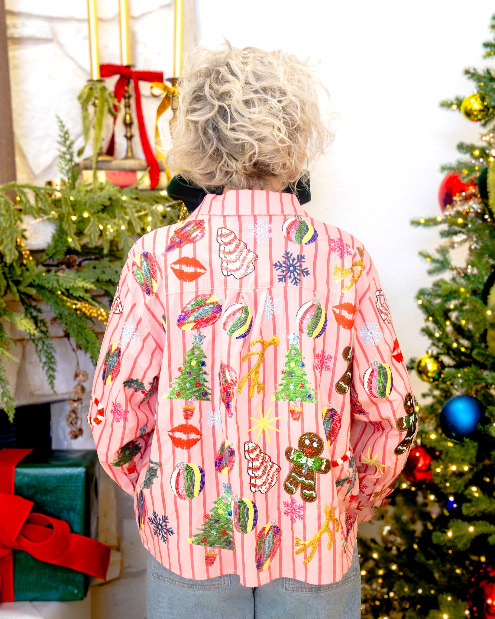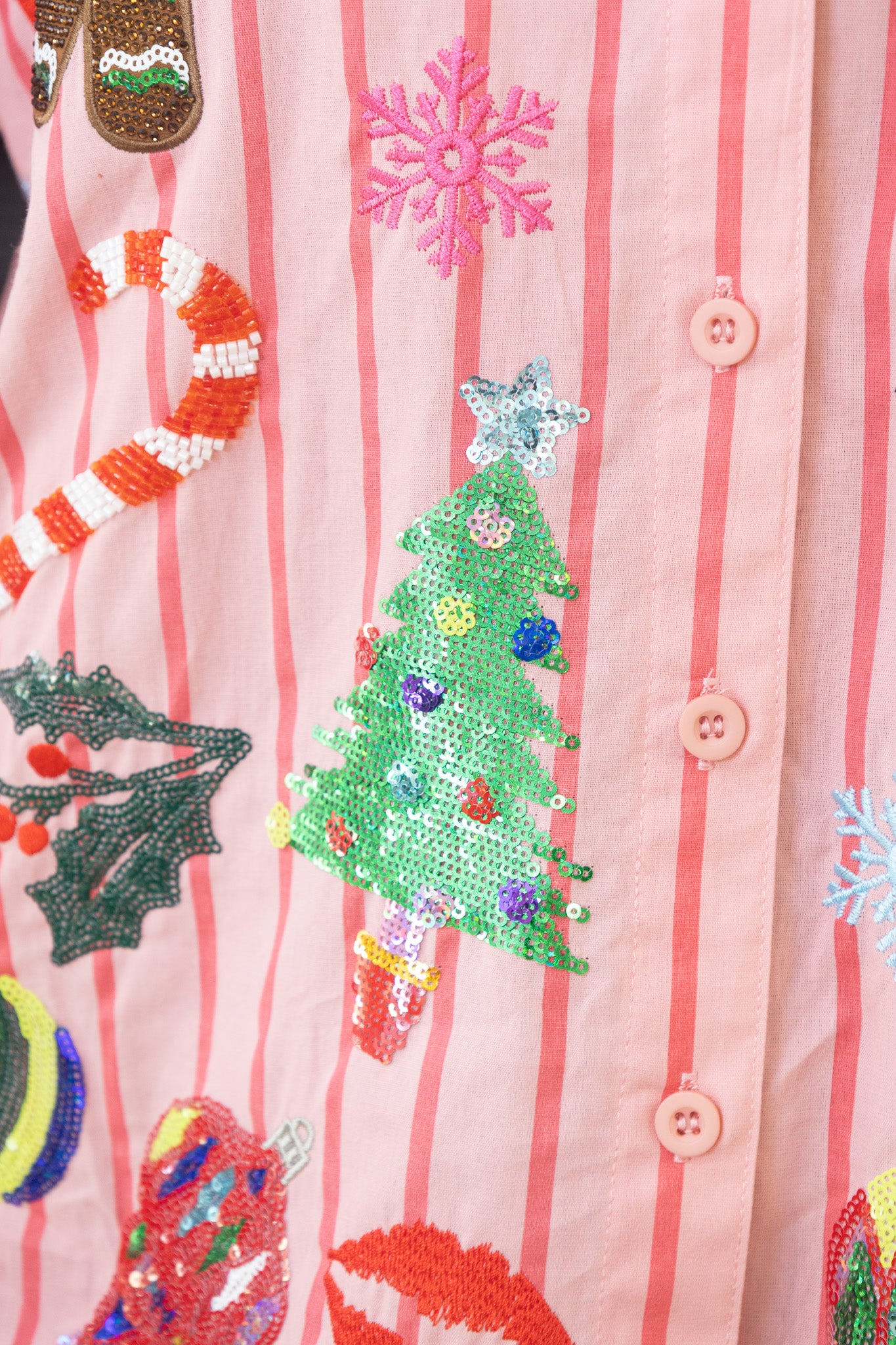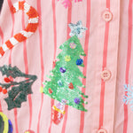 This light pink button-up top features vibrant red stripes and playful sequin Christmas icons scattered all over, adding a festive sparkle to your holiday wardrobe. Perfect for cozy gatherings or seasonal fun, it pairs effortlessly with matching shorts or pants for a complete, cheerful look. Celebrate in style and comfort with this merry and bright design!