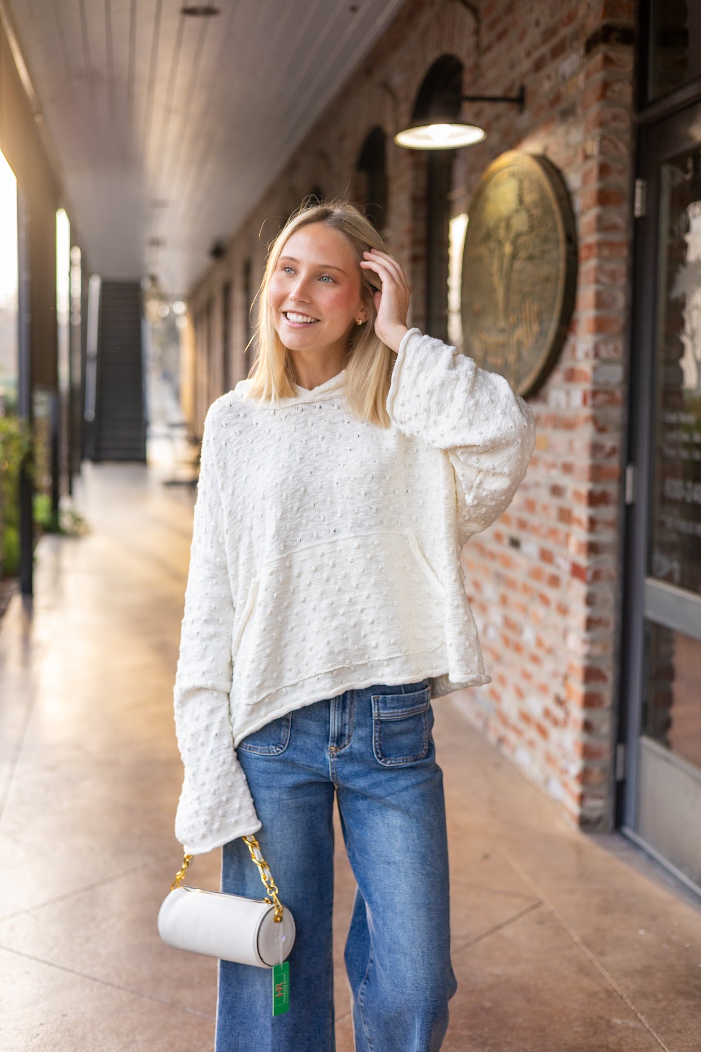 Wrap yourself in cloud-like comfort with this marshmallow pullover—a cozy hooded sweater that feels as soft as it looks. The soothing, neutral tone pairs perfectly with everyday outfits, while the textured front pocket adds a playful touch with its raised dot detailing.