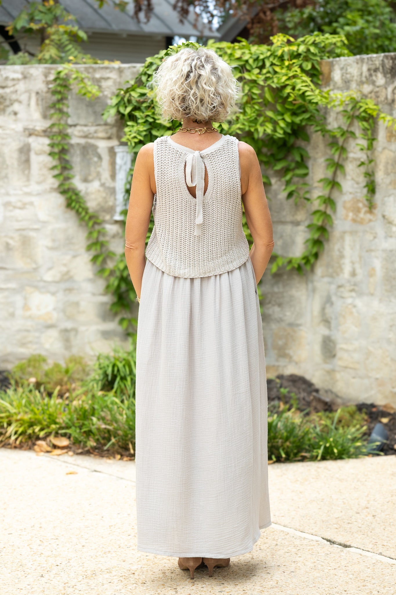 This Misty Grey Maxi dress combines effortless style with cozy charm. Its sleeveless design keeps you cool and comfortable, while the one-piece sweater overlay adds a playful twist and extra warmth. Perfect for layering or wearing solo, it’s the go-to dress for days when you want to feel both relaxed and chic.