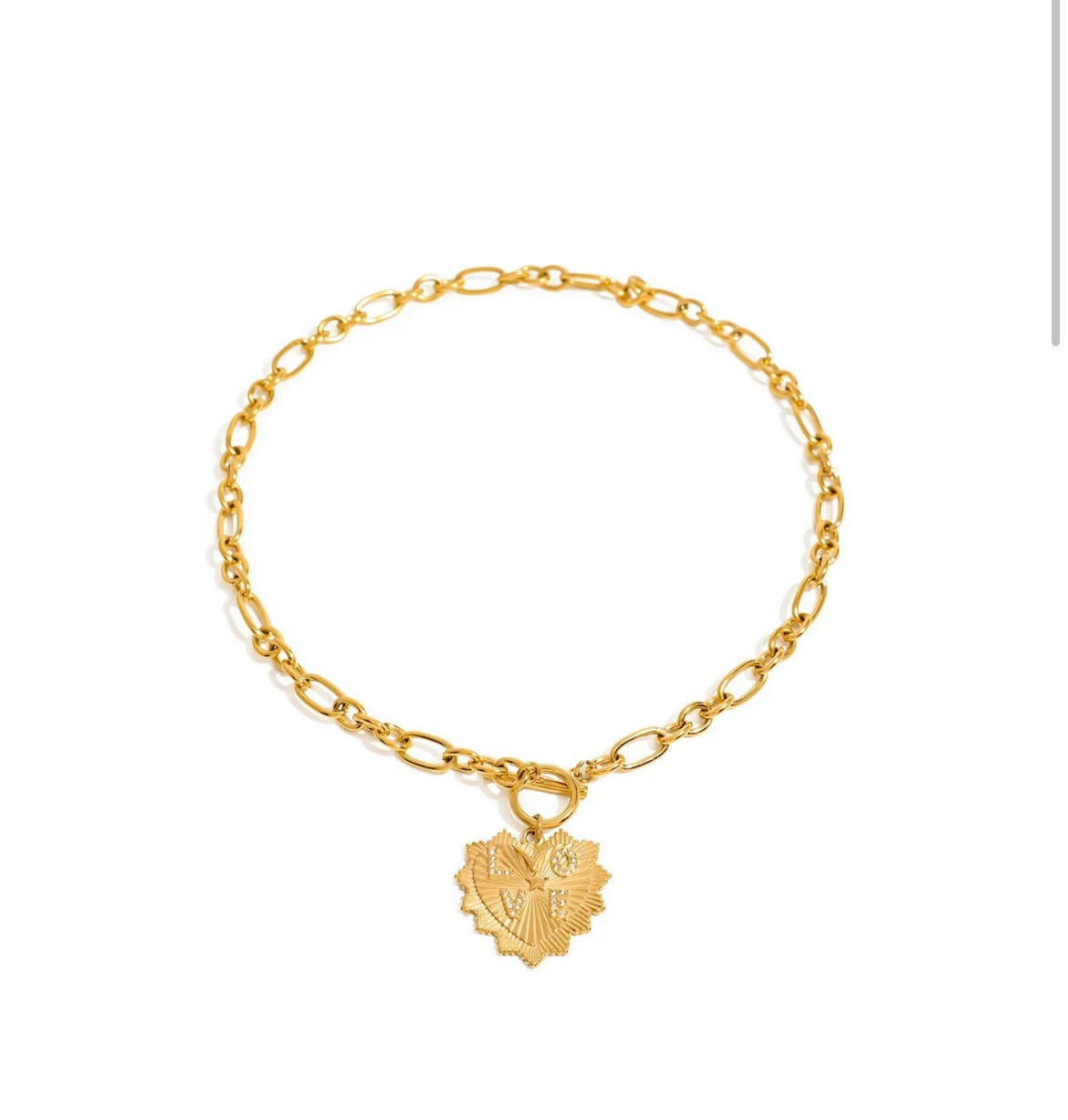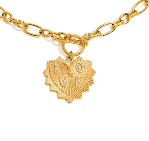 18k gold plated stainless steel necklace with chunky chaiin and textured heart with LOVE in rhinestones.