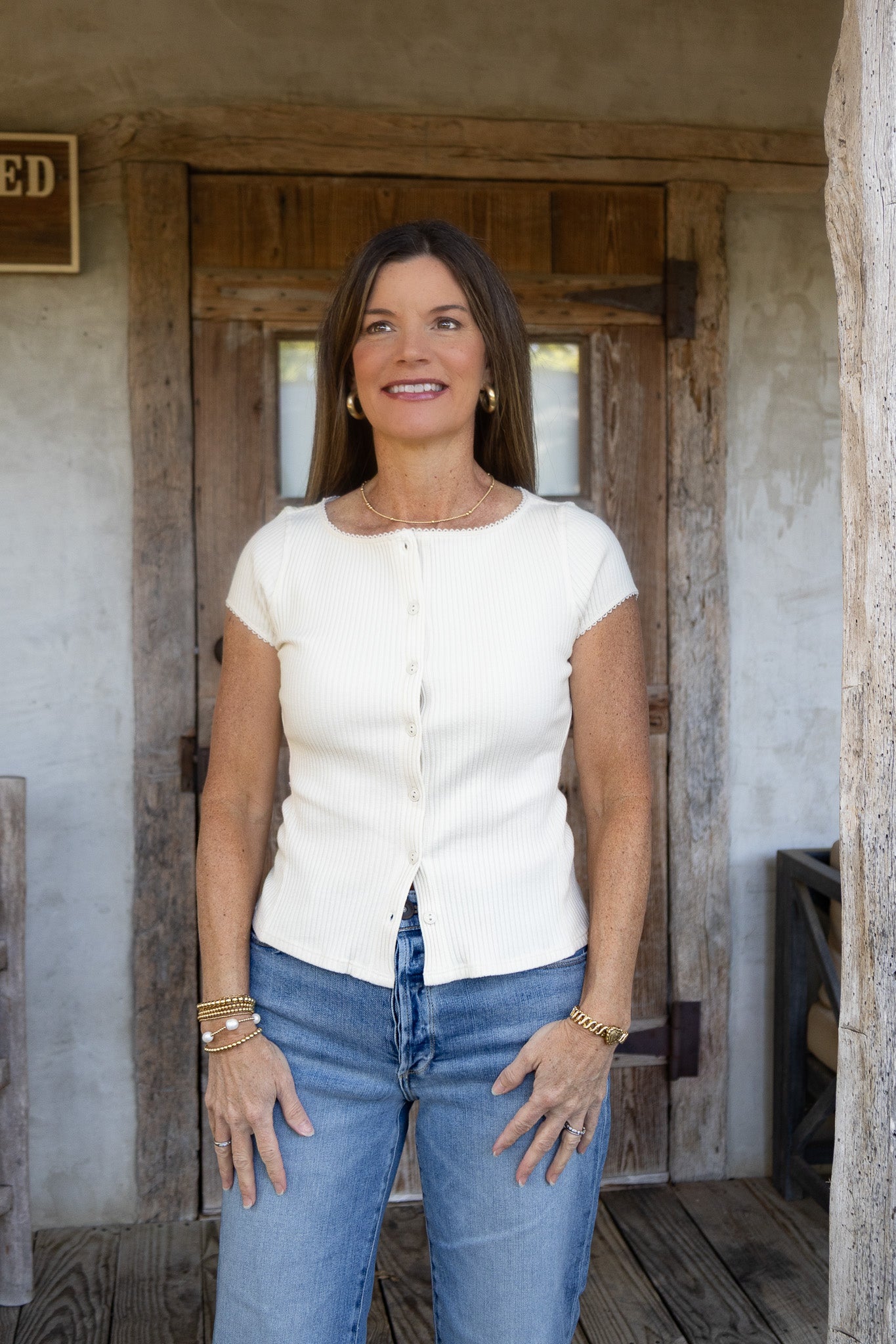 Features: Ribbed swit fabrication, crew neckline, button-front closure, capped sleeves, picot trim