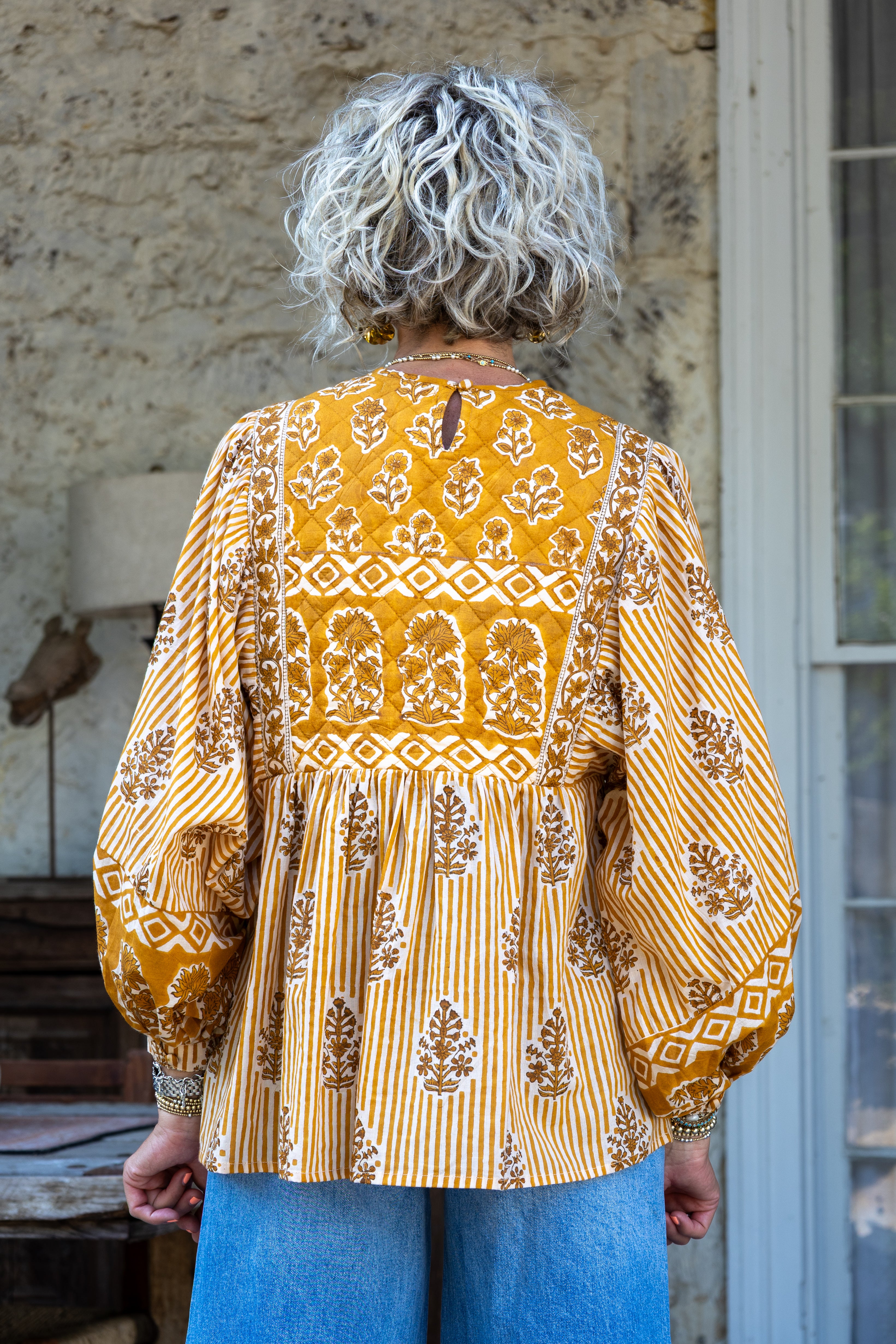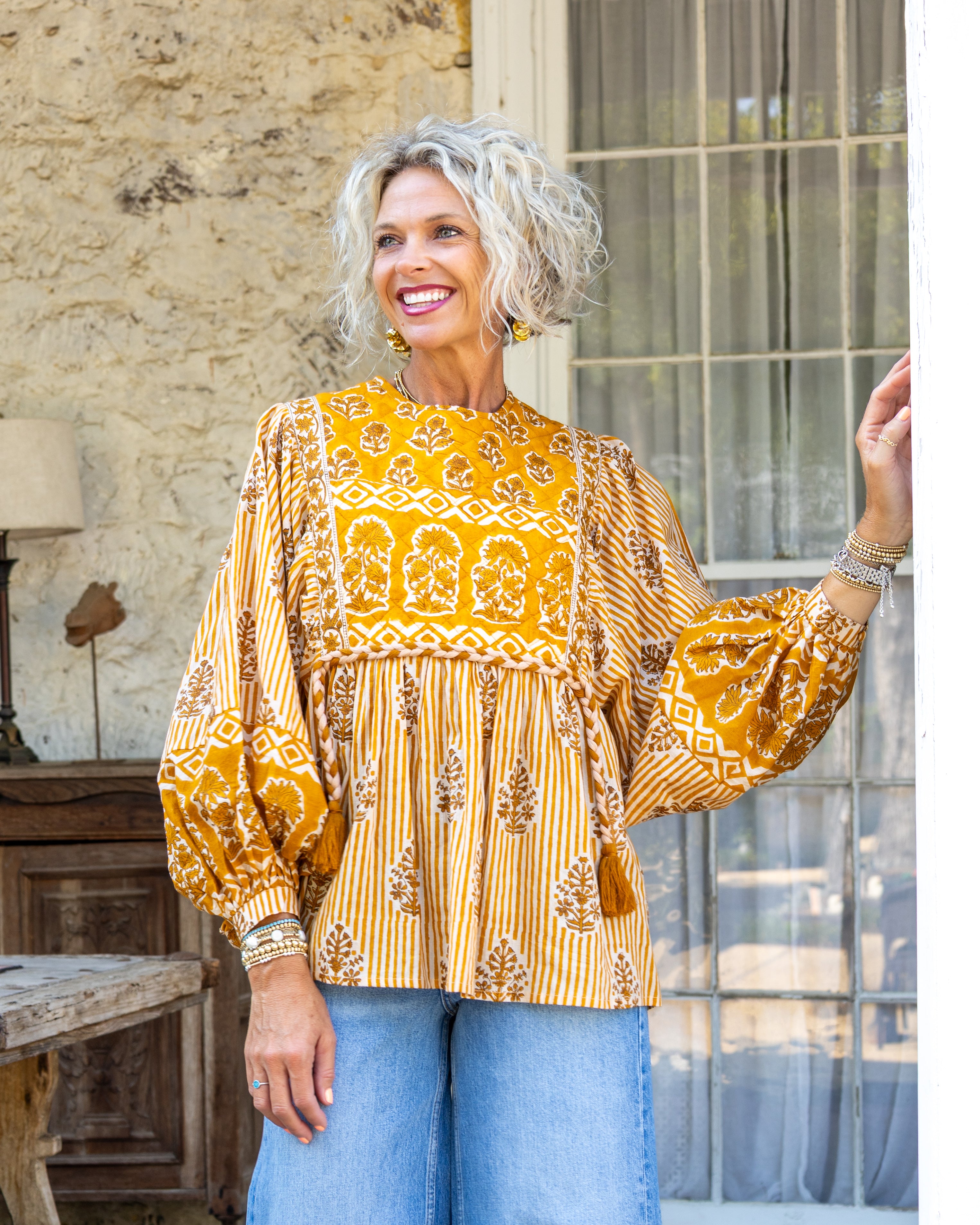 Brighten your wardrobe with this playful mustard and ivory top featuring charming 3/4 puff sleeves. The unique mix of floral and stripe prints brings a fun, fresh vibe, while the tassel detail below the chest adds a whimsical touch.