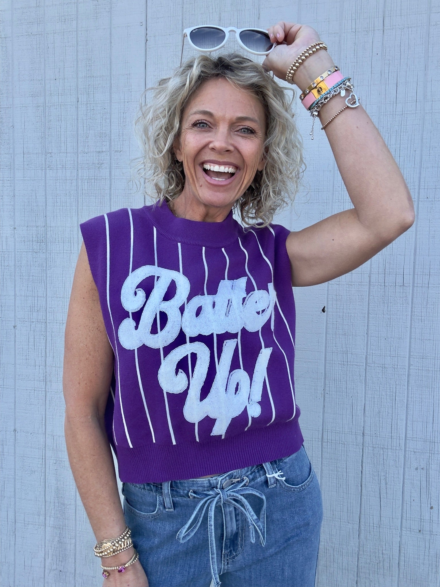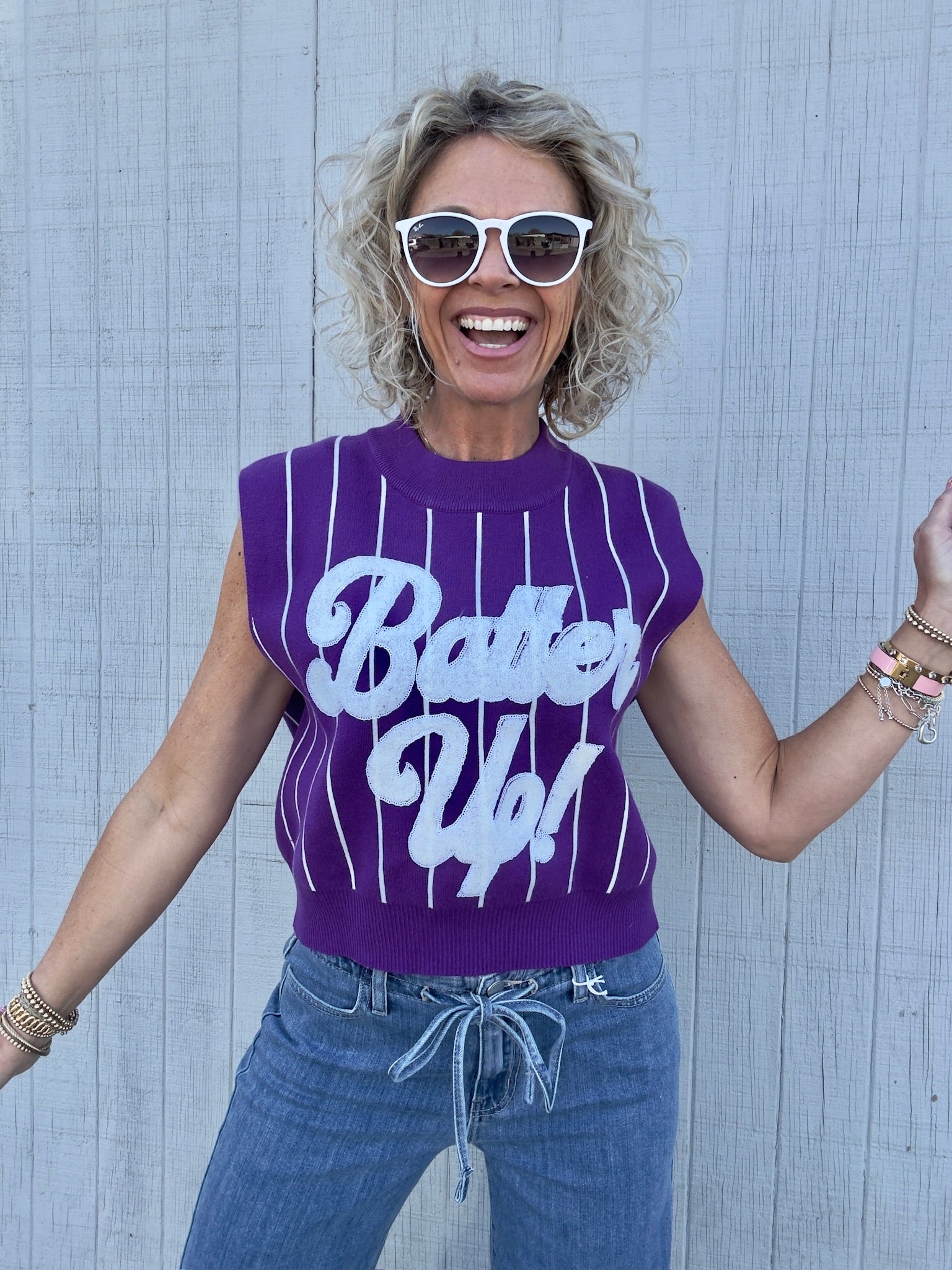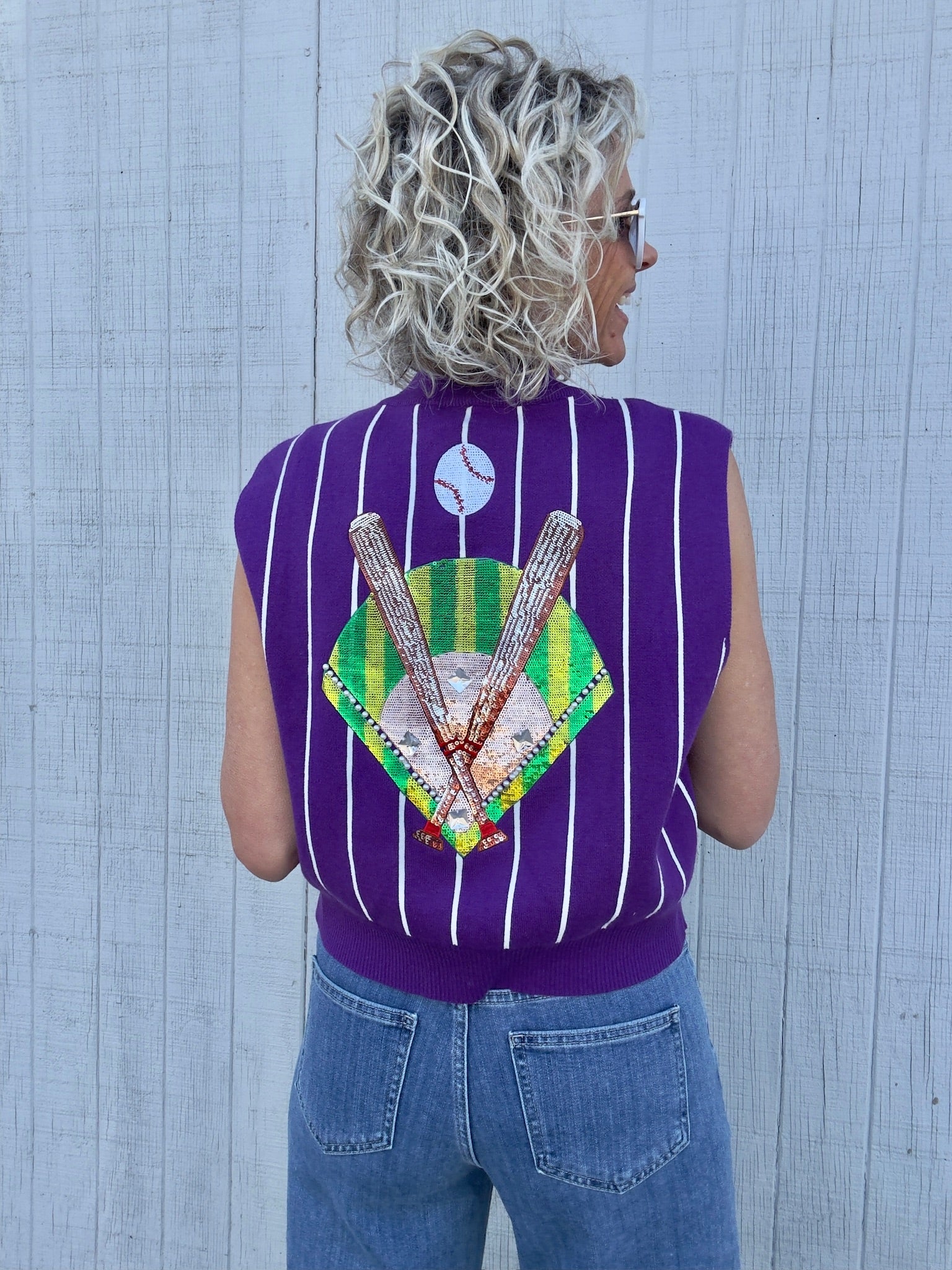 Score a home run with our Purple Batter Up Vest! This Purple and white sweater vest will keep you warm and stylish on those chilly days. Perfect for any casual outing or game day, this vest is a versatile addition to any wardrobe. Batter up and get yours now!