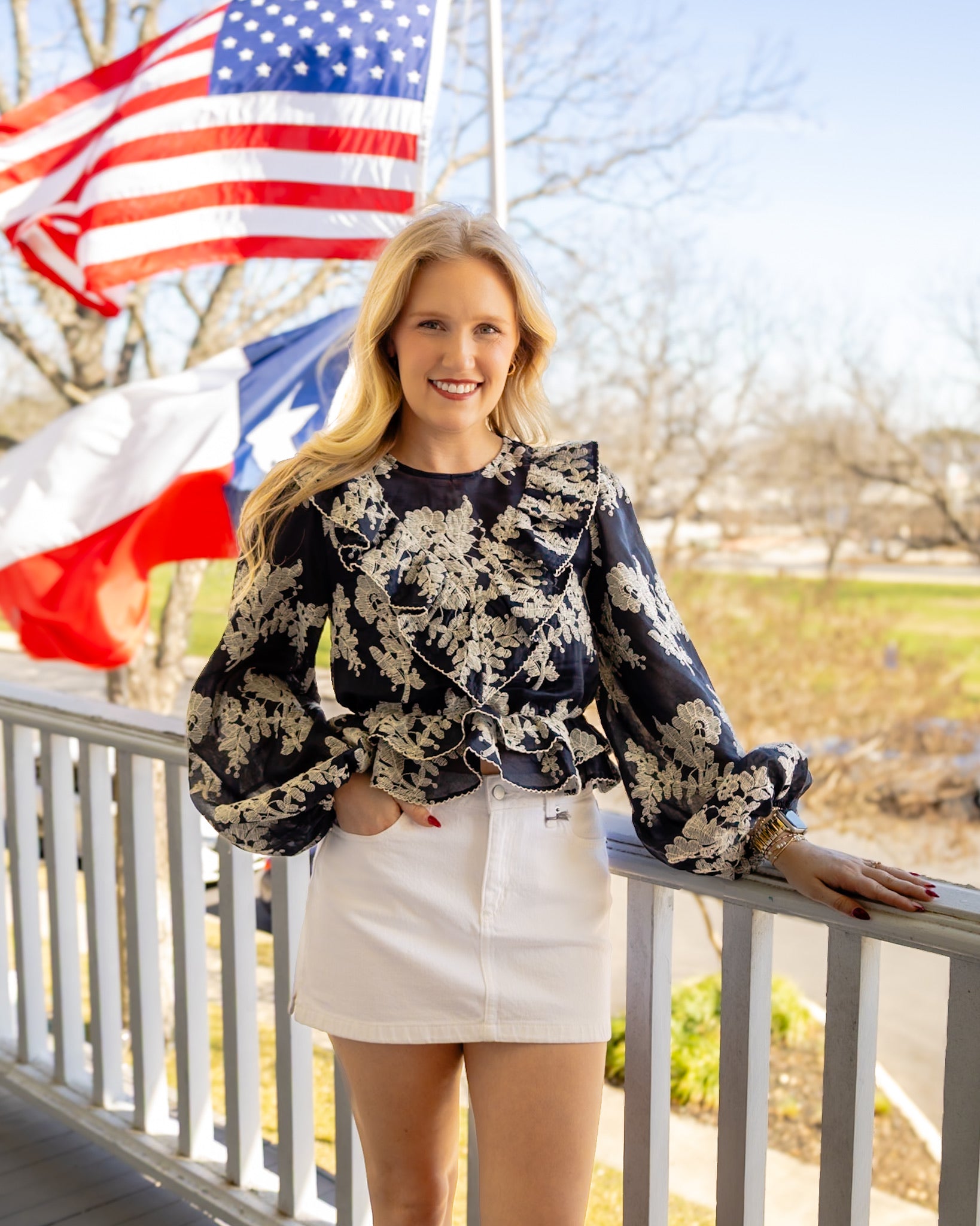 Navy and ivory embroidery details bring charm to this tiered peplum top, creating a flattering silhouette that's equal parts fun and feminine. The layered peplum design adds movement and playful volume, while the delicate embroidery work elevates your everyday look. Perfect for dressing up casual outfits or adding a touch of whimsy to your wardrobe rotation.