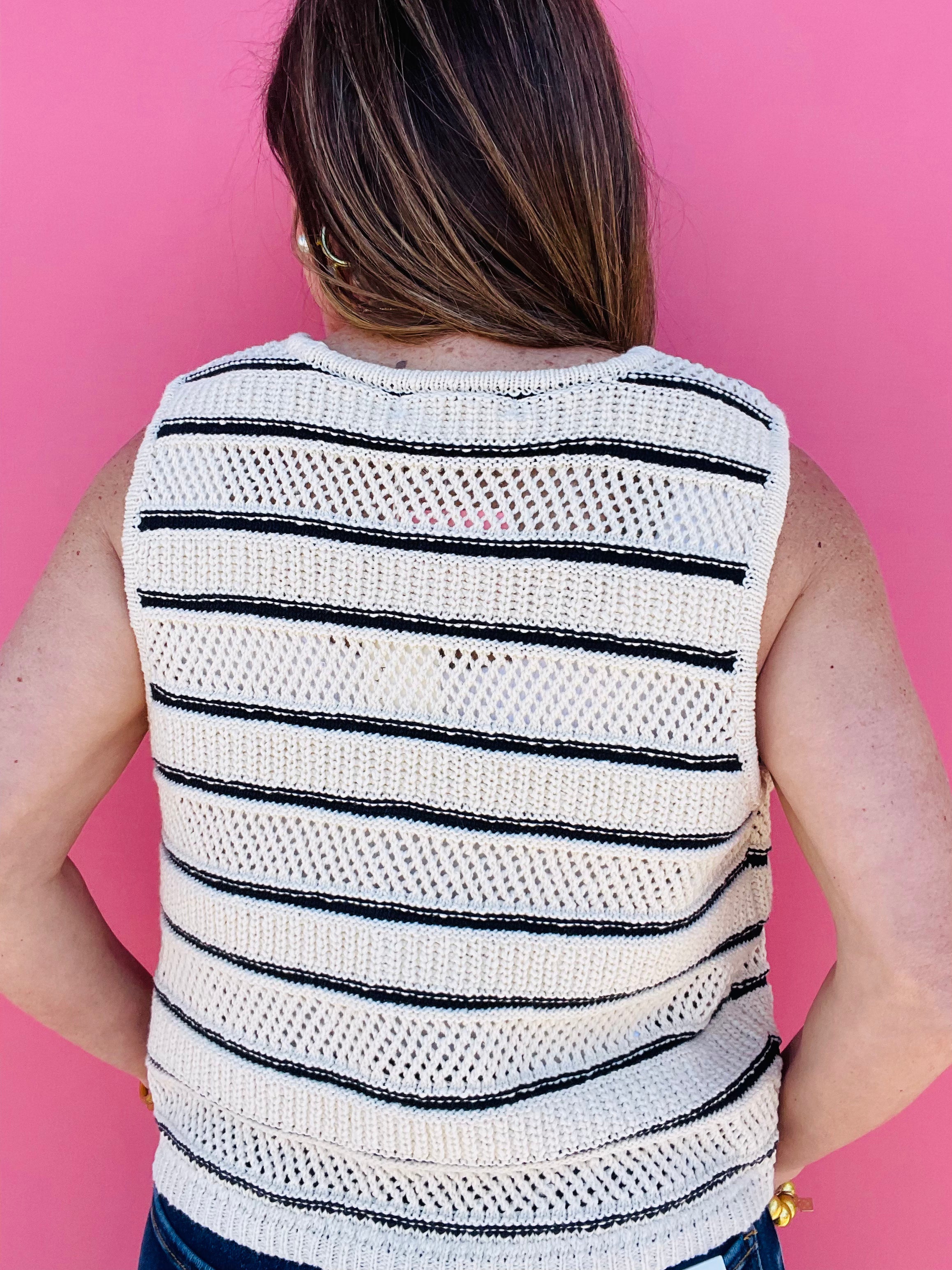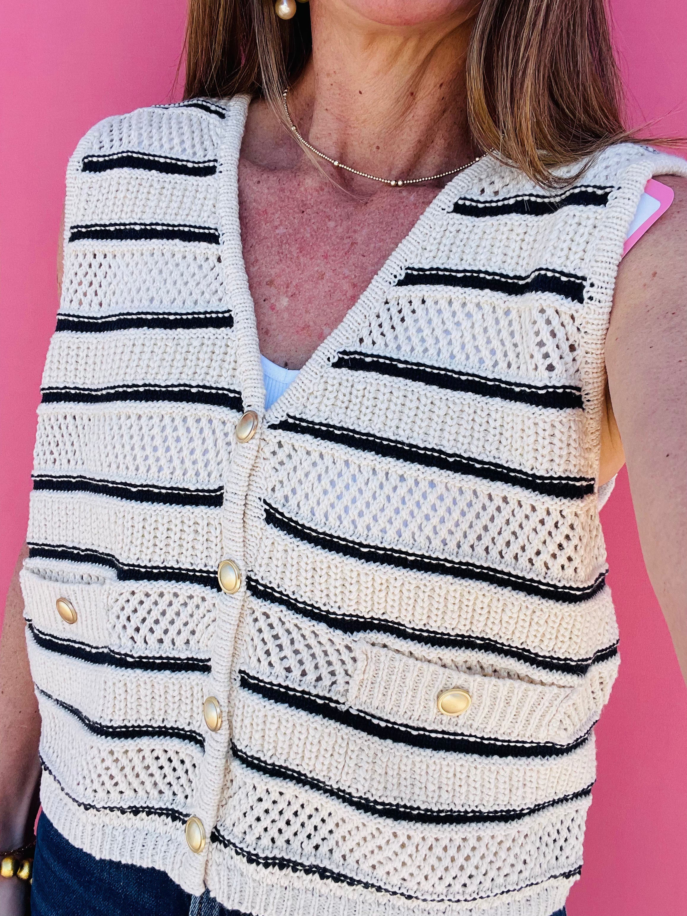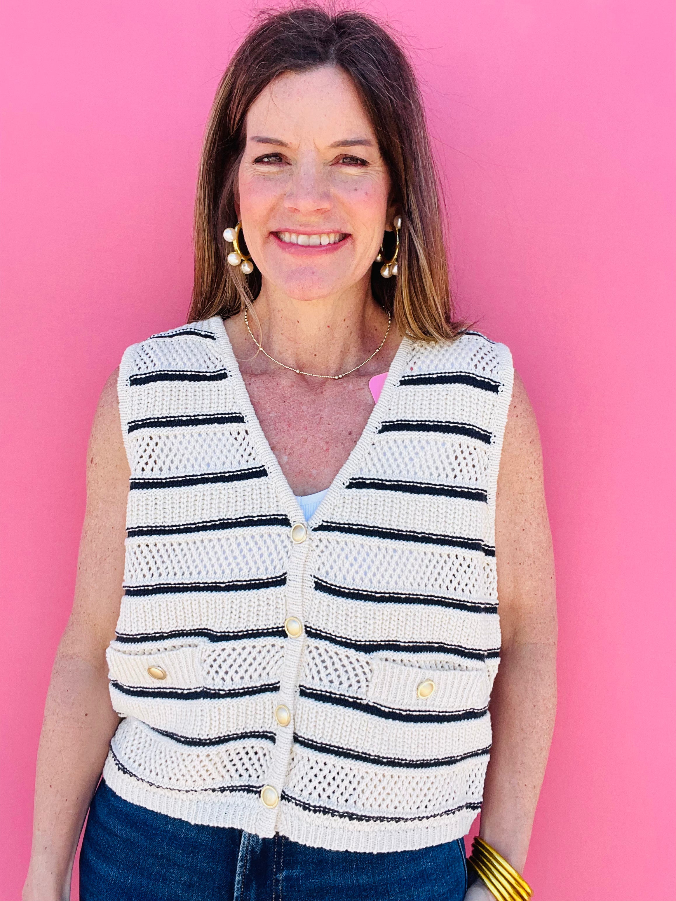 Get ready to add some nautical charm to your wardrobe with our Navy Sleeveless Vest! This stylish piece features a classic navy and ivory stripe design, accented with elegant gold buttons. Perfect for pairing with any outfit and adding a touch of sophistication. Sail away in style!