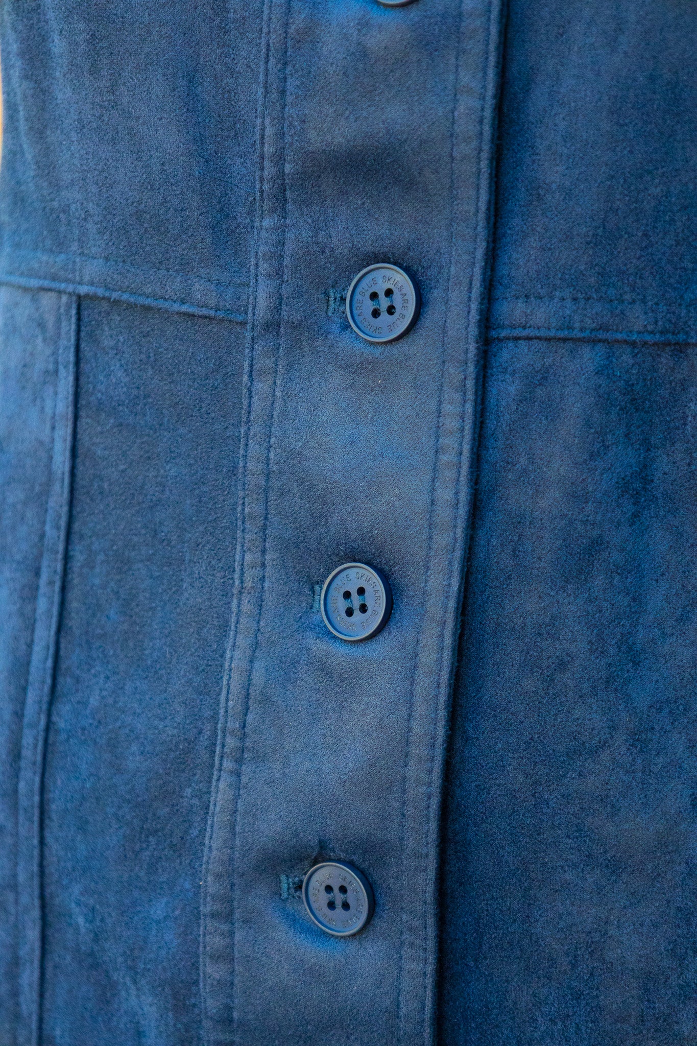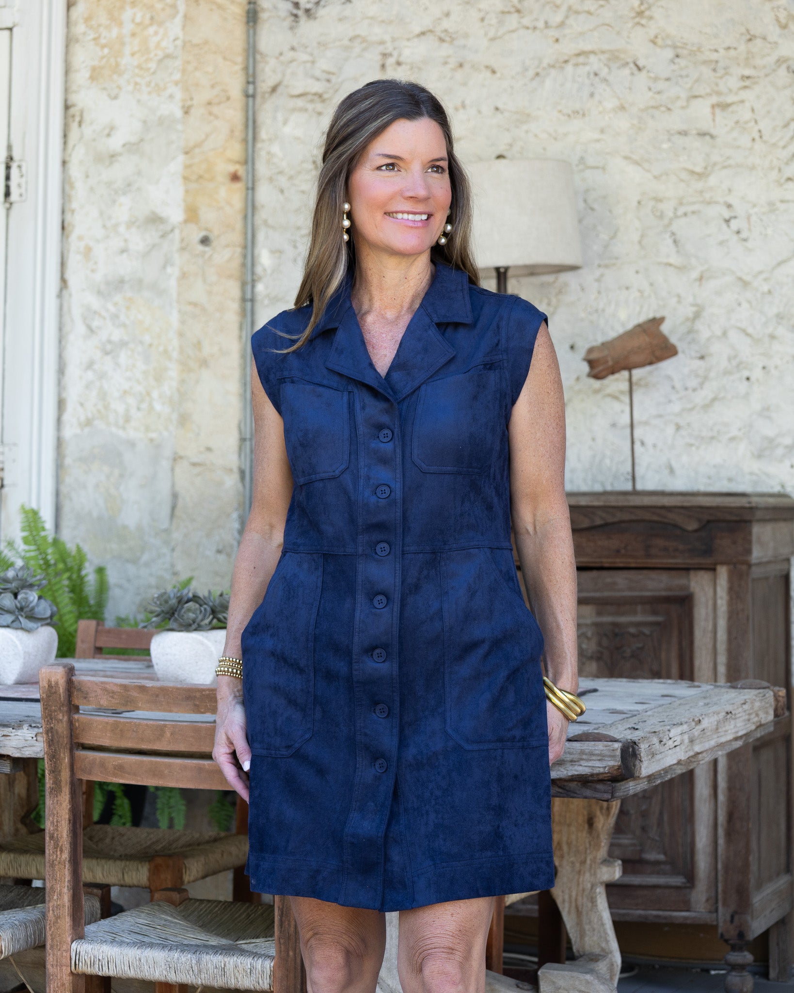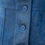 Step out in style with this navy suede mini dress, designed to turn heads. Its playful button-up front adds a flirty touch, while the sleeveless cut keeps it breezy and perfect for warm days or layering. Soft suede texture meets effortless charm in one chic package.