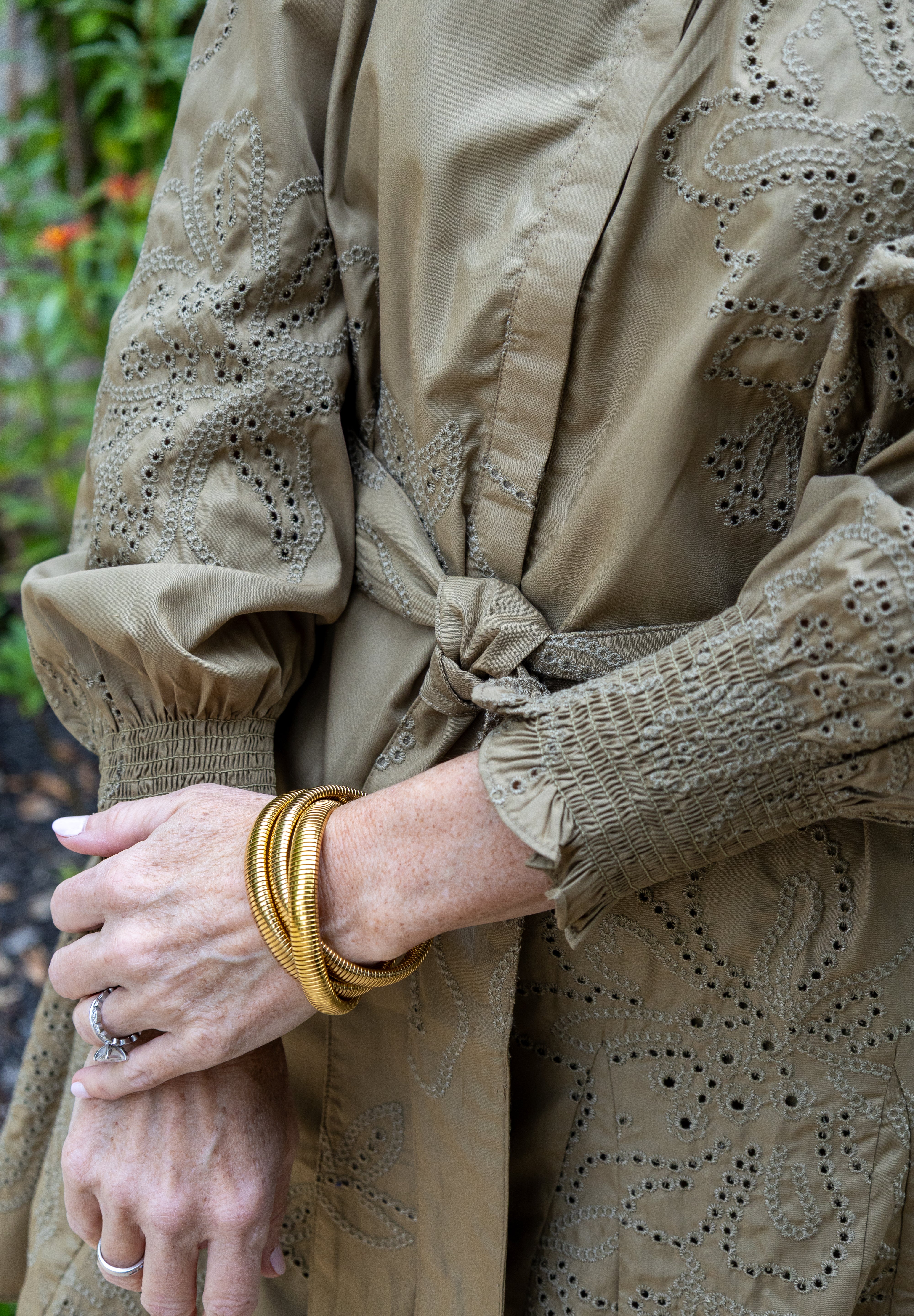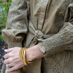 I purchased 3 silver and gold bangles and now I want more! These are so cute and go with everything! I have worked out in them and showered and they have not tarnished! I am typically allergic to certain metals and have had zero issues from these. 10/10 Recommend 💚💚