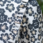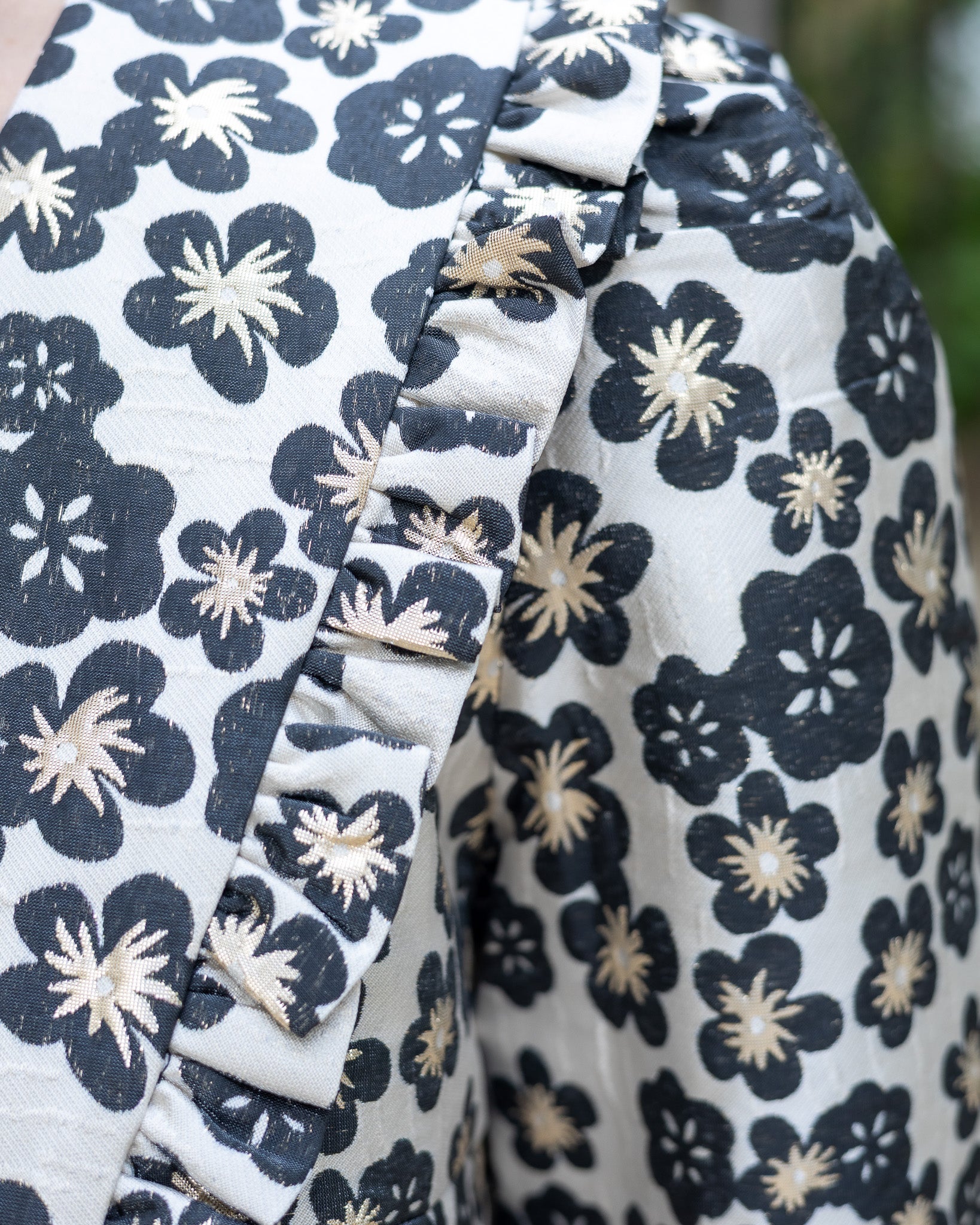 This dress brings flair and elegance with its black and gold floral jacquard woven on a soft ivory backdrop. This mini dress shines subtly thanks to its metallic sheen, while the large ruffled collar adds a fun, dramatic twist. Perfect for turning heads at any event, its long sleeves balance the playful mini length for a look that’s both chic and spirited. Embrace style with a hint of bold charm in this standout piece.