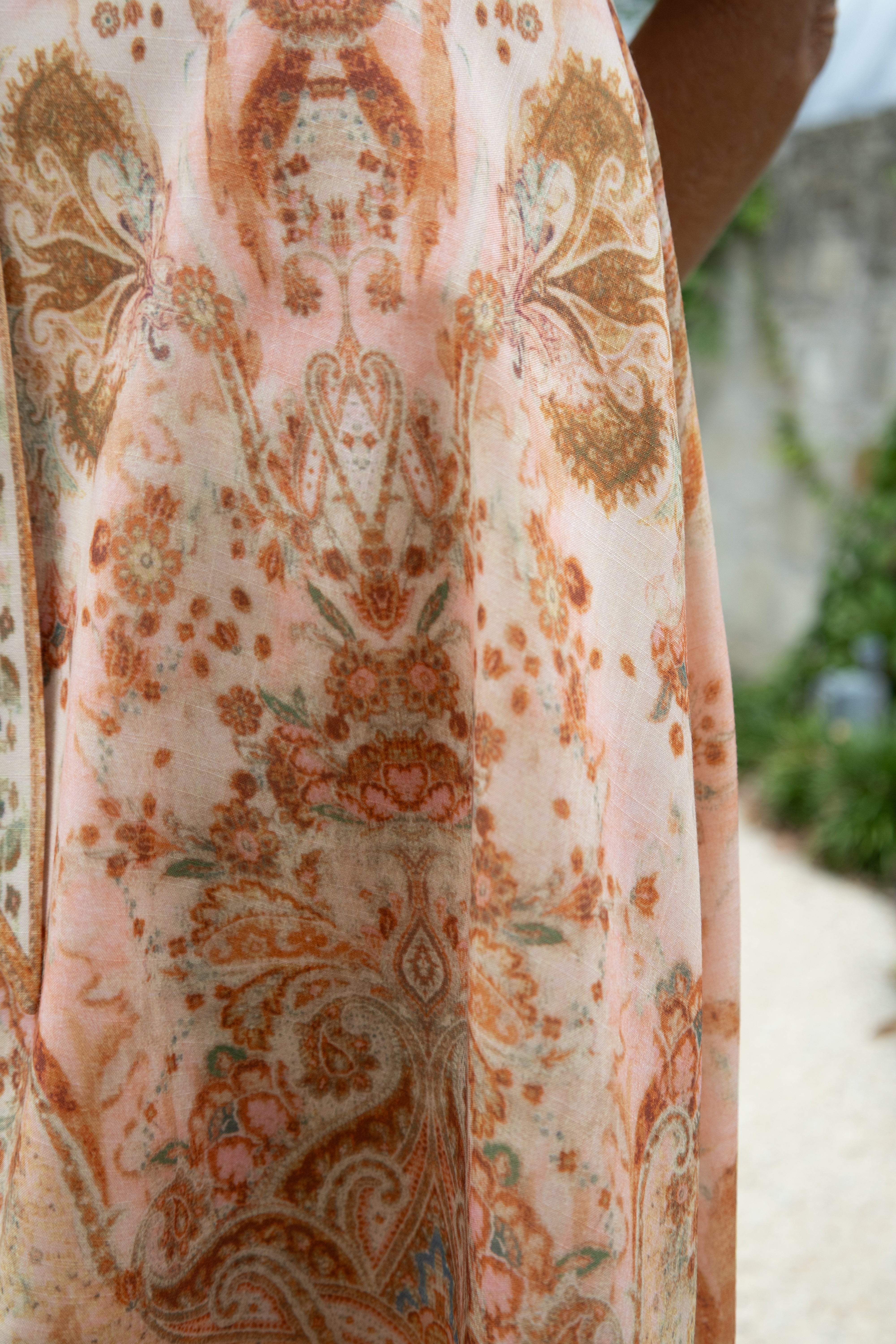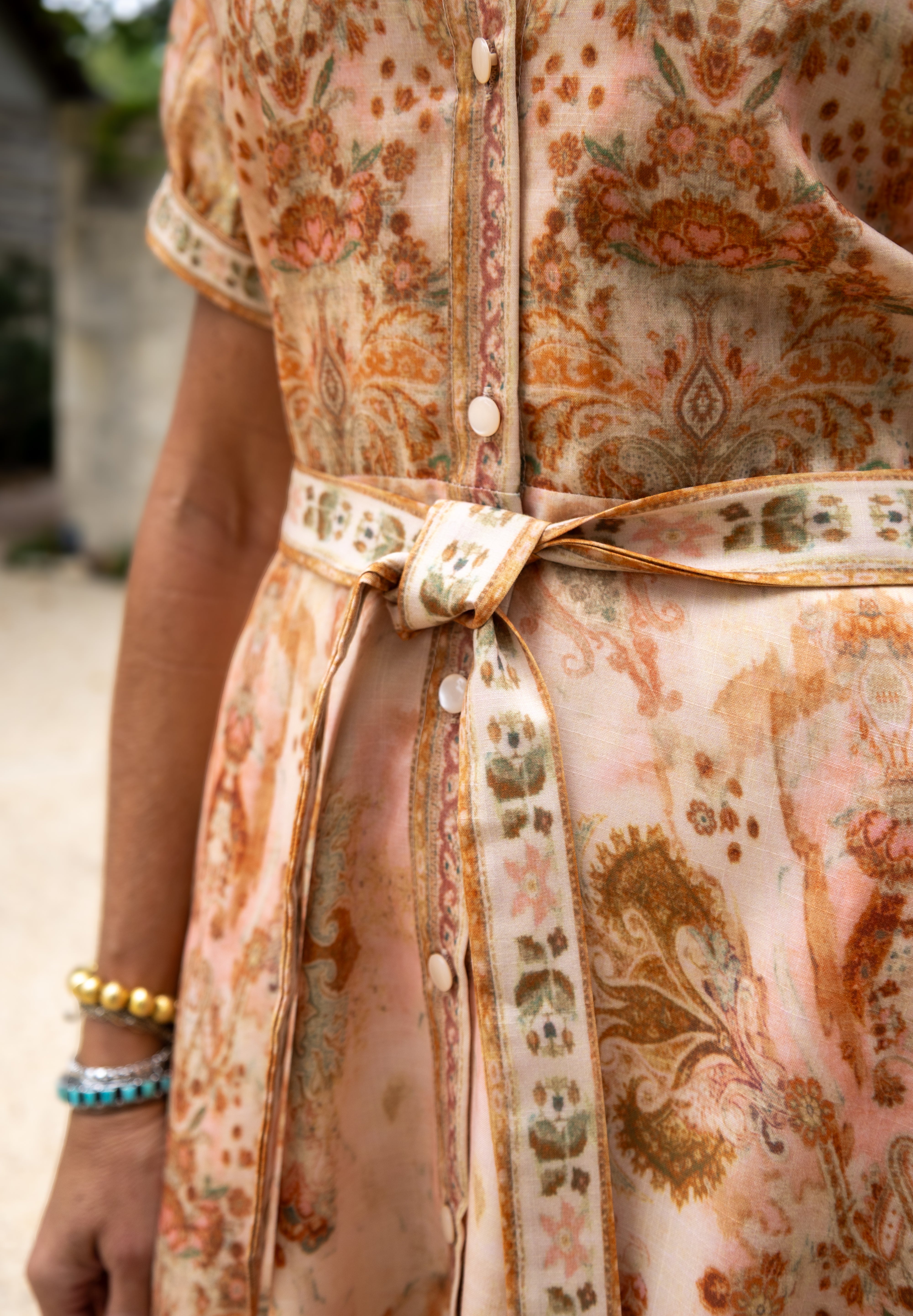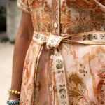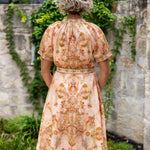 This Peach Floral Dress brings fresh charm with its delicate floral print and soft peach hue. Featuring pearlized buttons down the front, a playful belt that ties at the waist to highlight your silhouette, and handy pockets, it’s a perfect blend of style and convenience. Its short sleeves and midi length keep things light and breezy, ideal for sunny days or garden parties.