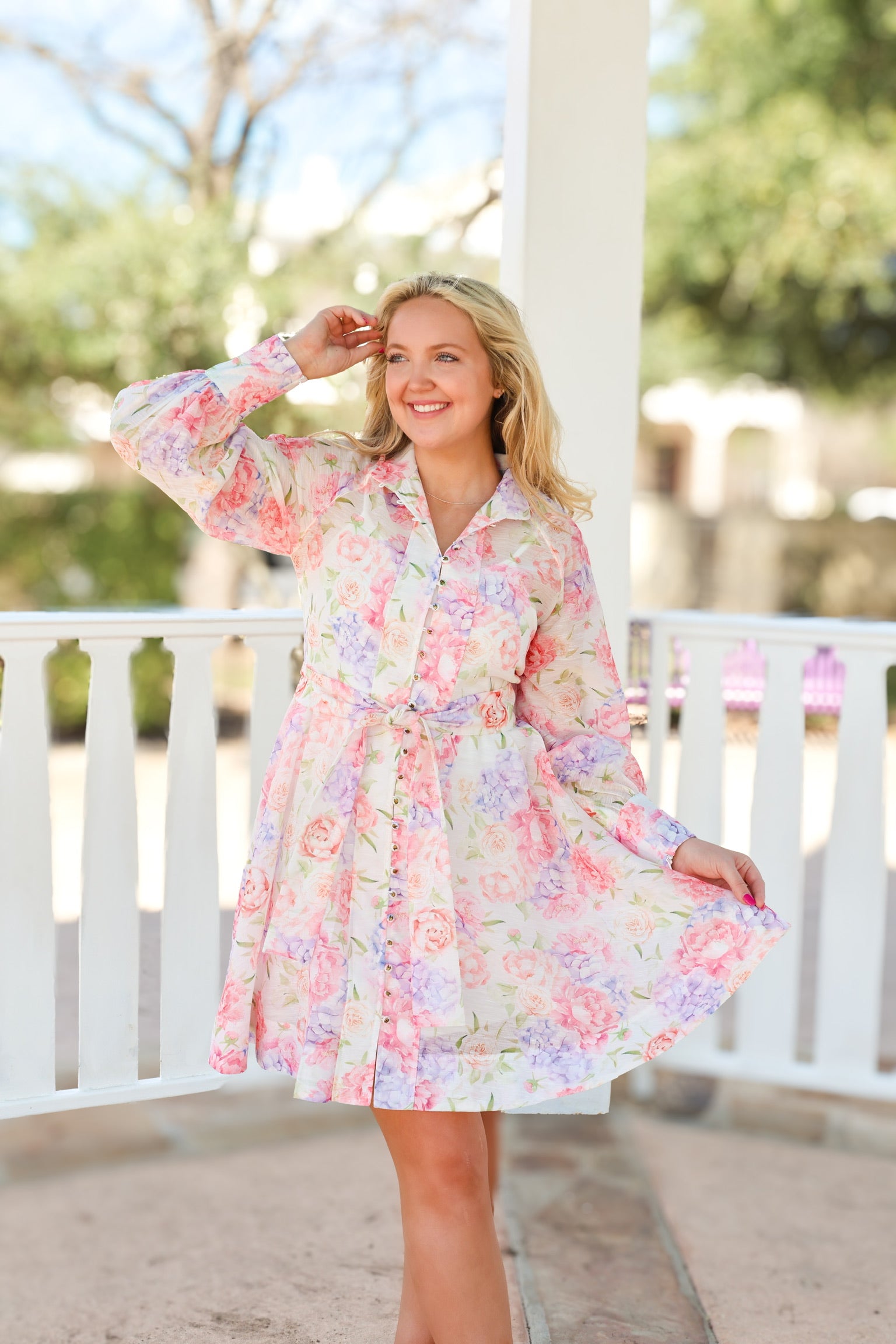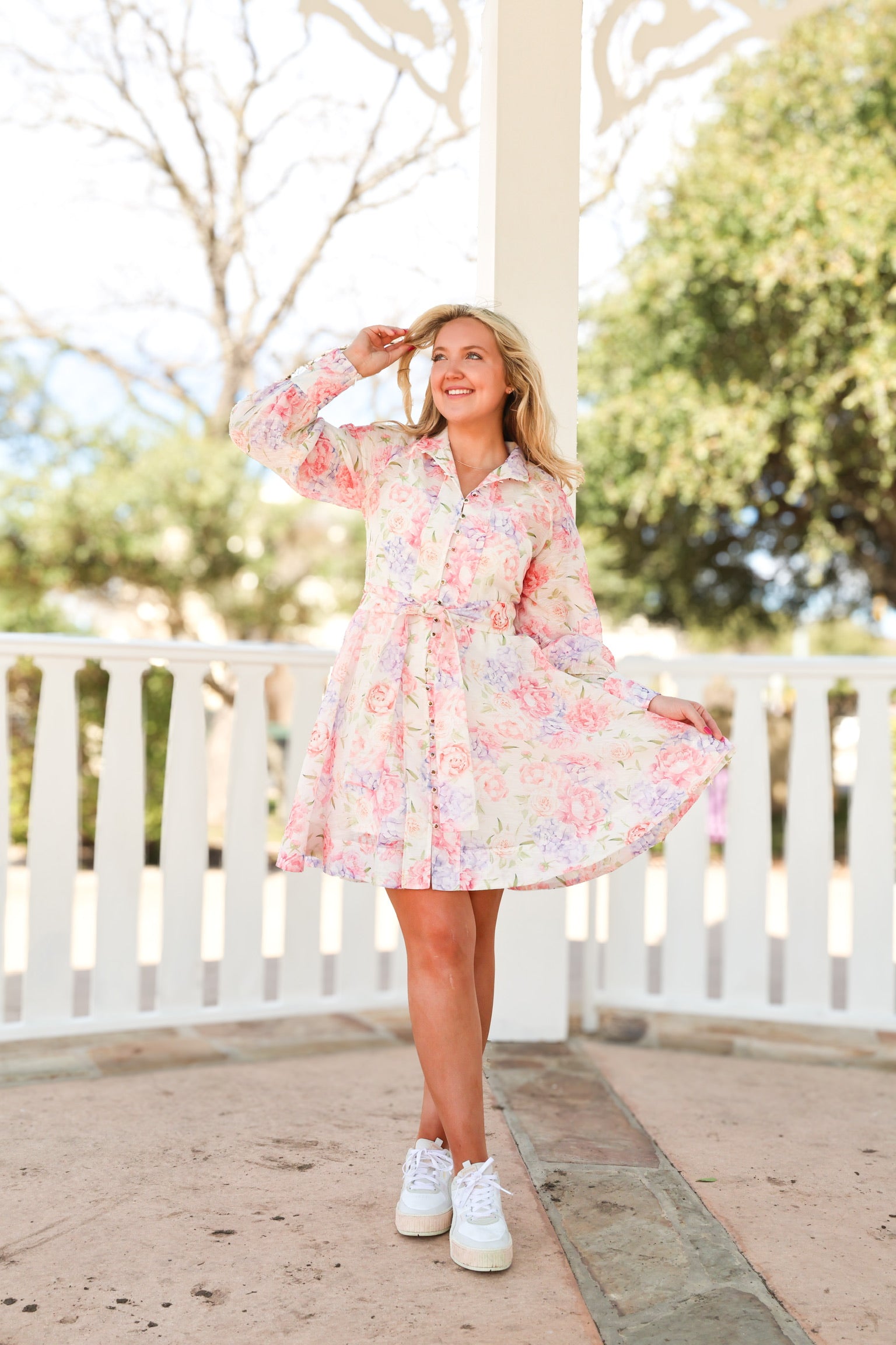 Experience the perfect blend of style and comfort with our Pink Floral Mini Dress! This baby pink, long sleeve dress features a button-up front and a flattering waist tie. Get ready to turn heads and feel confident in this must-have addition to your wardrobe!