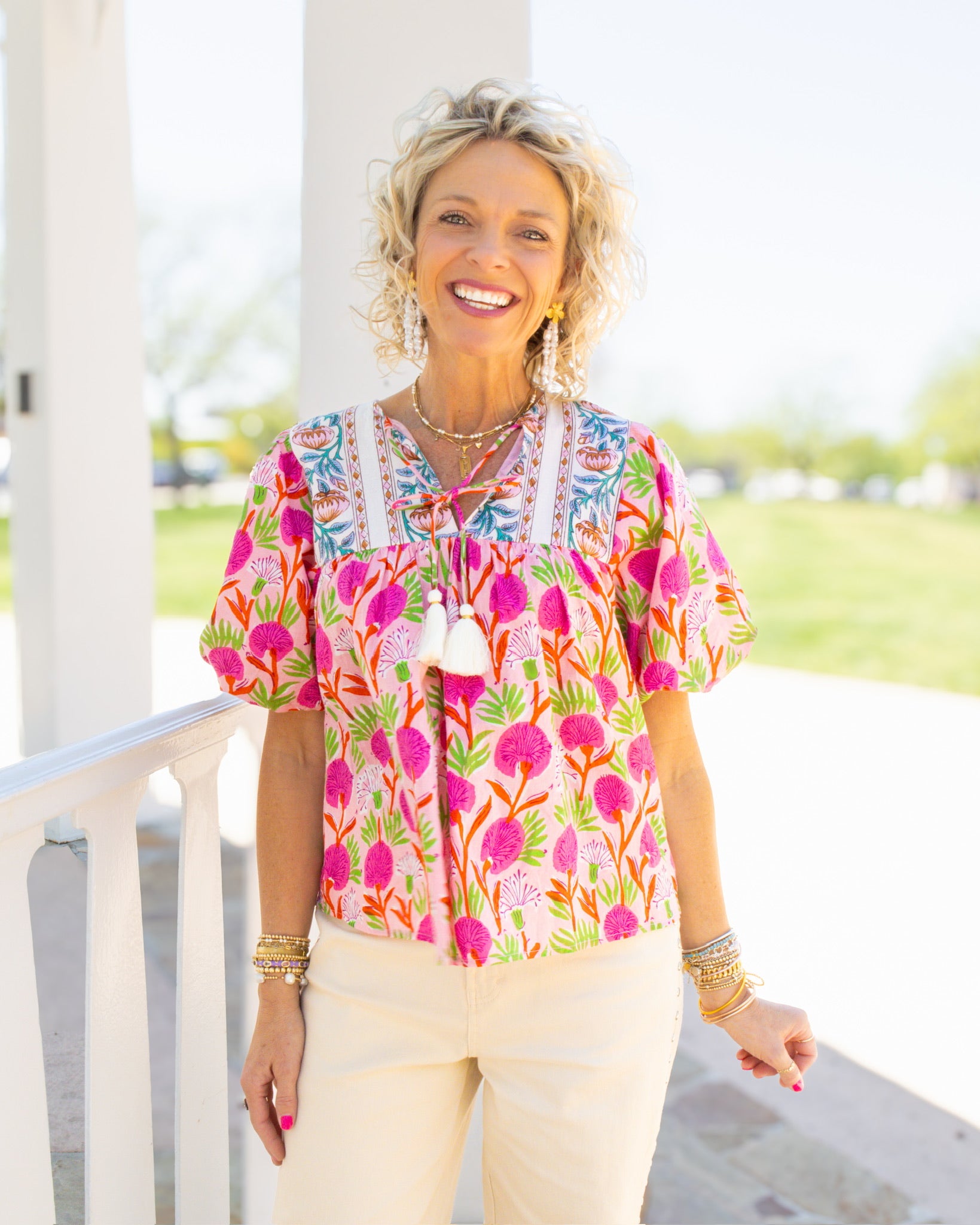 Go for a playful look with our Pink Puff Sleeve Floral Top. This stylish top features pink flowers and charming puff sleeves that are sure to turn heads. Complete the look with its neck tie detail. Add a touch of fun to your wardrobe today!