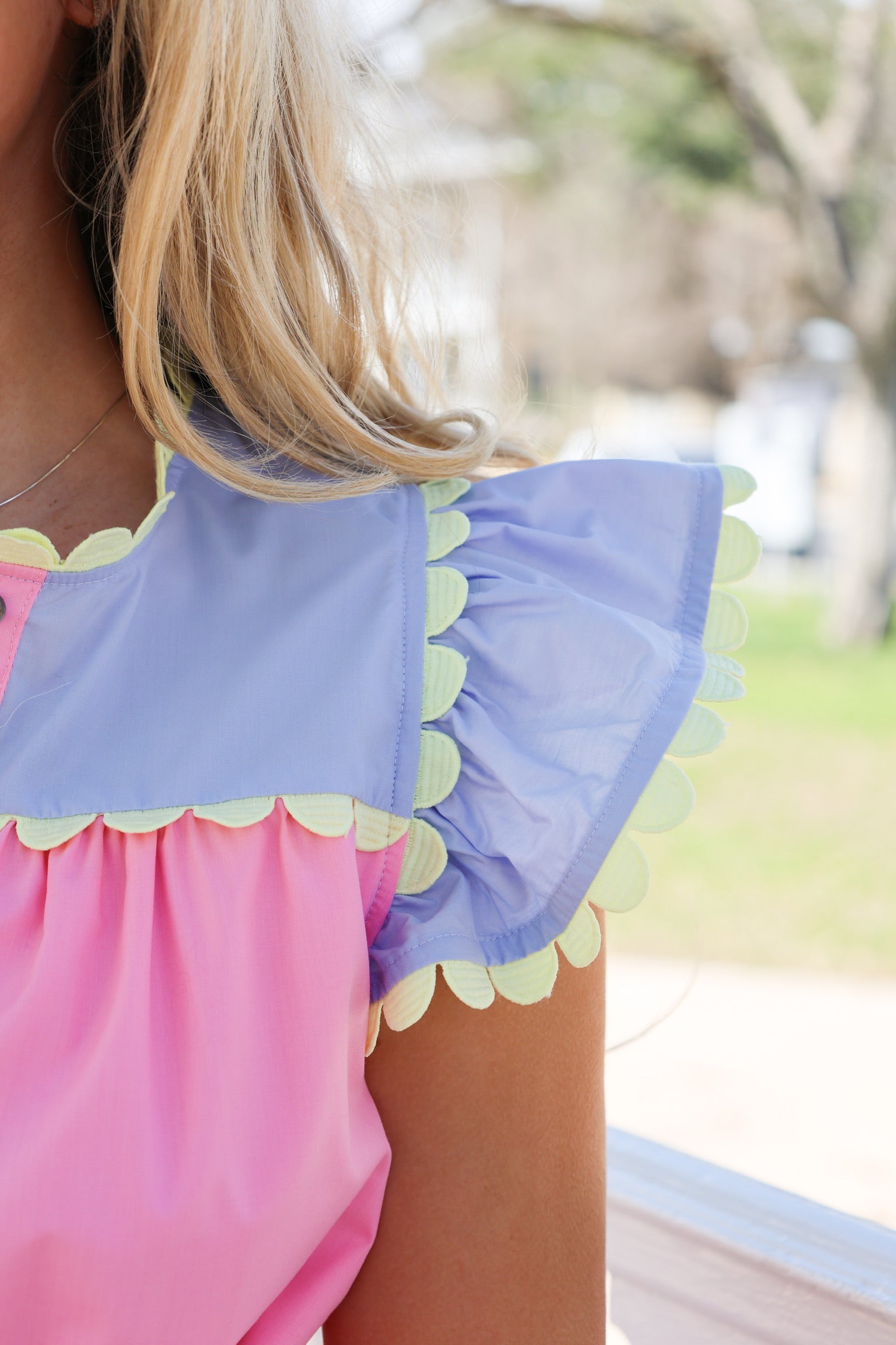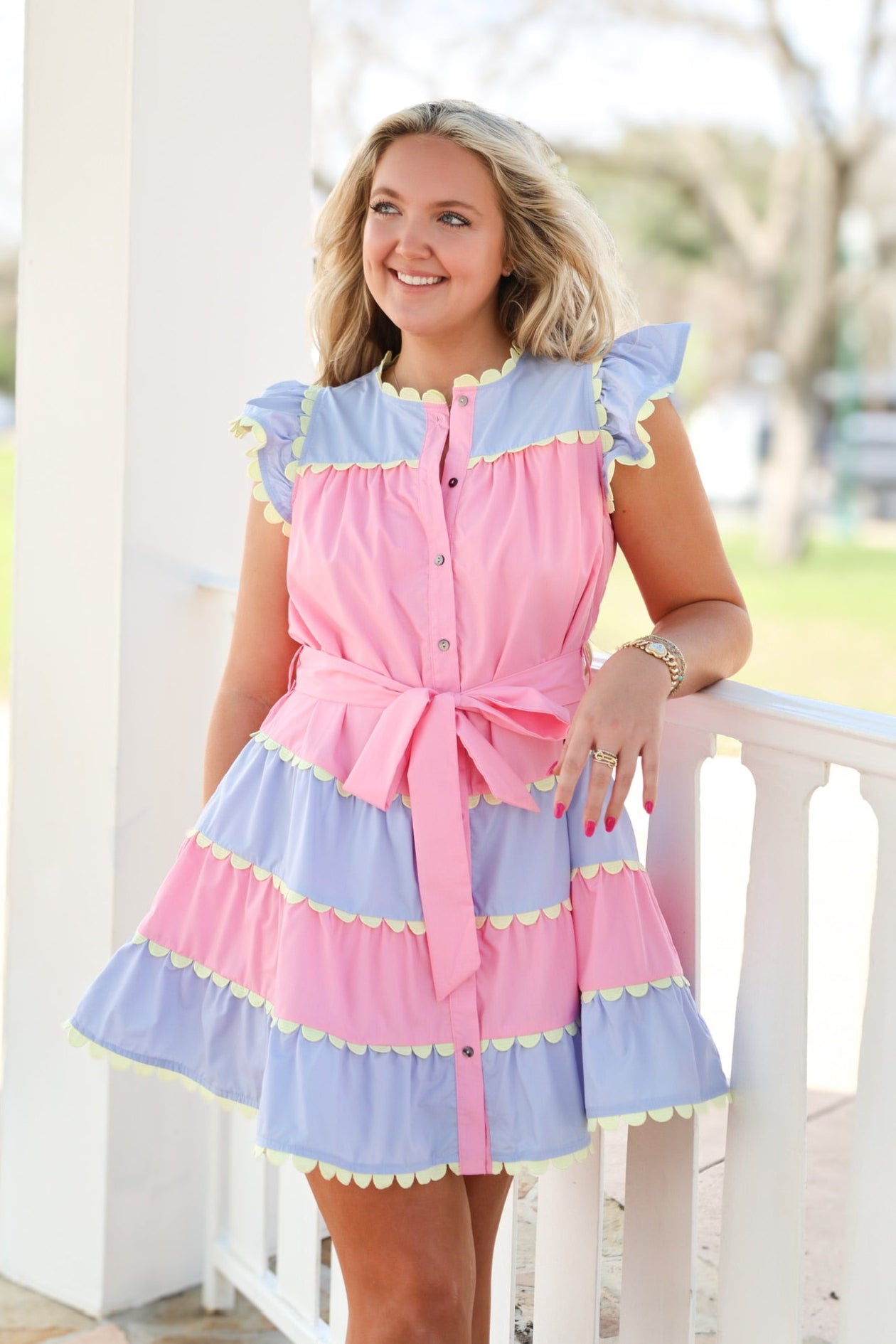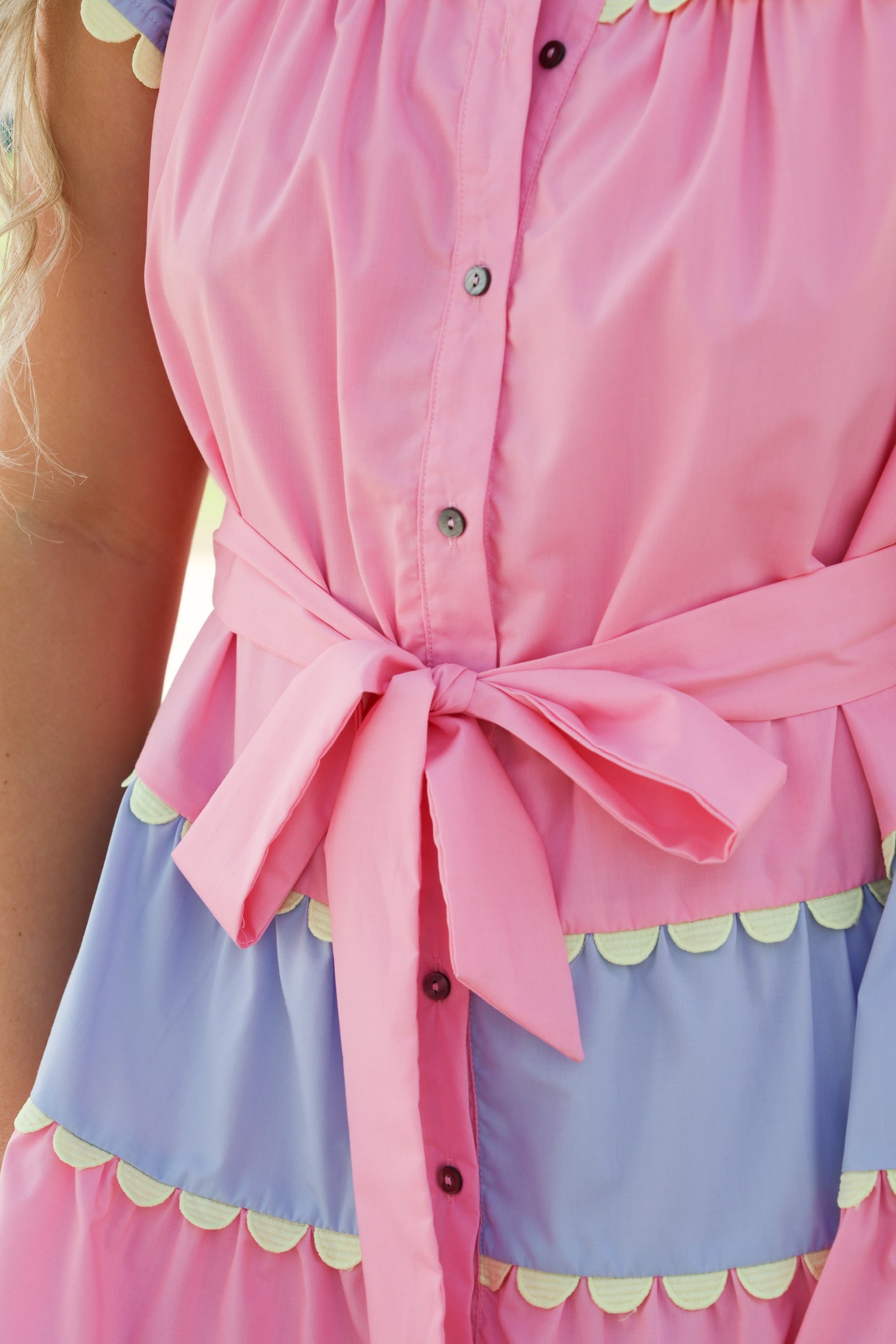 Make a statement with this playful Pink & Purple Mini Dress! Stand out with its vibrant color block design and add a touch of fun with the yellow rik rak trim. Plus, the tie at the waist allows for a customizable fit. Embrace your unique style with this little number.