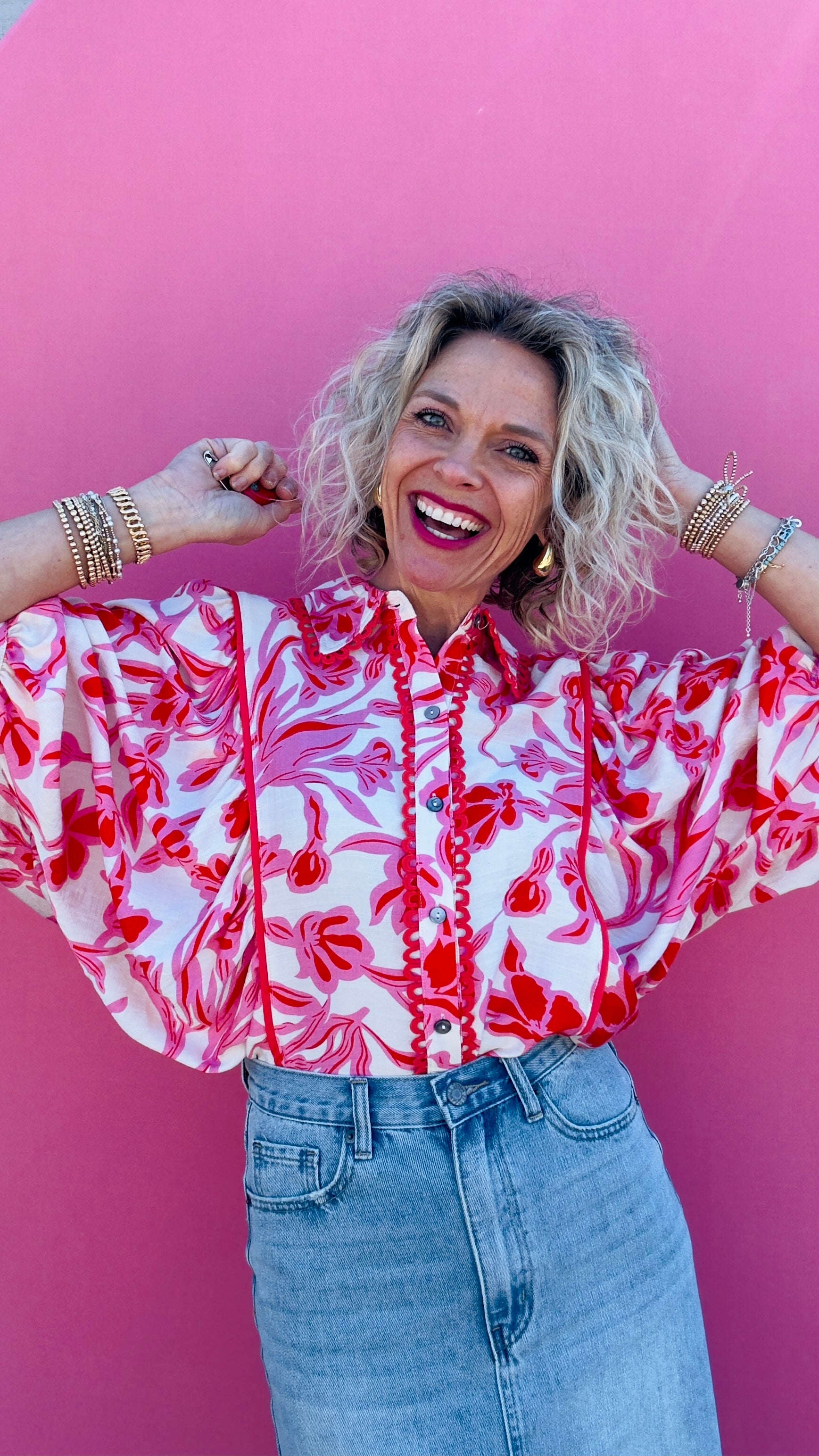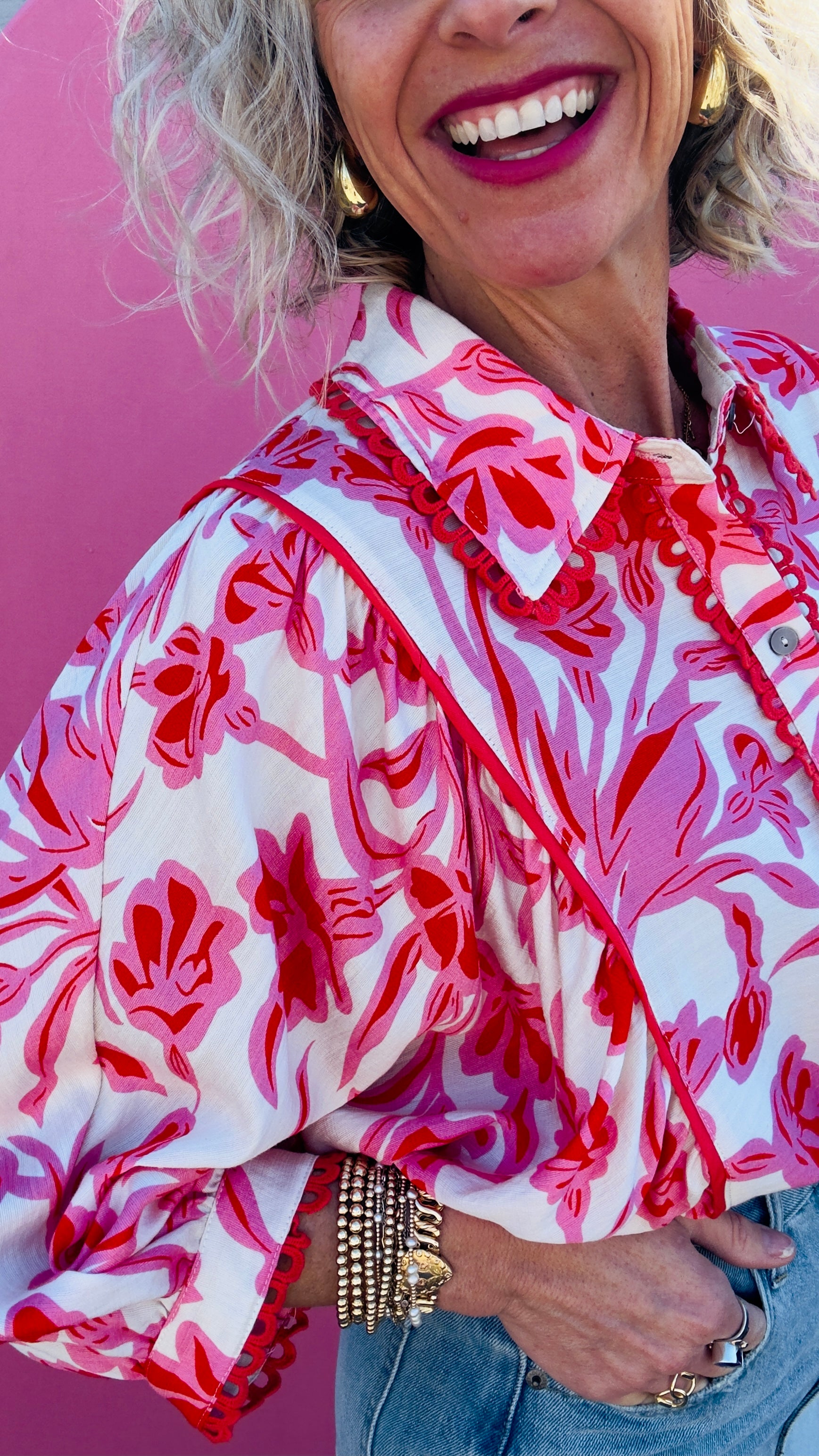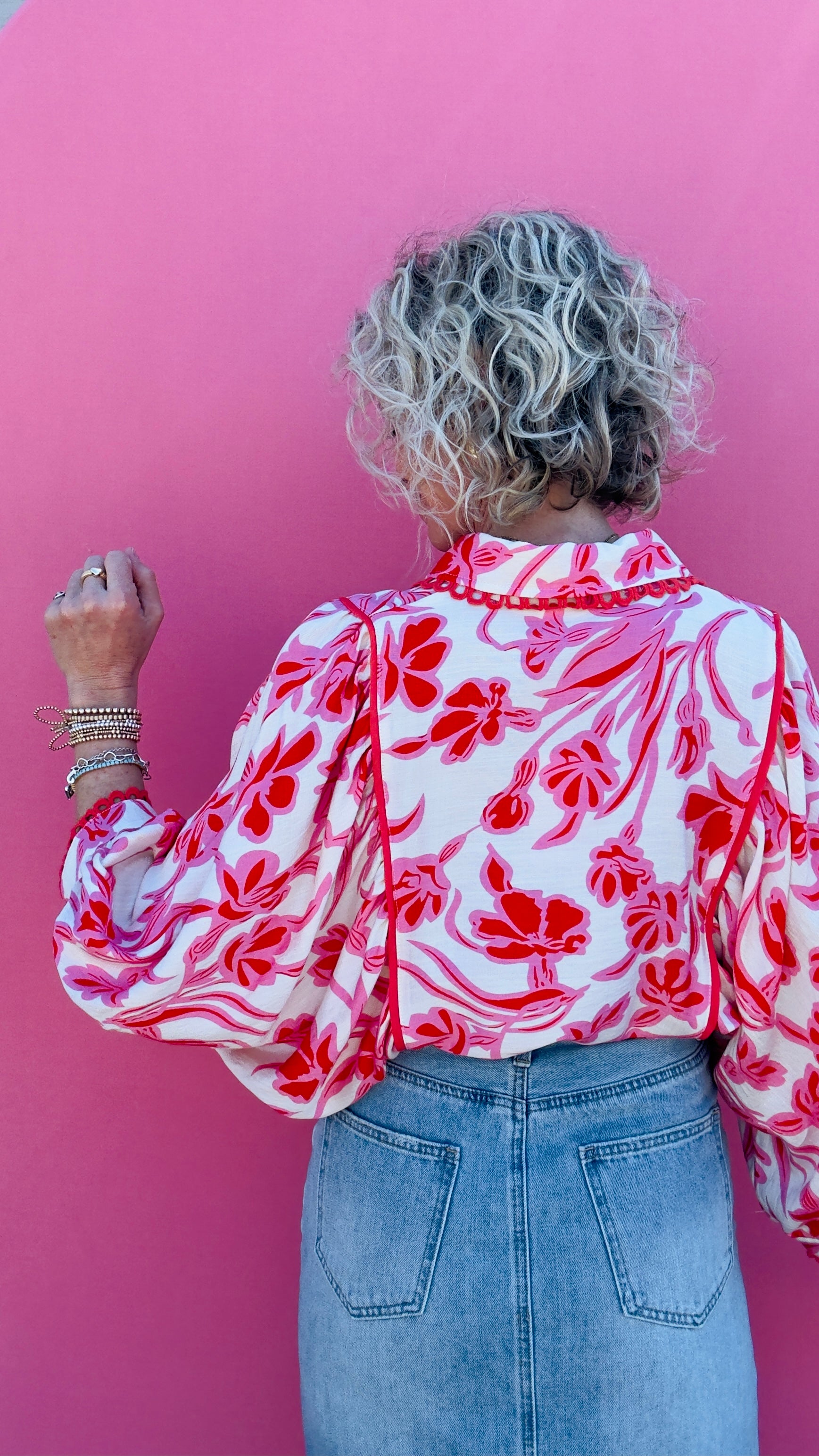 Elevate your wardrobe with our Pink & Red Floral Top. Crafted from luxurious ivory fabric, this top features a stunning pink and red floral design accented with bold red trim. Perfect for any occasion, this top will add a touch of sophistication and elegance to your outfit.