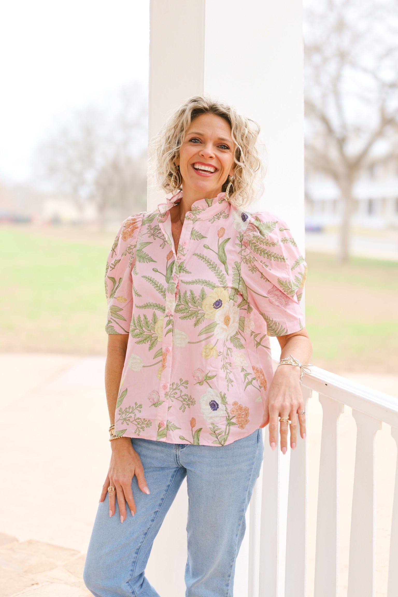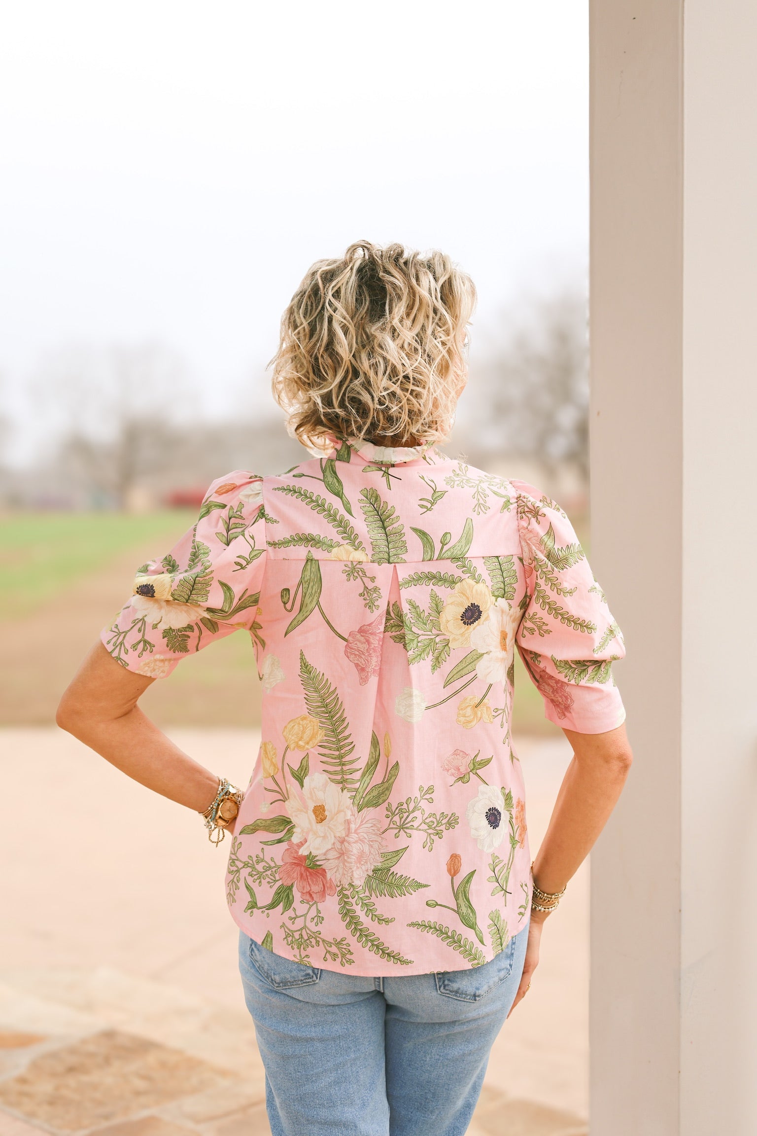 This light weight powder pink garden top with a green floral print will add a touch of spring to your wardrobe. With 3/4 sleeves, this top is perfect for any season and can be dressed up or down.