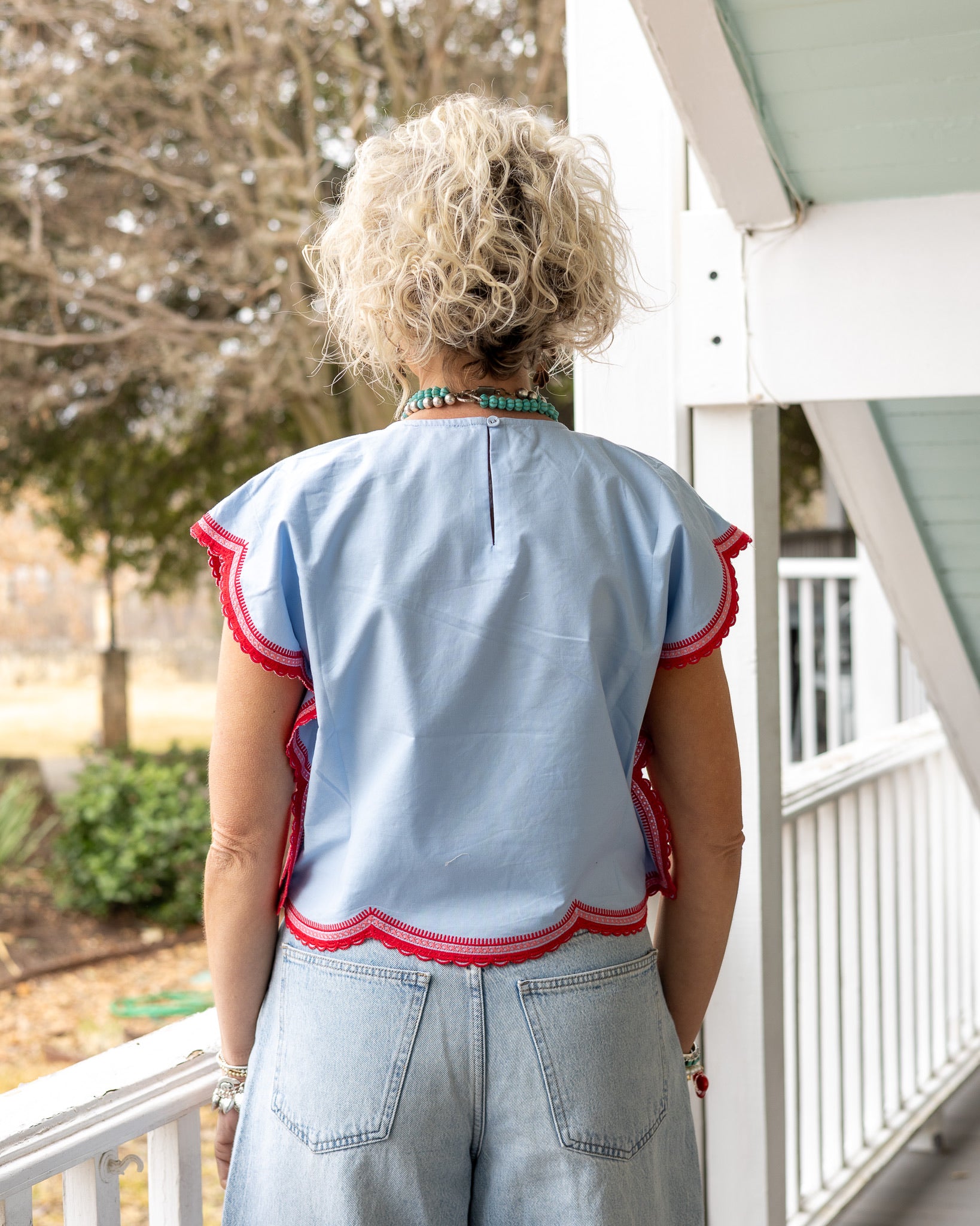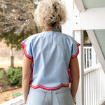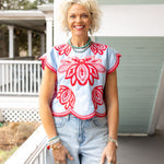 Introducing the Puebla Top—a stunning piece that brings color and charm to your wardrobe! This gorgeous blue top features a vibrant red and pink floral design that pops, while delicate scalloped edges add a touch of whimsy and feminine flair.