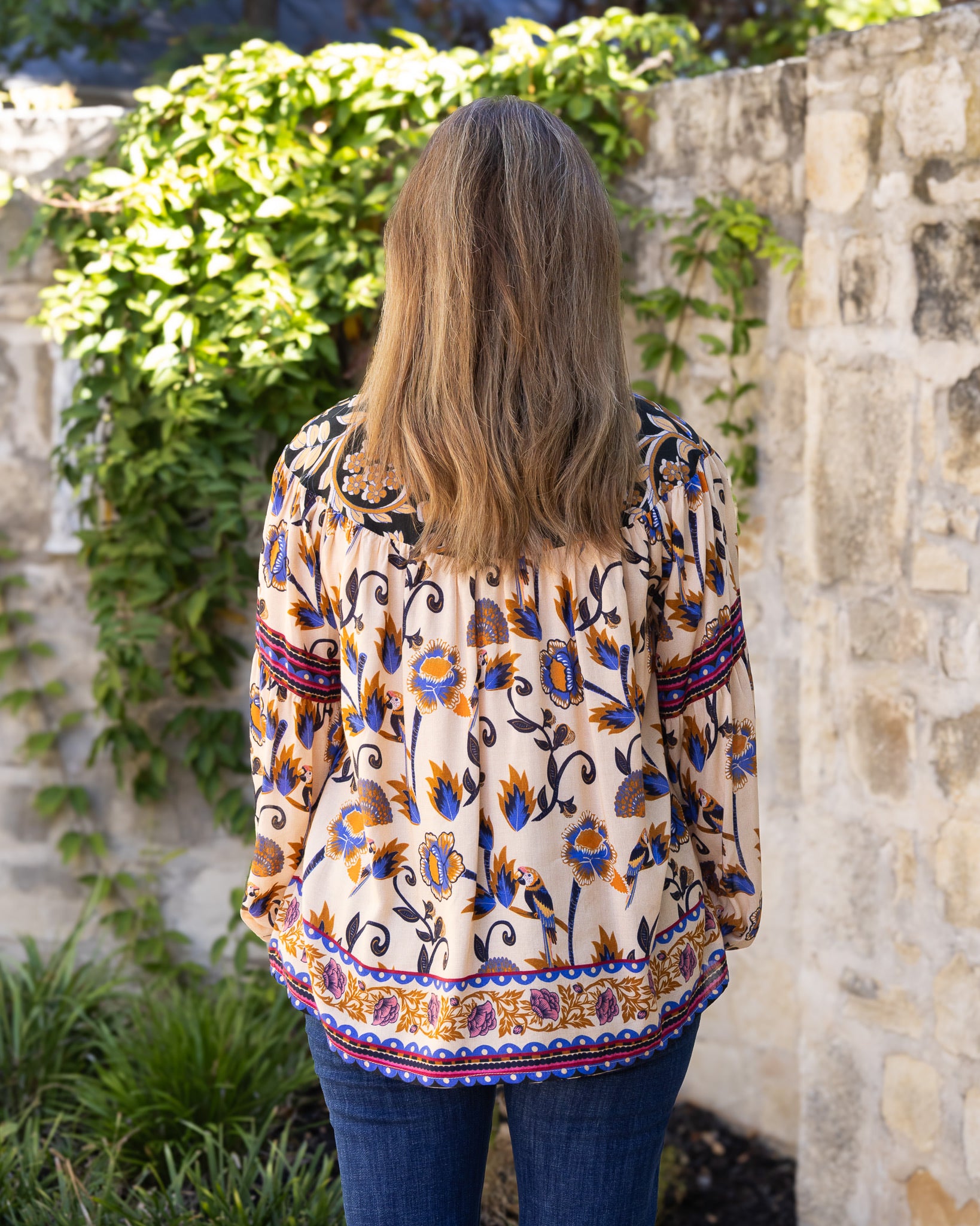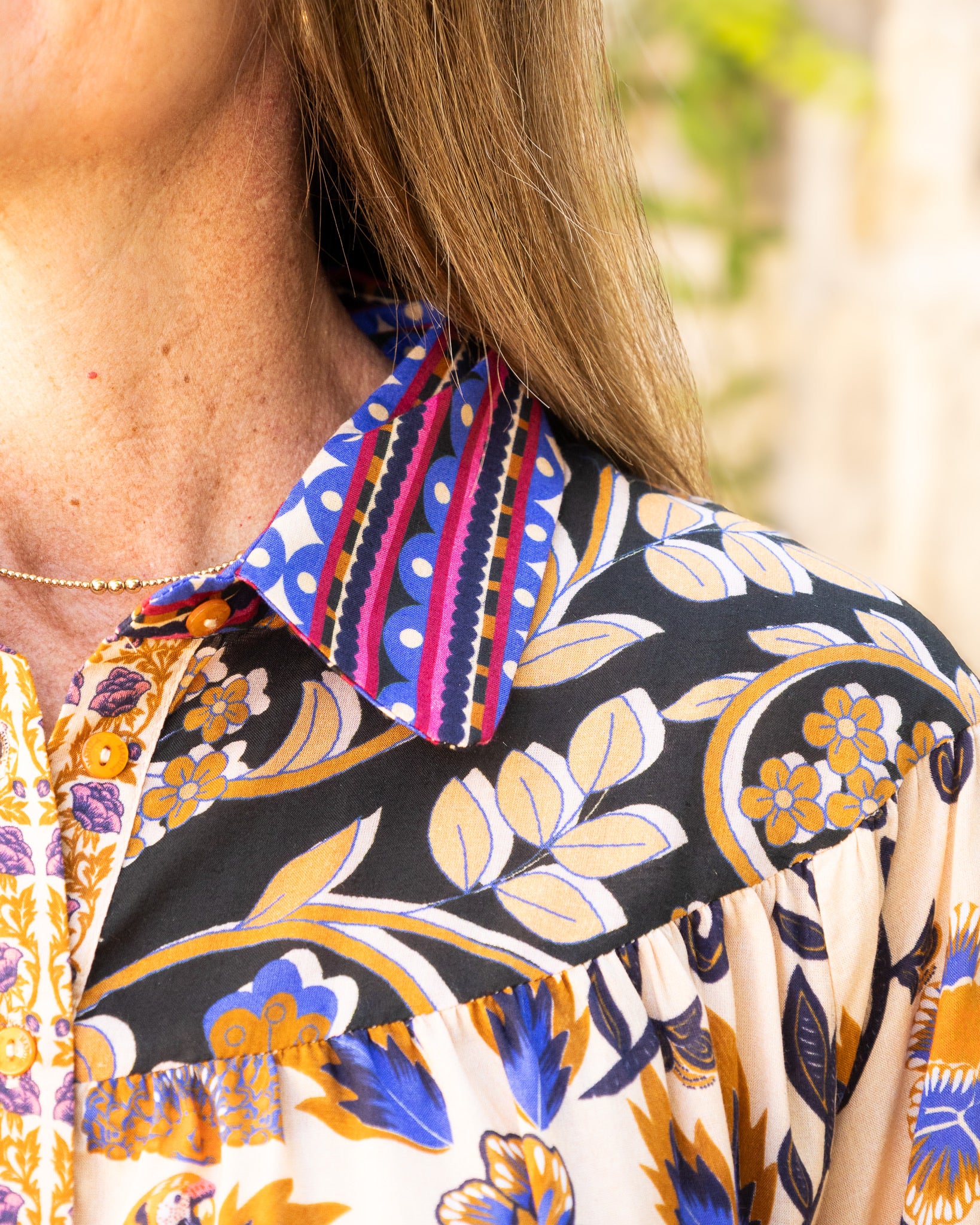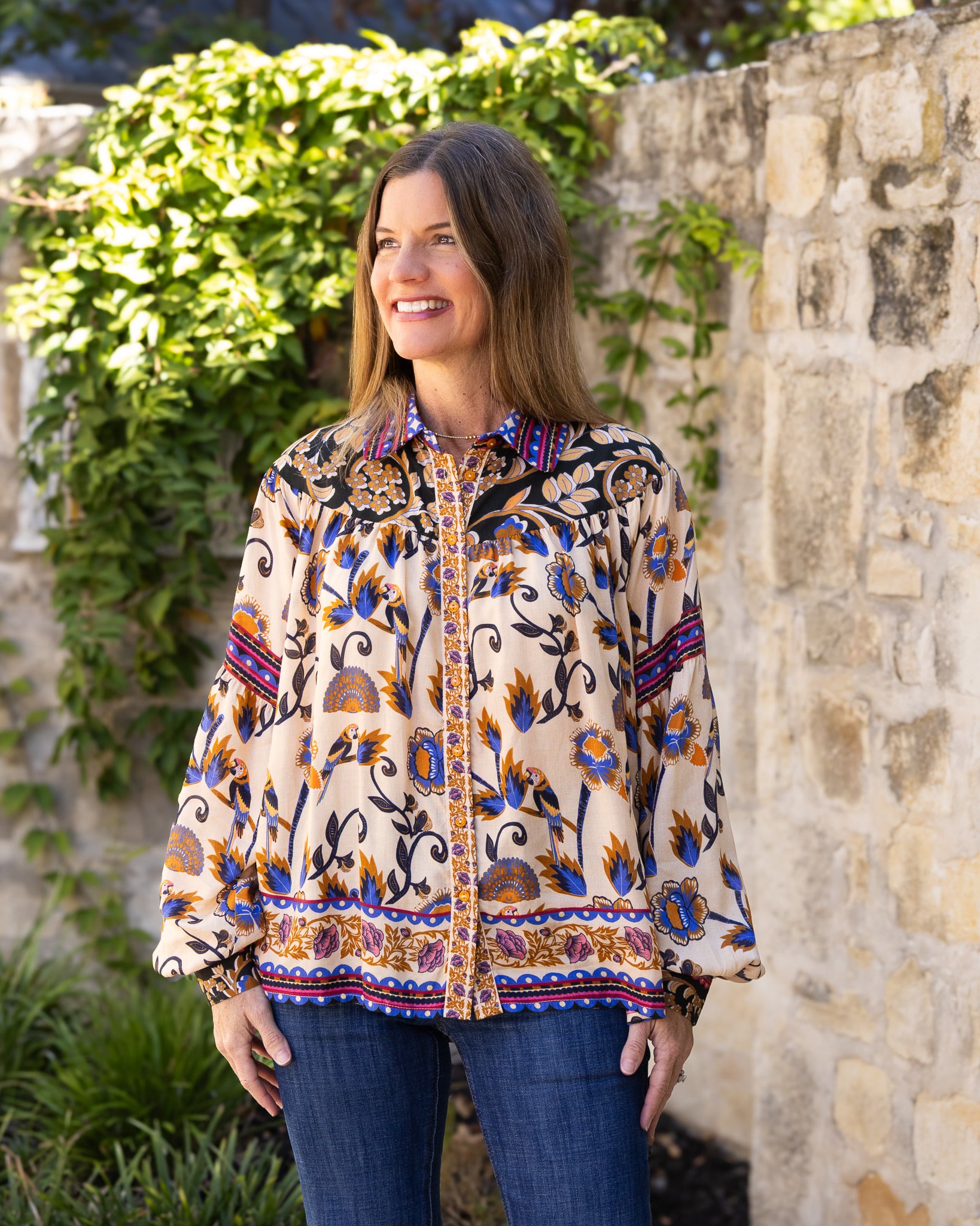 Bring a burst of charm to your wardrobe with the Rahema Floral Long Sleeve Top. Crafted from soft cotton, this vanilla-hued button-down features a playful floral print contrasting boldly on the collar and trim, adding a touch of surprise to classic style. Perfect for layering or wearing solo, it blends comfort with a hint of whimsy for everyday flair.