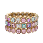 Set of three bracelets to stack together or wear separate. Lots of girlie blush color and irredescent sparkle in this set. Layers perfectly to create a bold playful and colorful set.