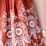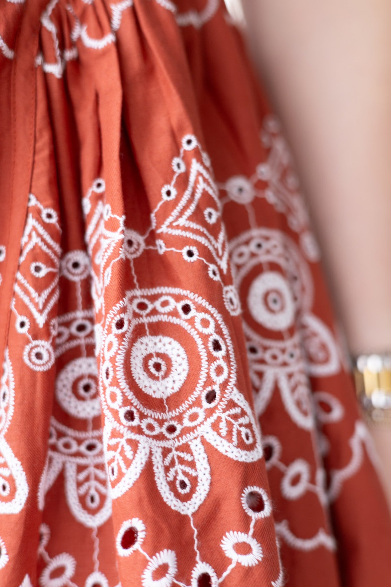 Slip into effortless charm with this brick red mini dress, where delicate embroidery details steal the show. The rich, warm tone flatters every complexion, while the playful embroidered accents add personality and texture. Perfect for date nights, casual outings, or whenever you want to feel put-together without trying too hard. The mini length keeps things flirty and fun, making it a versatile piece that transitions seamlessly from day to night. Dress it up with heels or keep it cool with sneakers—this little number does it all.