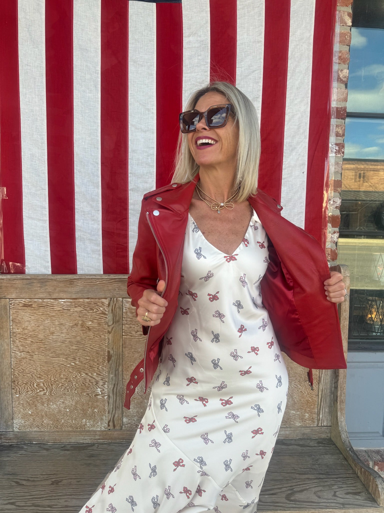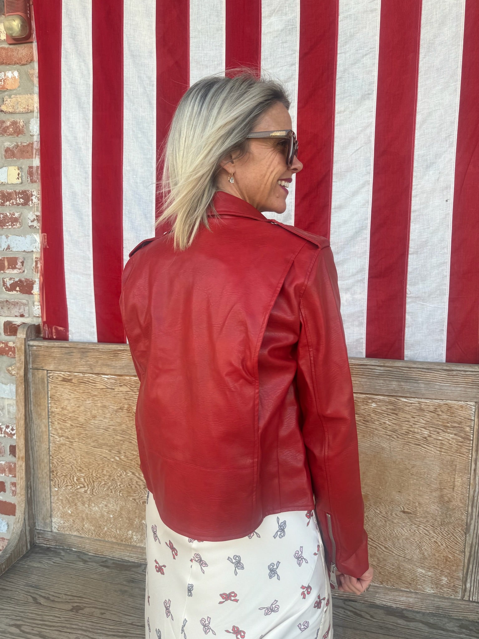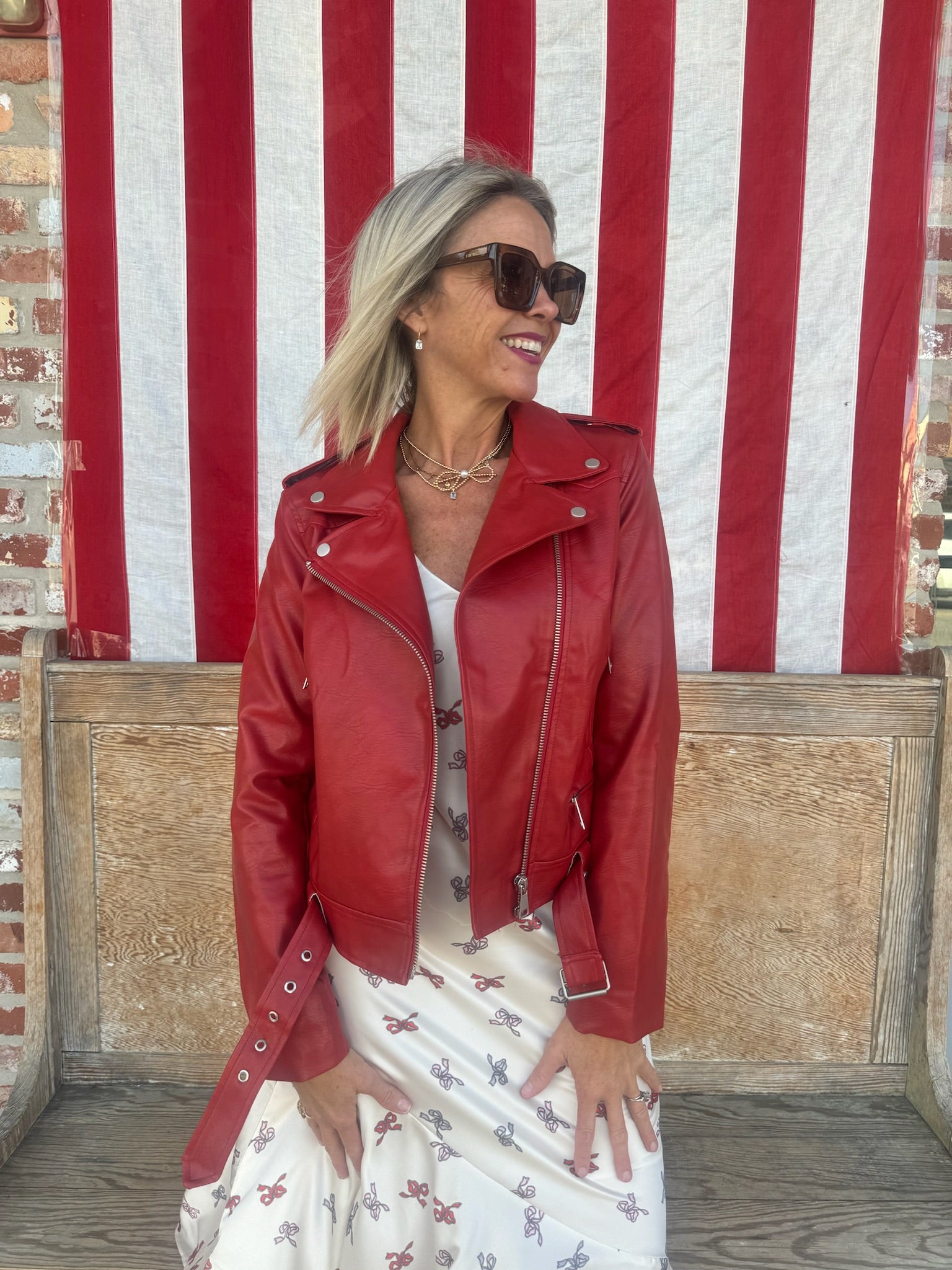 Rev up your style game with our vibrant vegan leather moto jacket. This sassy jacket brings the heat in bold red, giving your outfit a pop of color (and a touch of rebellion). You'll love how this jacket adds an edgy, fashion-forward flair while keeping you cruelty-free.