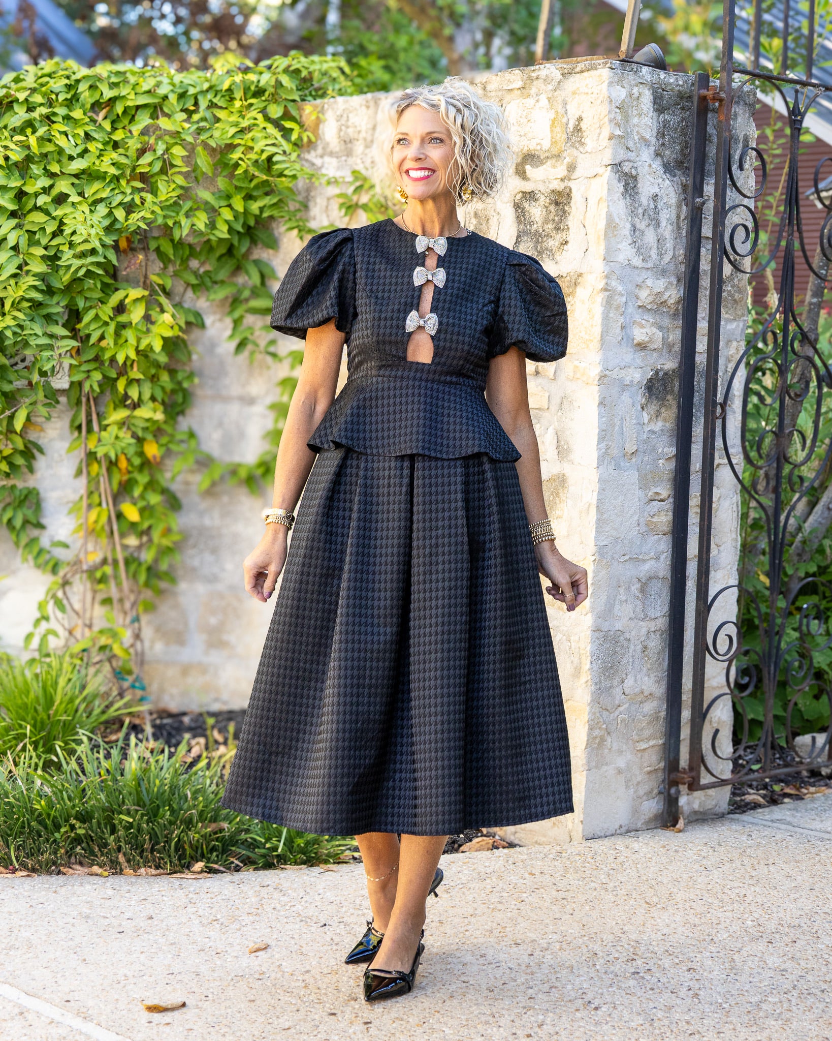 REINA SKIRT A chic fit-and-flare midi skirt in classic Black and gray houndstooth print, the Reina skirt’s elegant pleating details add texture and movement. Designed with a stylish flounce hem for a feminine touch, this skirt also includes a convenient side pocket for practicality. Perfect for sophisticated daywear or polished office looks.