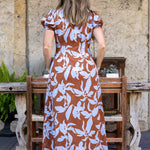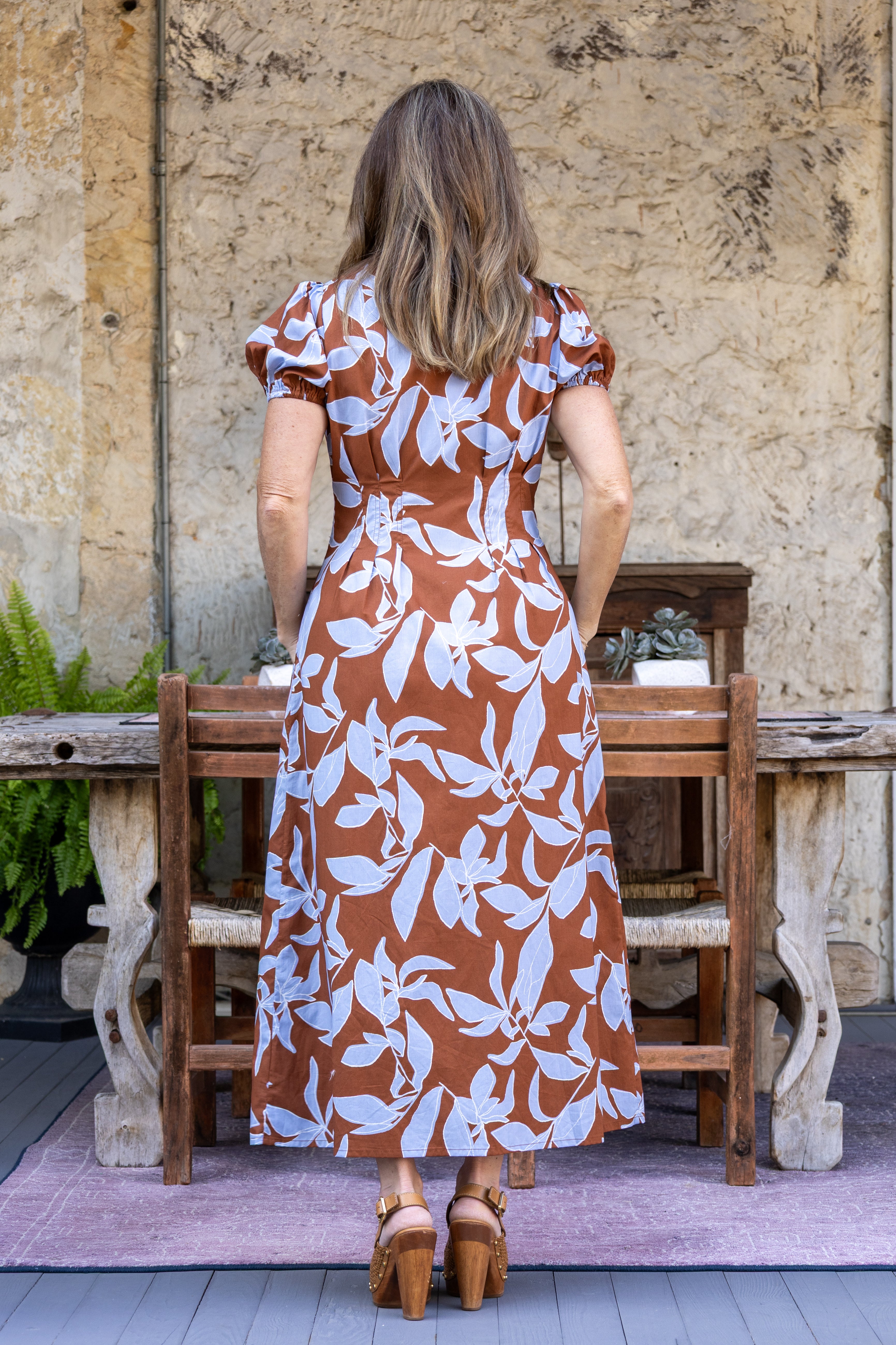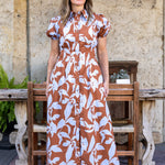 Bring a burst of charm to your wardrobe with the Rosey Haze Shirt Dress. Featuring brown and blue floral prints, this playful midi dress combines short sleeves with a button-down front for a breezy, flattering fit.