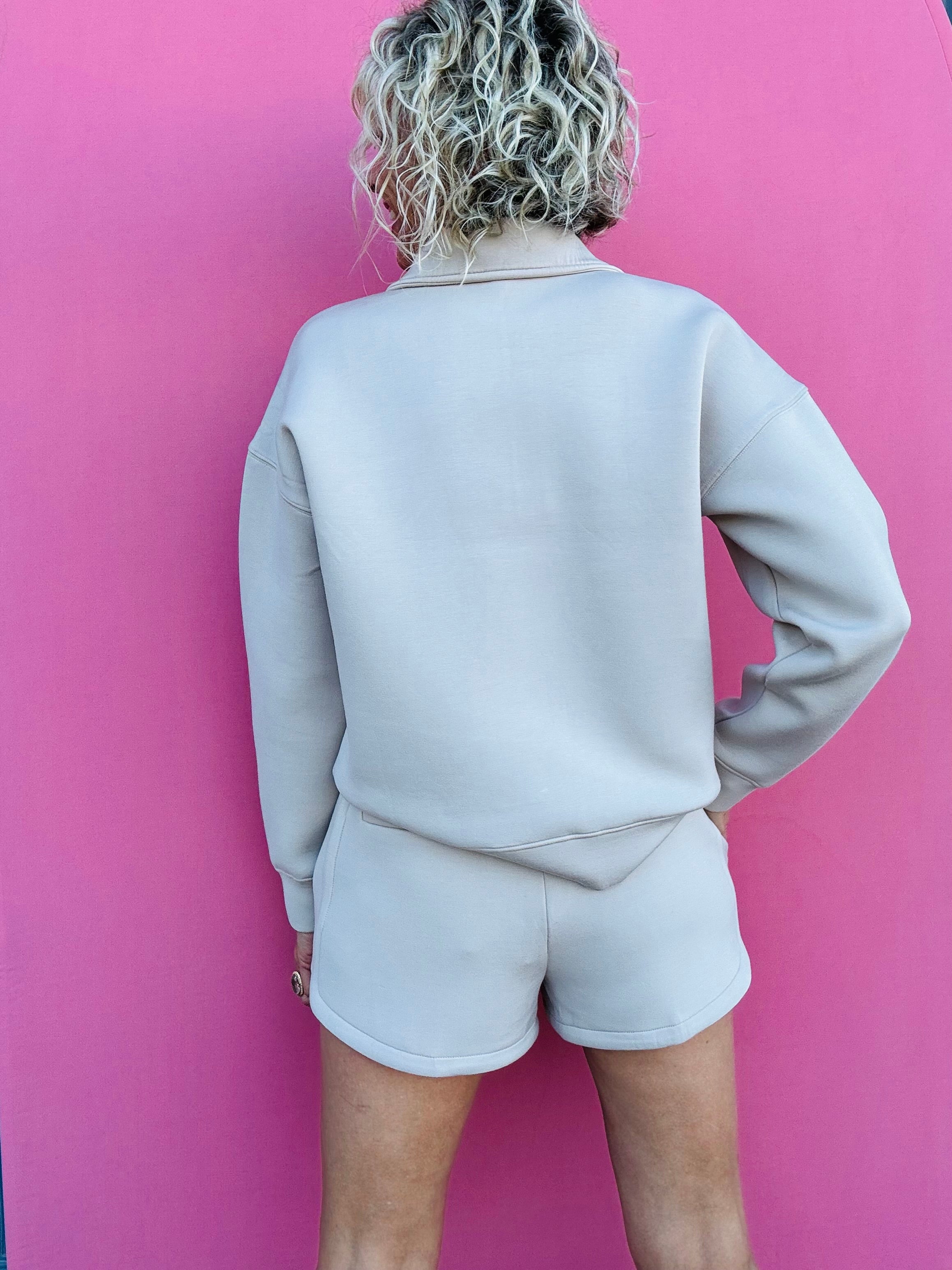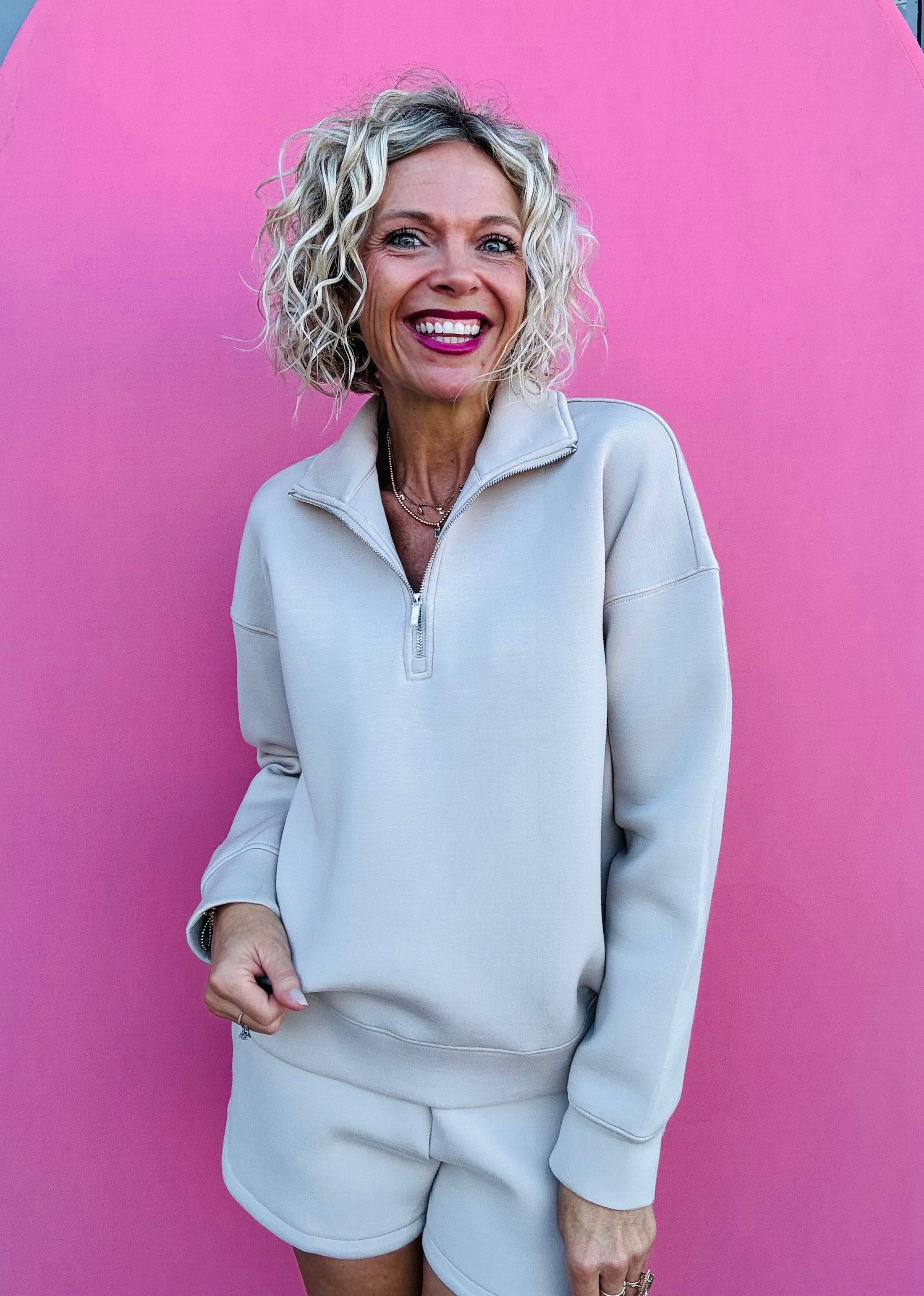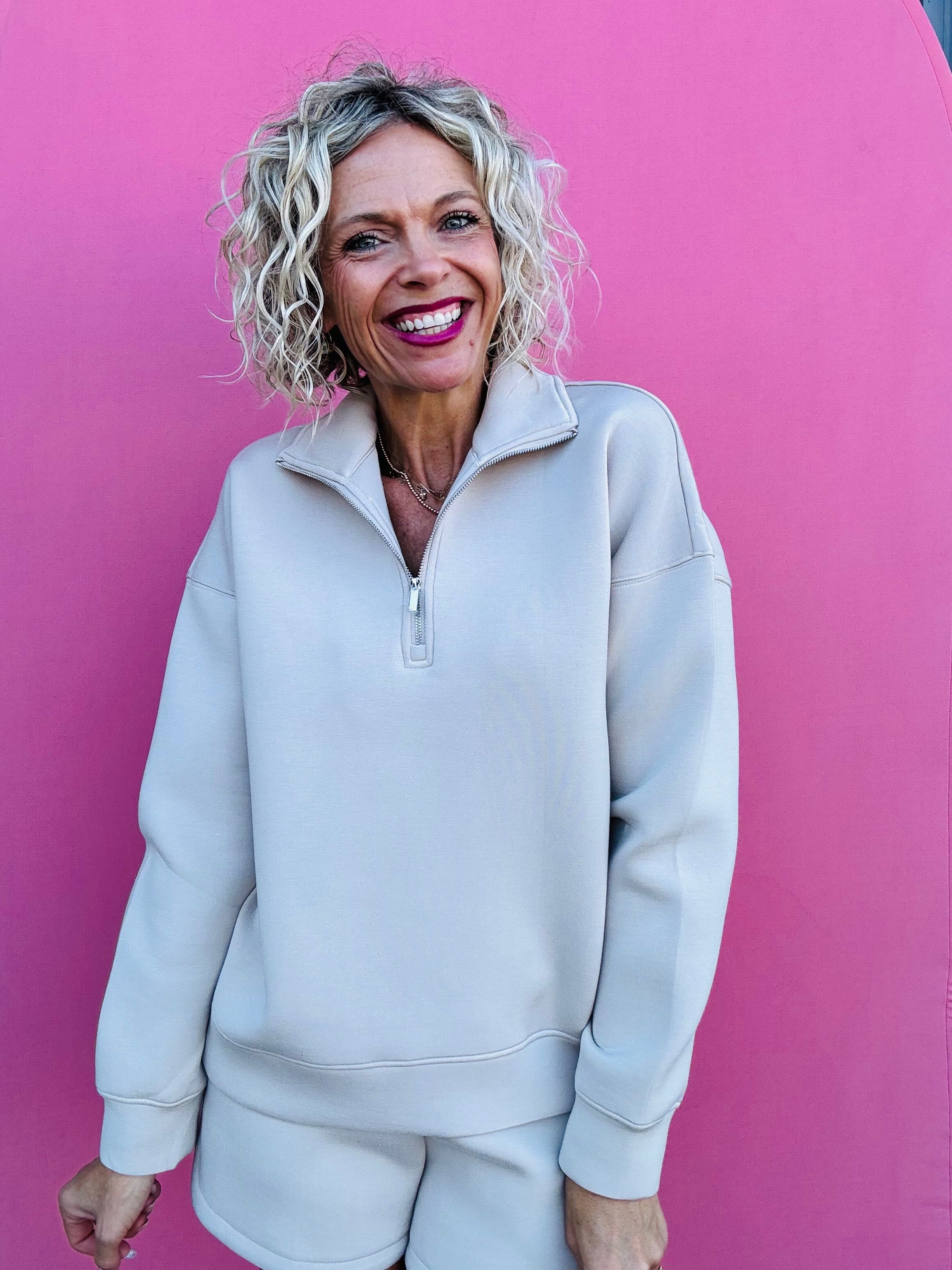 Unleash your playful side with our Scuba Top! This taupe-colored top features a 3/4 zip and long sleeves for a chic and comfortable fit. Plus, you can complete the look with our matching shorts for a fun and coordinated outfit.