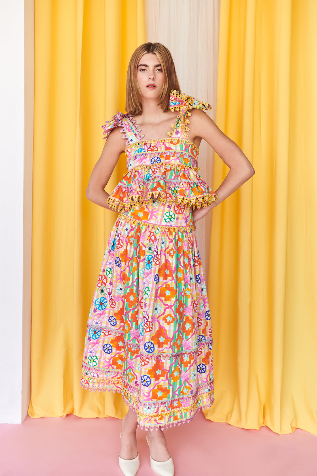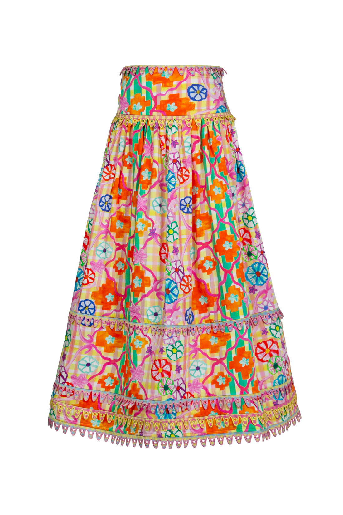 Add a burst of color to your wardrobe with this captivating midi skirt, with vibrant floral and geometric patterns. Finished with small scalloped trims for a special touch, this skirt flares out beautifully, creating a breezy and eye-catching silhouette. Perfect for pairing with fitted tops or blouses for an effortlessly chic summer look.