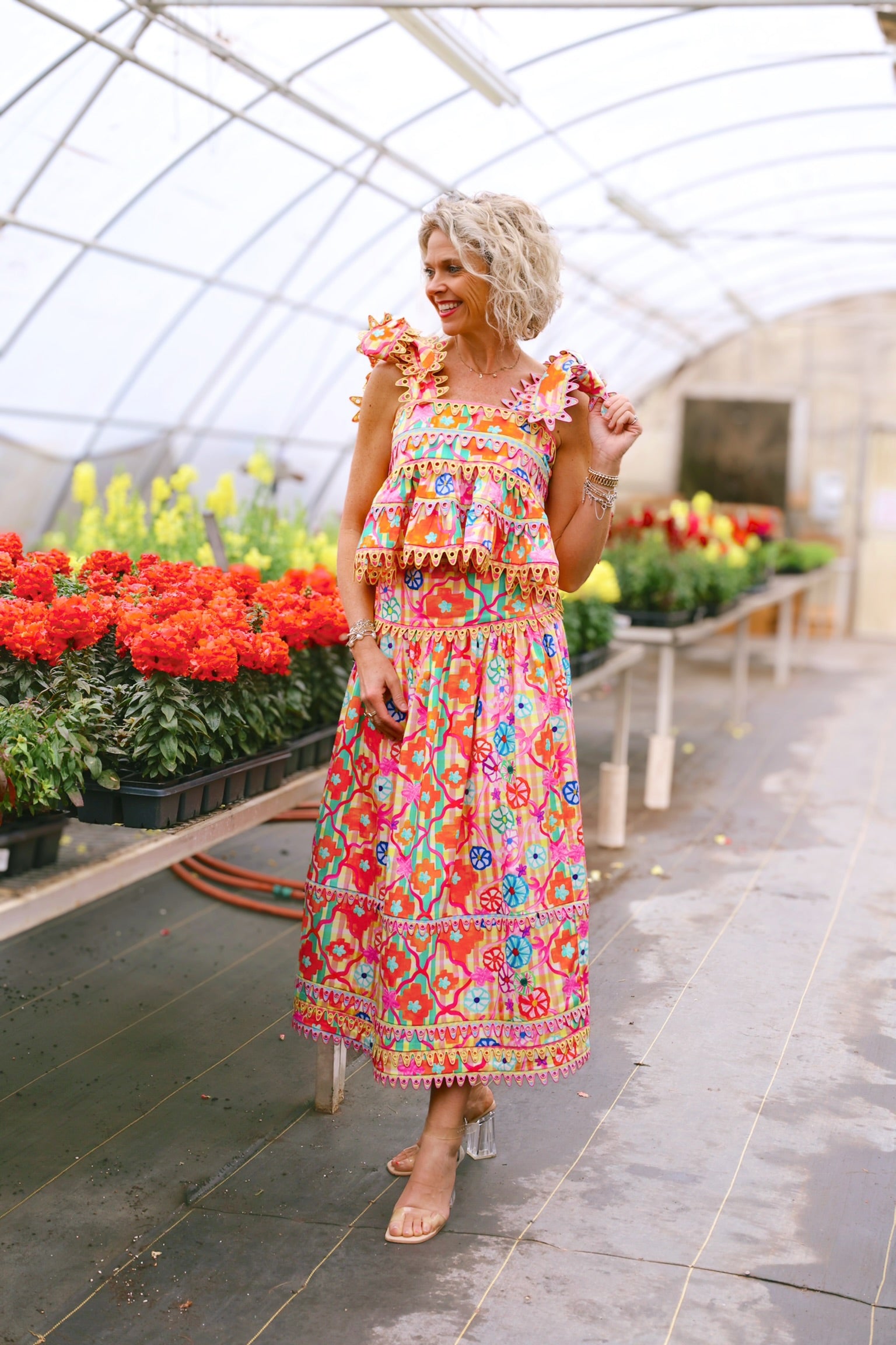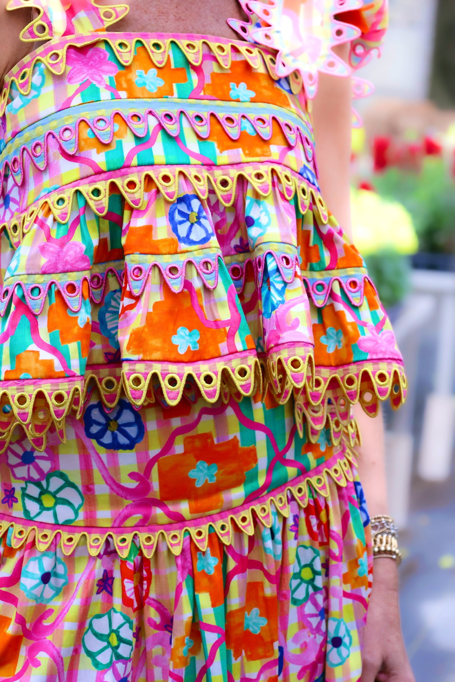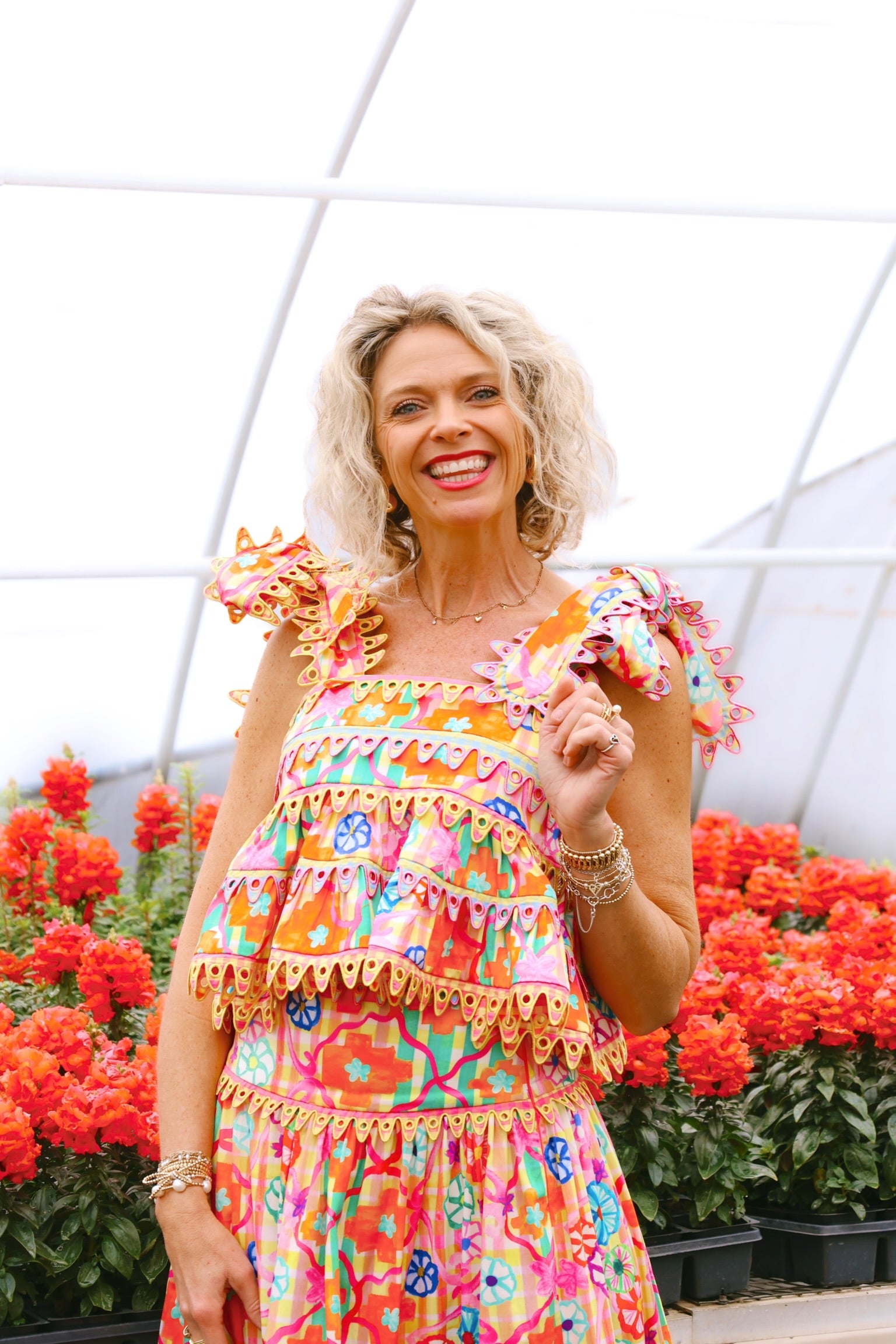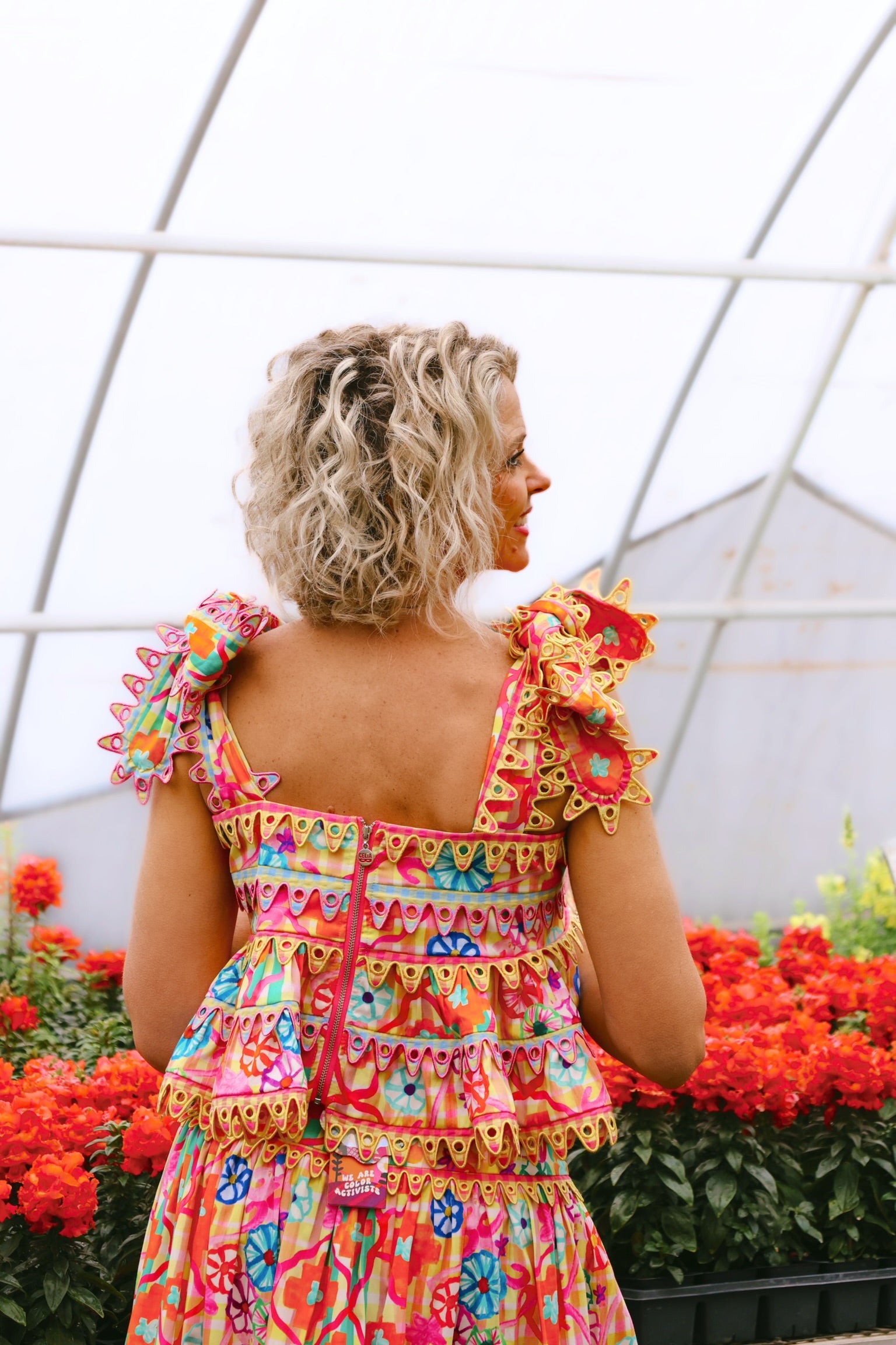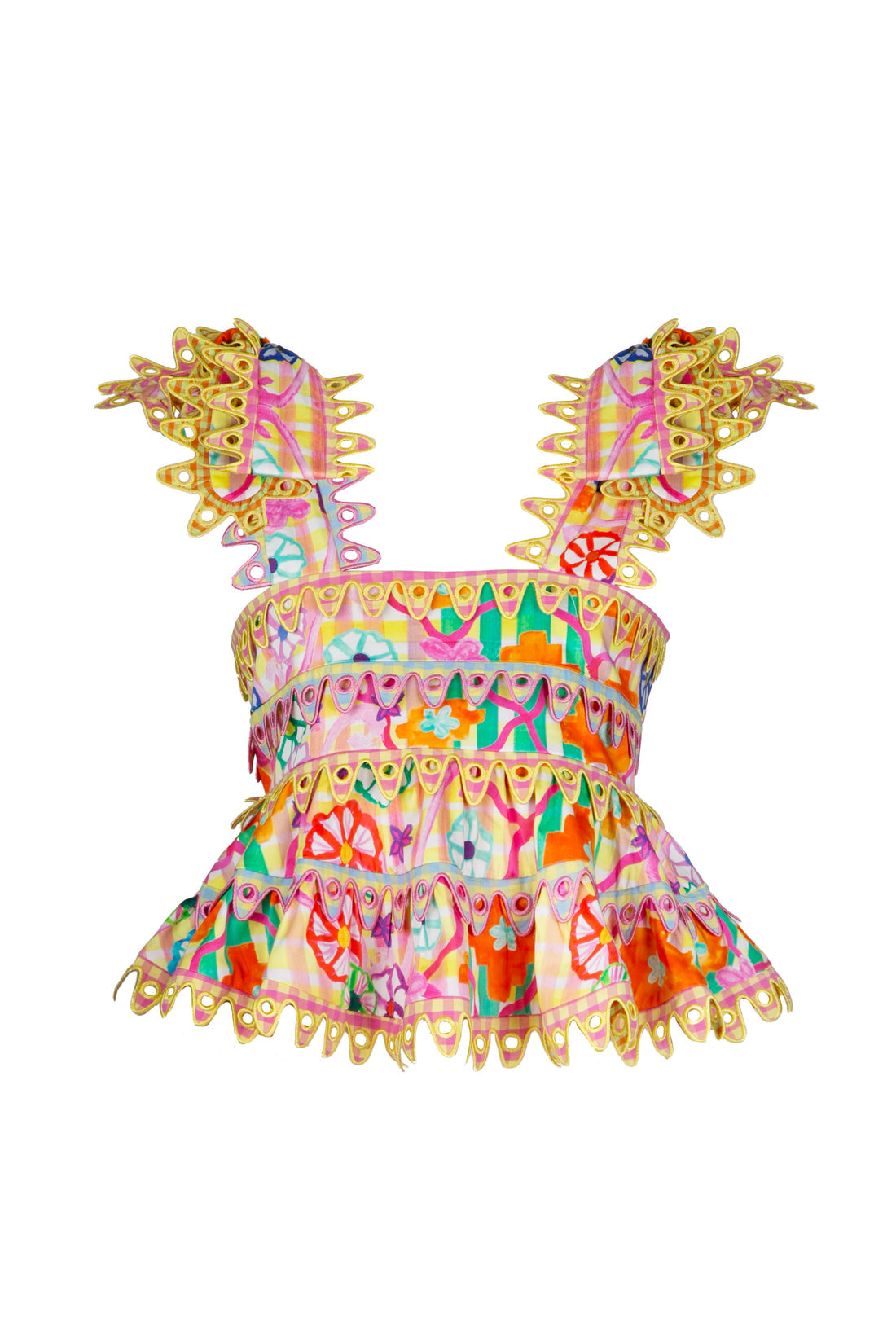 The Serene top is vibrant, cropped and adorned with multi-tiered scalloped trims and eye-catching, colorful patterns. Featuring tie-up ruffled straps and a fitted bodice, this piece can be paired with the matching skirt, or let your imagination flow with the perfect bottom! Matching Serene Skirt available.