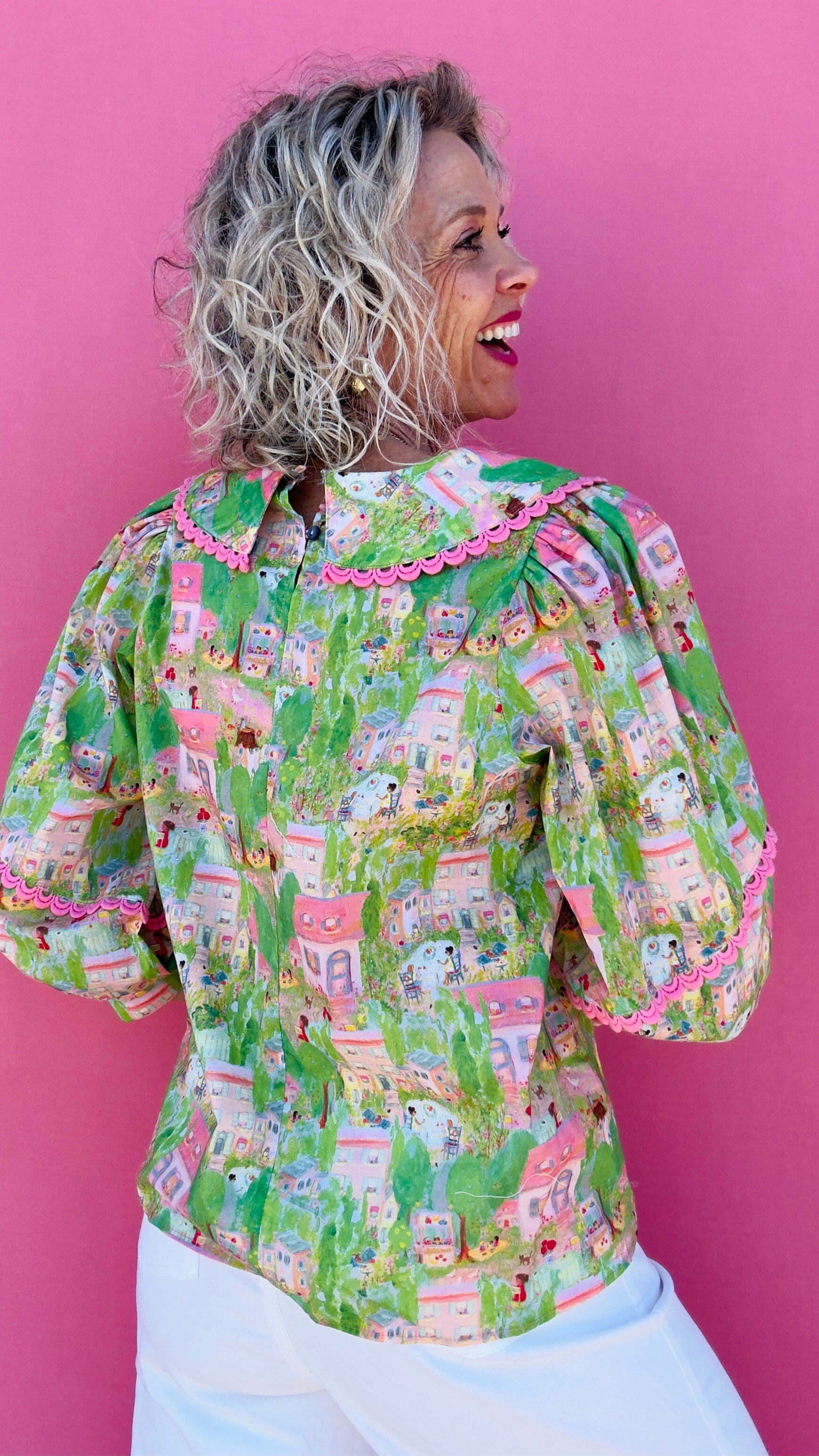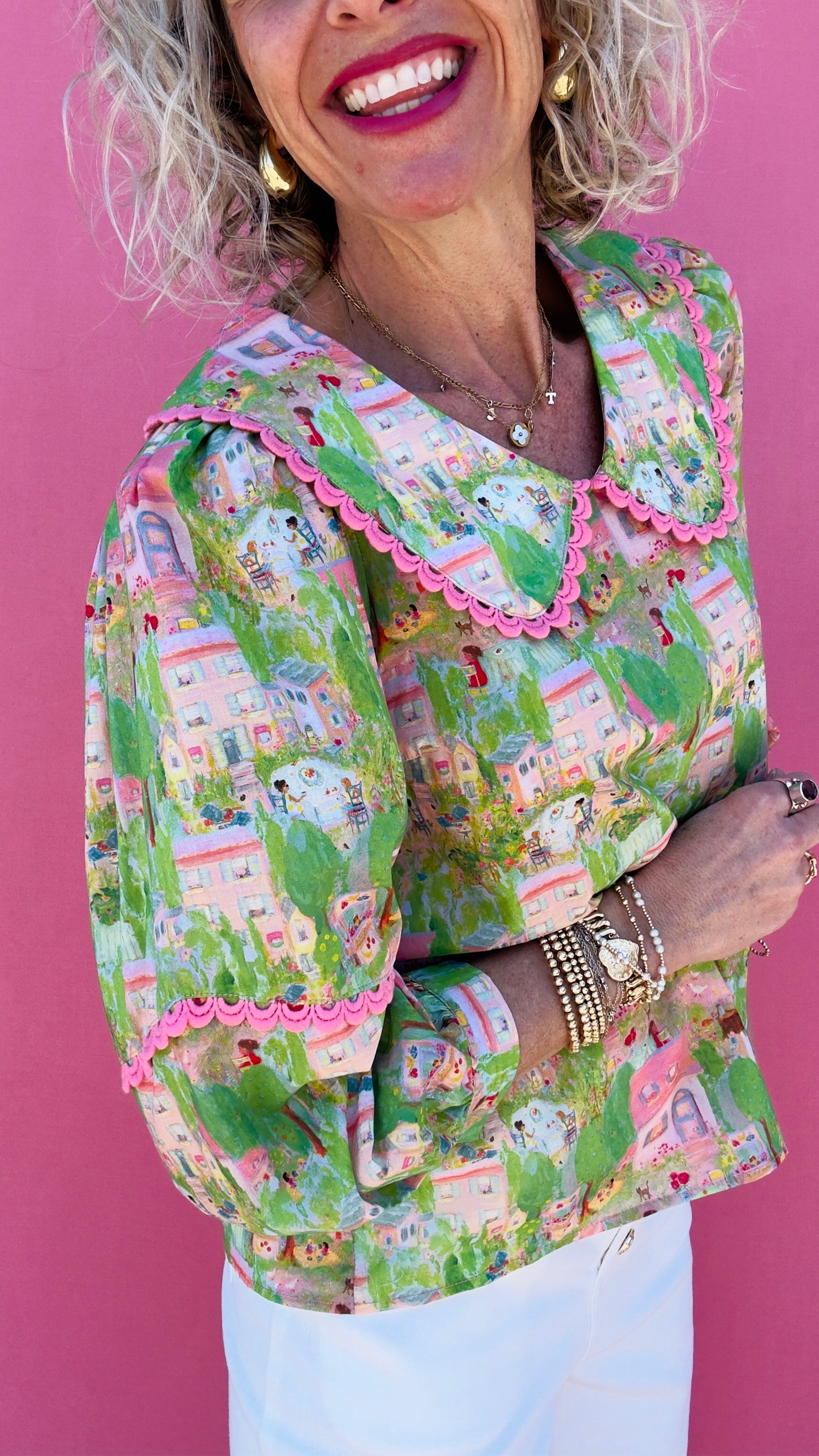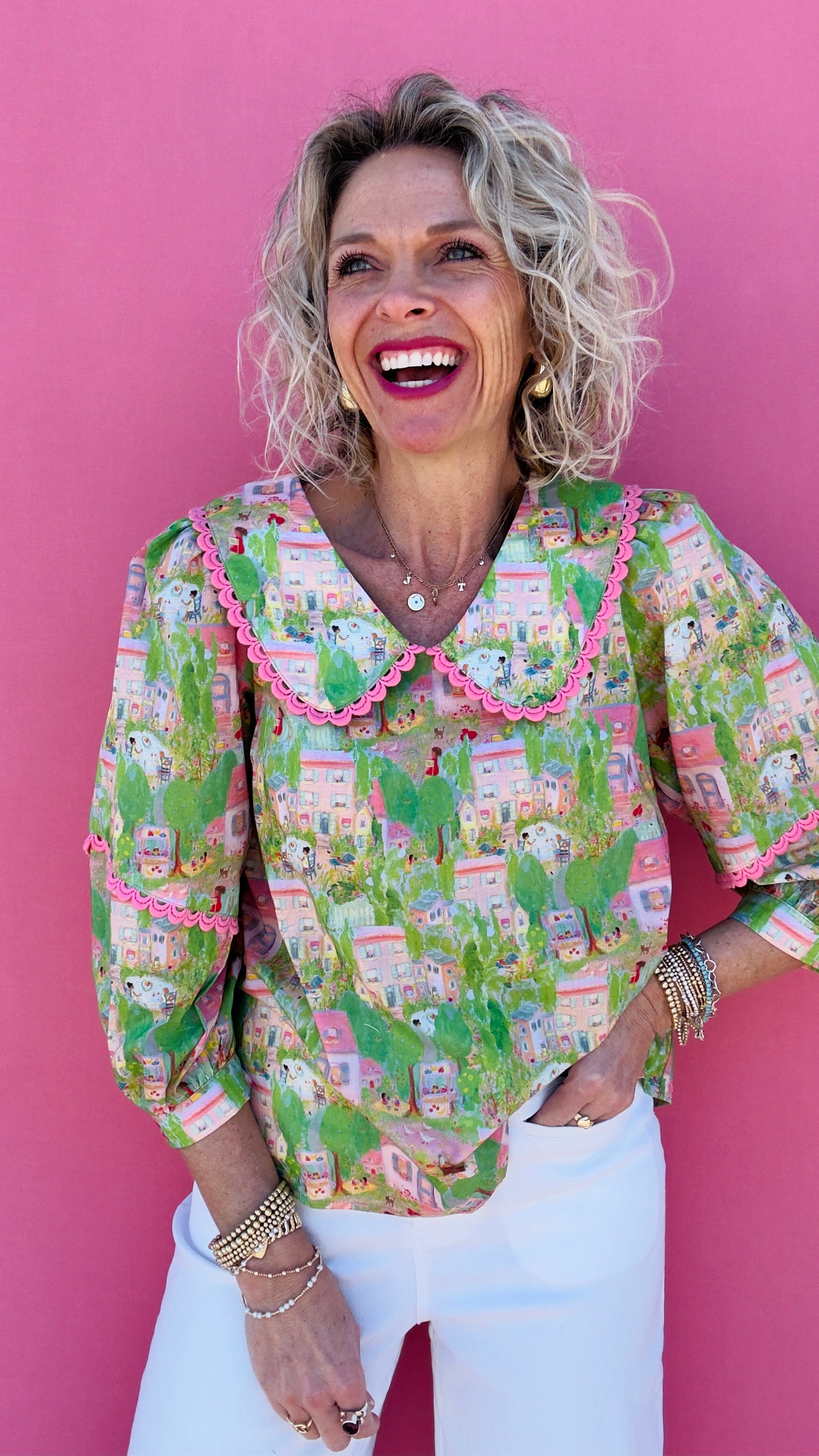 Introducing the Sevilla Summer Top! This playful top features 3/4 sleeves and a vibrant green and pink print. Stay cool and stylish this summer with this quirky and fun addition to your wardrobe.