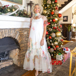 Float through your day in this sheer ivory floral maxi dress, featuring a delicate ivory colored slip. The playful tie drapes elegantly at the back of your neck, adding a flirty finish to this effortlessly chic look.