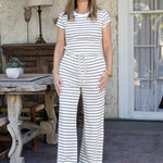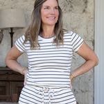 Step out in effortless style with the playful Stip Knit Tee and matching pants set. Featuring ivory and black stripes on a soft knit fabric, the short-sleeve tee pairs perfectly with comfy coordinating pants for a fun, relaxed look. Ideal for lounging or casual outings, this duo keeps you cozy while adding a touch of spirited charm to your wardrobe.