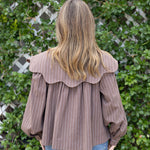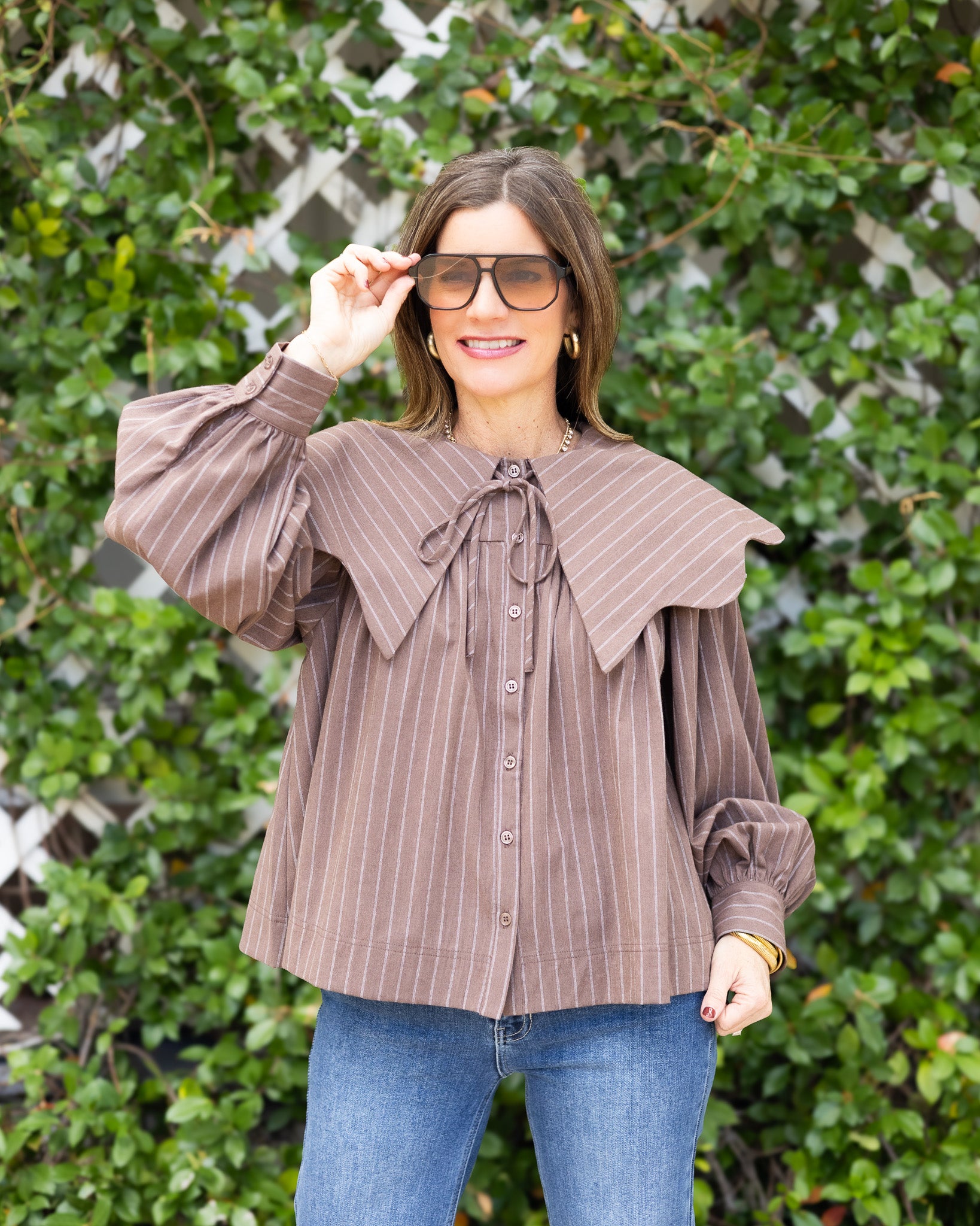This playful stripe Peterpan collar top features long sleeves and a charming button-up front, perfect for adding a touch of vintage whimsy to any outfit. The delicate tie detail enhances its feminine appeal, making it a fun and stylish choice for day or night.