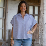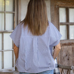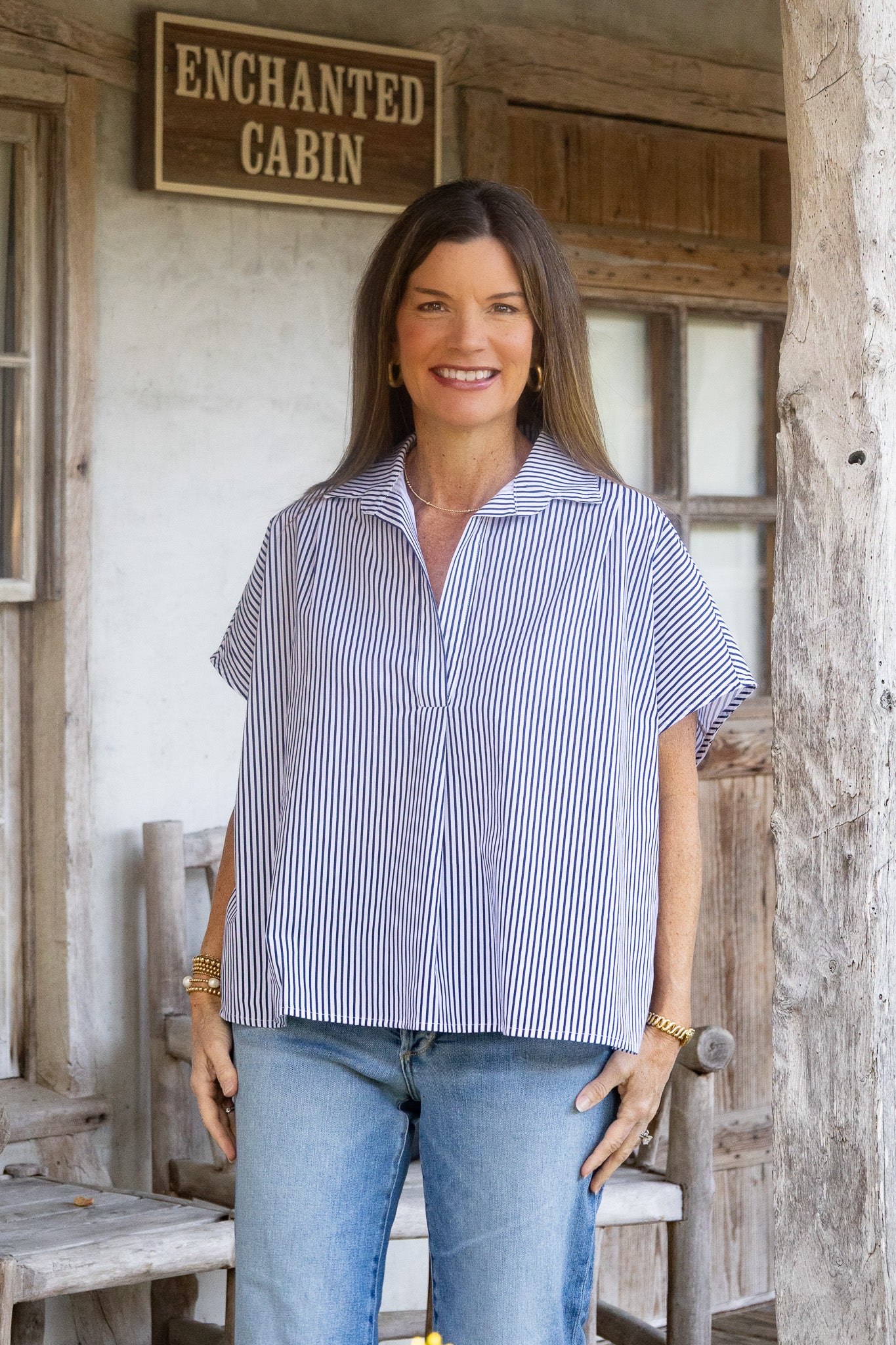 Add a splash of charm to your wardrobe with this playful navy and white stripe V-neck top. Its signature collar brings a flirty twist to classic stripes, perfect for brightening up any casual day. Soft, breathable fabric keeps you comfy whether you're out with friends or cozy at home. Effortless style has never looked so fun!