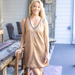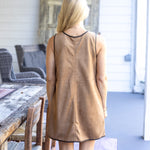 Slip into effortless elegance with this mocha suede shift dress. The sleek v-neck and sleeveless silhouette create a chic, minimalist vibe perfect for layering or going solo. Crafted from luxurious suede, this mini shift dress transitions seamlessly from casual brunch to evening plans. The relaxed fit and timeless mocha hue make it a versatile wardrobe essential that pairs beautifully with everything from sneakers to heels. Pure sophistication, zero fuss.