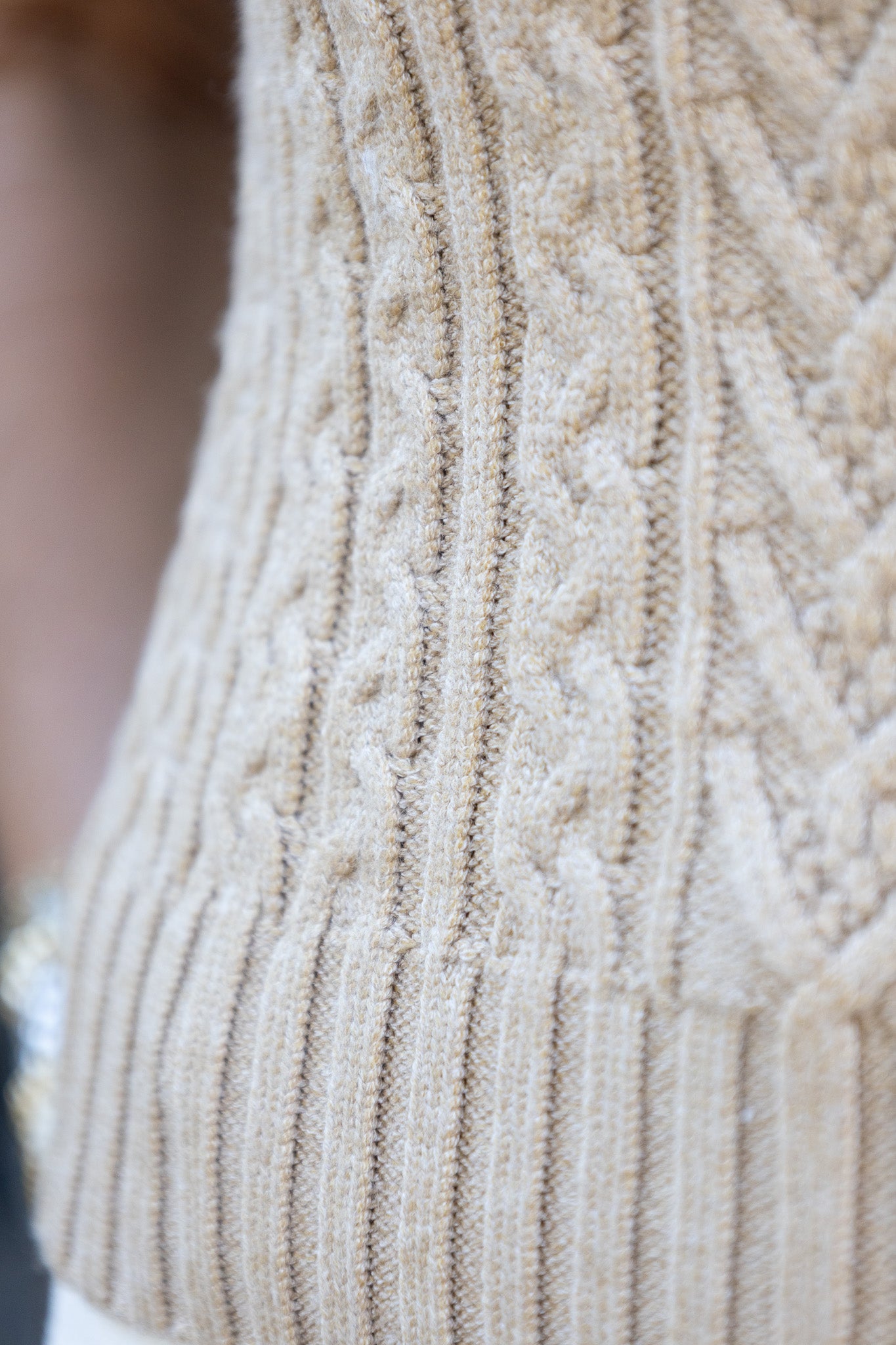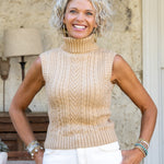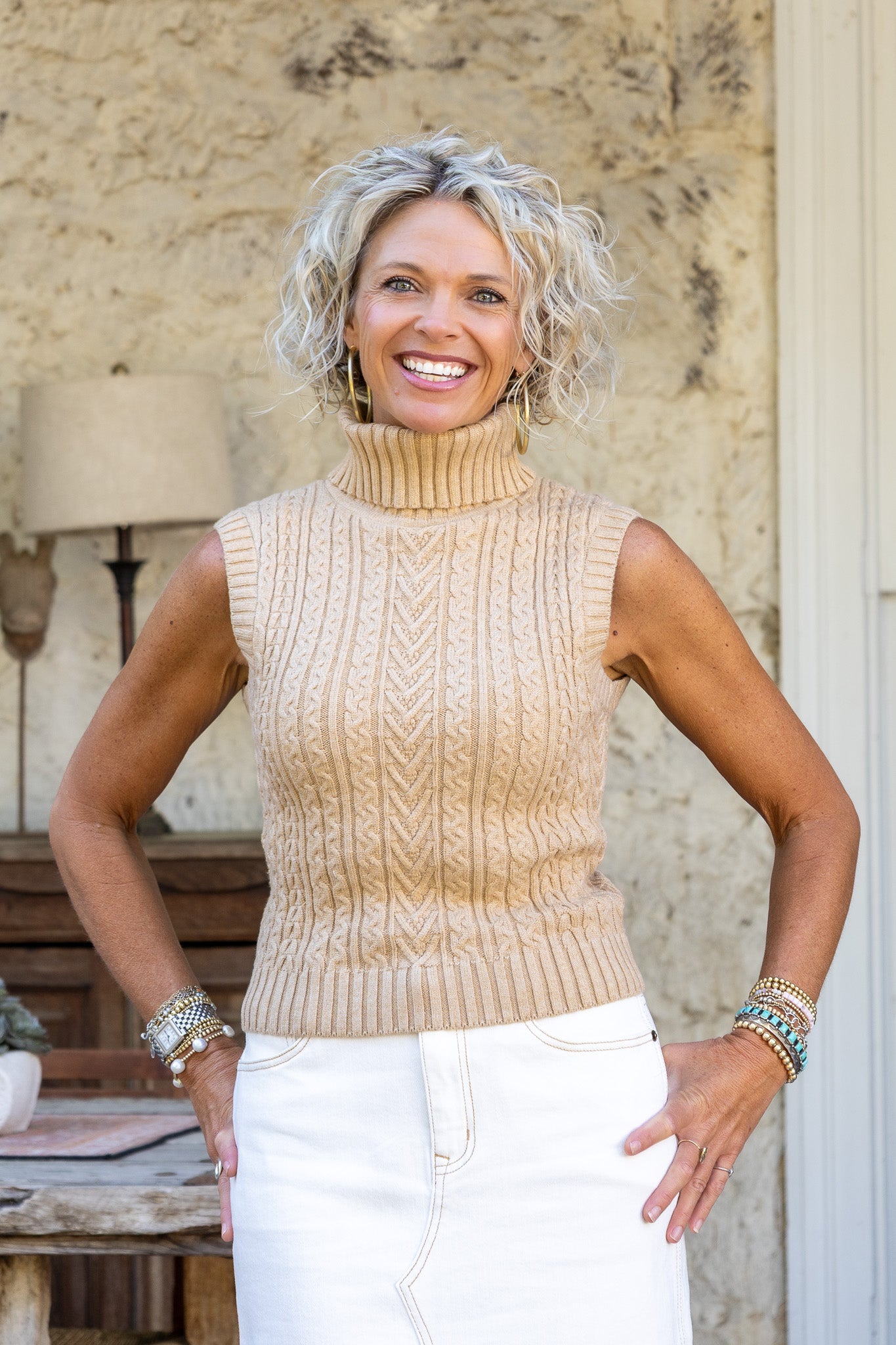 Cozy up with a twist in this tan cable knit mock neck sleeveless sweater! Perfect for layering or shining on its own, it adds a fun, textured touch to your outfit while keeping things comfortably cool. Whether paired with your favorite jeans or a cute skirt, it’s your new go-to for effortless style with a playful edge.