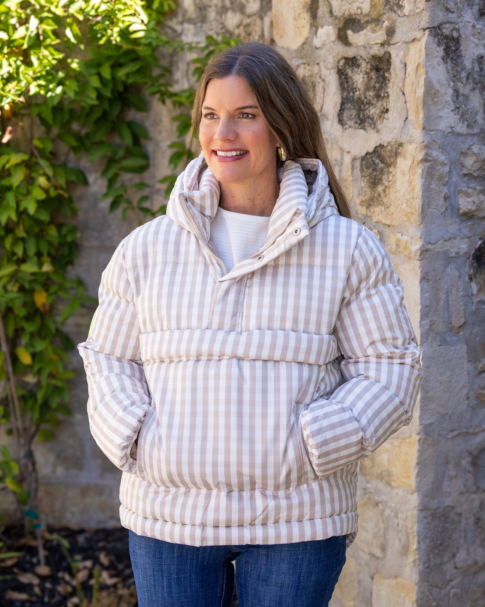 Stay cozy and cute in the Tan and White Gingham Puffer Pullover! Its classic checkered pattern adds a fresh twist to your cold-weather wardrobe, while the puffer design keeps you snug without sacrificing style. Perfect for layering on chilly days, this pullover effortlessly combines warmth and playful charm.