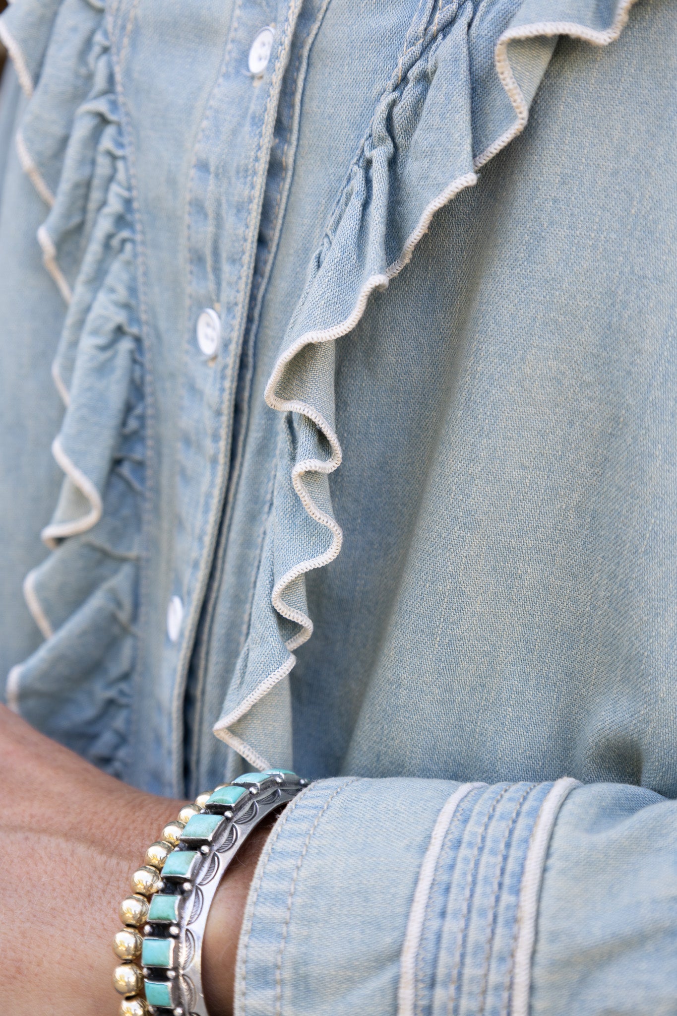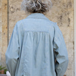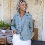Fluttering frills and crisp pintucks add texture and charm to this soft chambray shirt cut in a relaxed boxy fit.