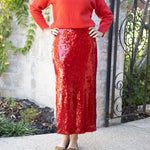 Slip into pure glamour with the Taylor Skirt—a show-stopping red sequin maxi that turns heads wherever you go. Covered in shimmering sequins from waist to hem, this stunner catches the light with every move, making you the star of any occasion.