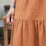 Embrace easy elegance with this terracotta maxi dress featuring subtle tonal black stripes for added charm. The playful spaghetti straps and square neckline create a flirty frame, while the tiered skirt adds movement and fun to your every step.