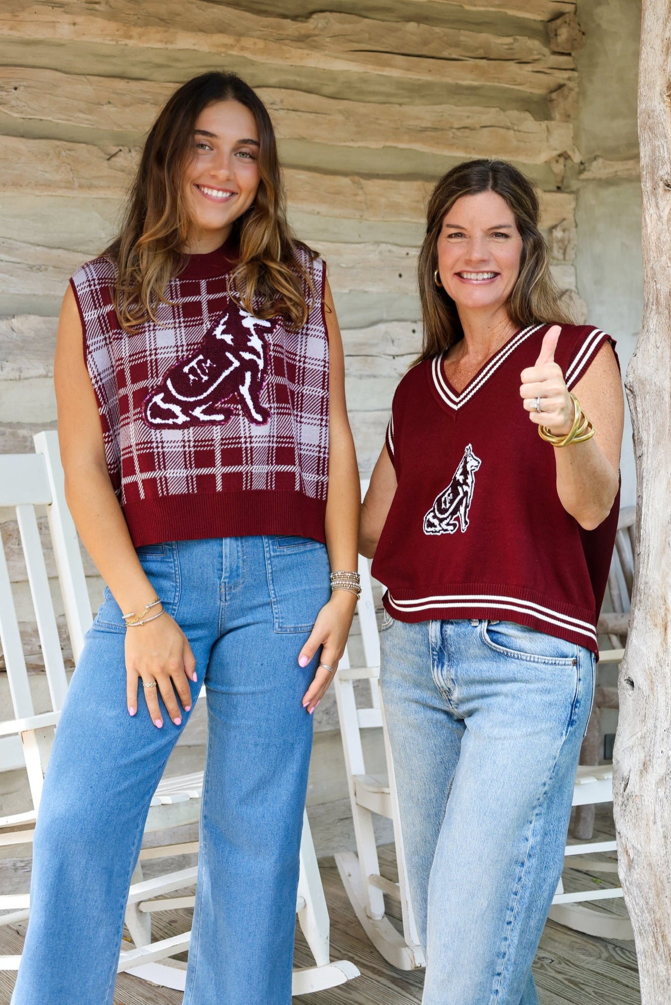 Score a home run with our Texas A&M plaid sweater Vest! This maroon and white sweater vest will keep you warm and stylish on those chilly days cheering on Texas A&M. Perfect for any casual outing or game day, this vest is a versatile addition to any wardrobe.