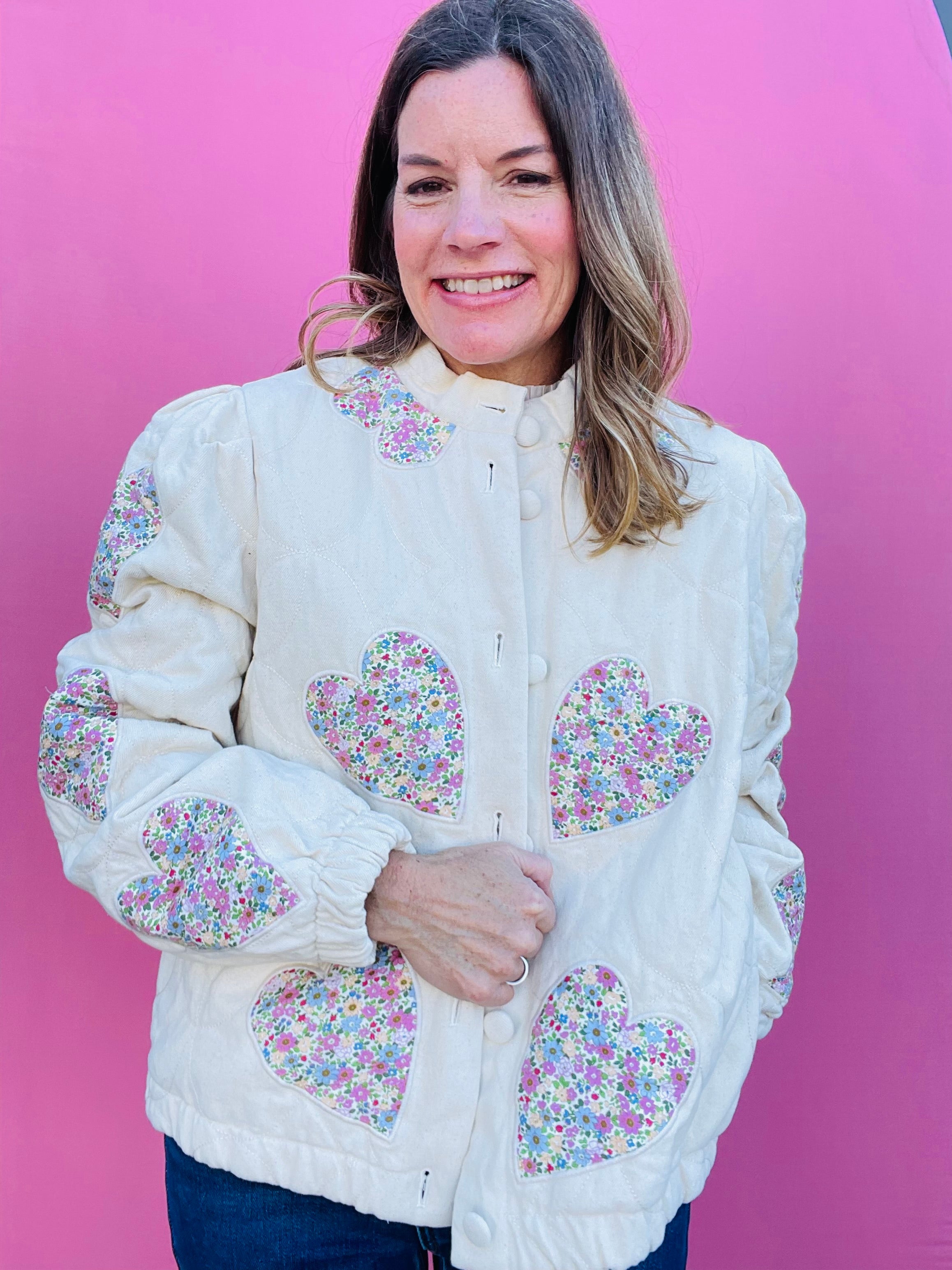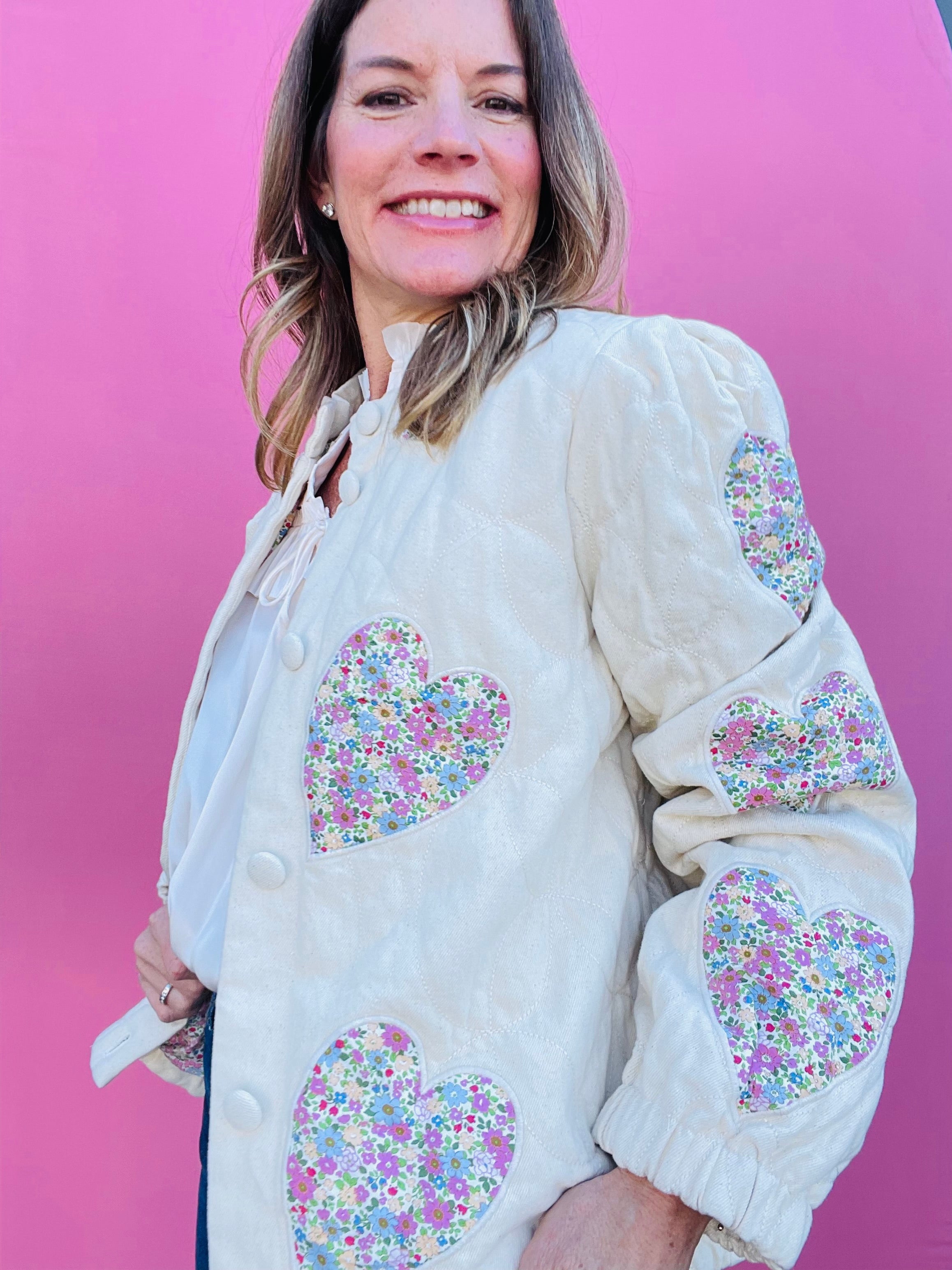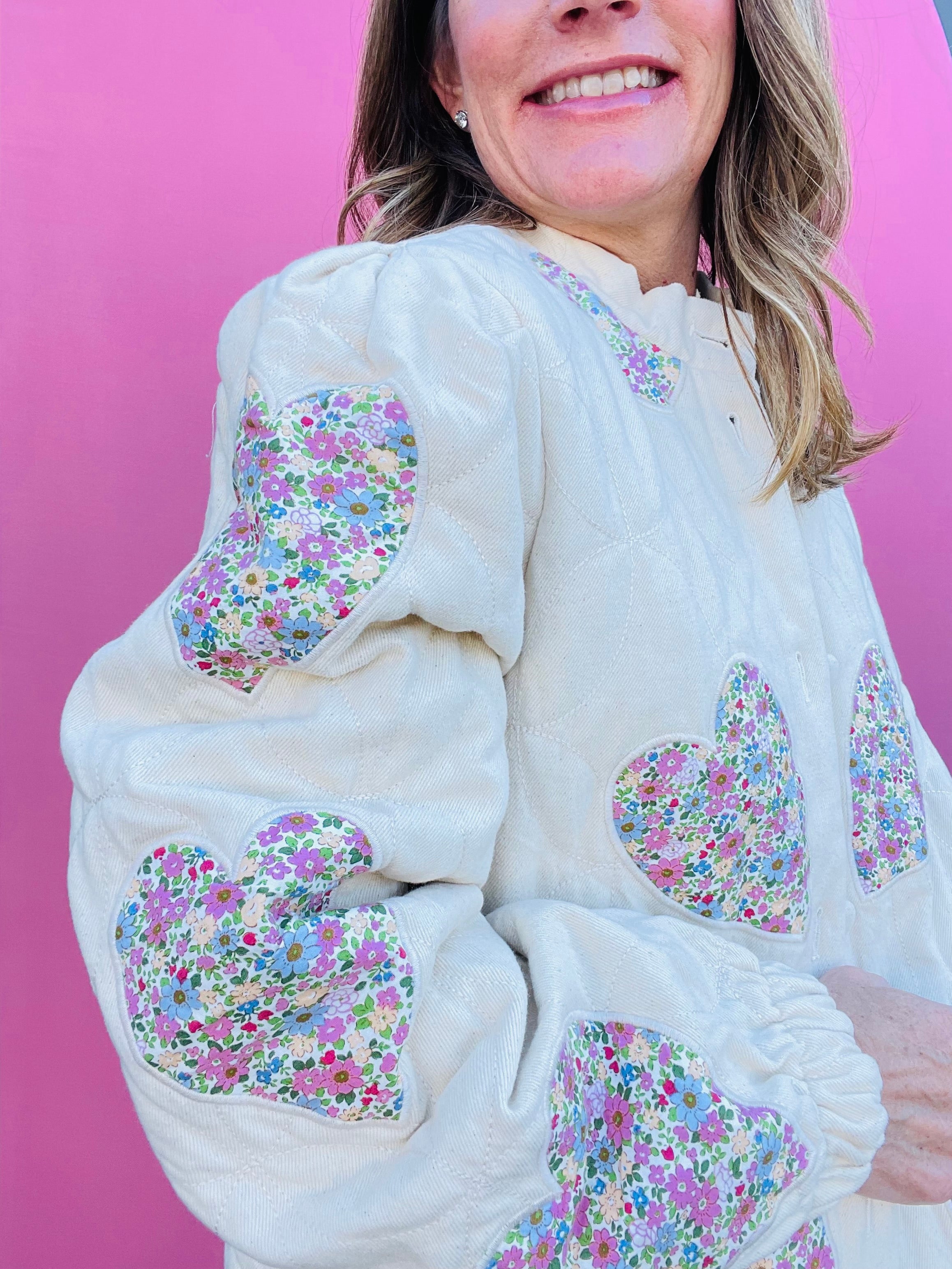 This timeless piece boasts delicate floral quilted hearts, adding a touch of romance to any outfit. Perfect for adding a touch of elegance and sophistication to your wardrobe.